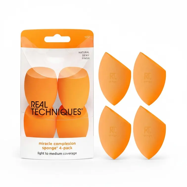The Real Techniques Miracle Complexion Sponge flawlessly blends liquid and cream products for a streak-free, luminous glow. It offers a natural, dewy finish with micro-fine pores for a seamless base. Best used with foundation, skin tints, and illuminators. The sponge uses RT's unique 3-point application technique for seamless blending.