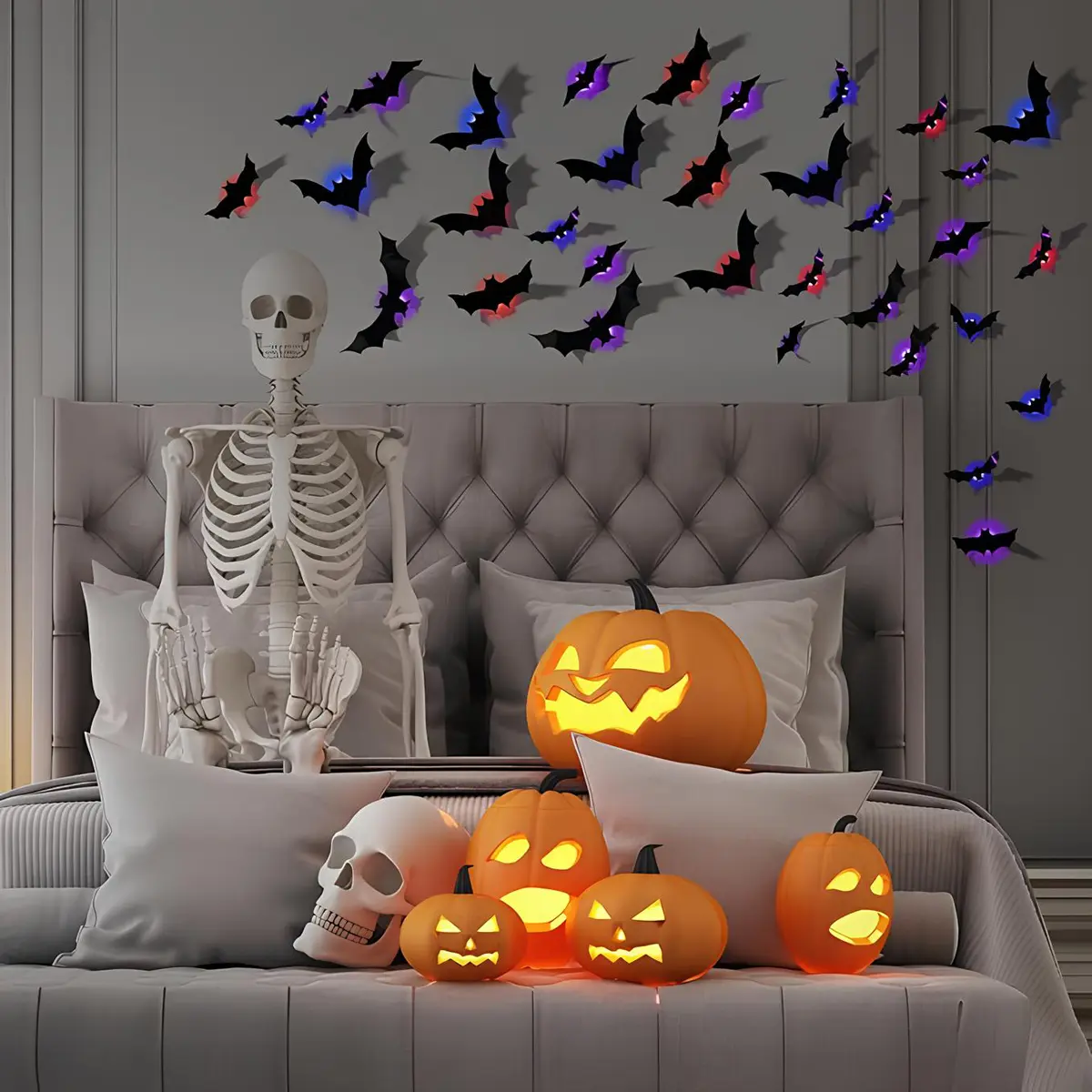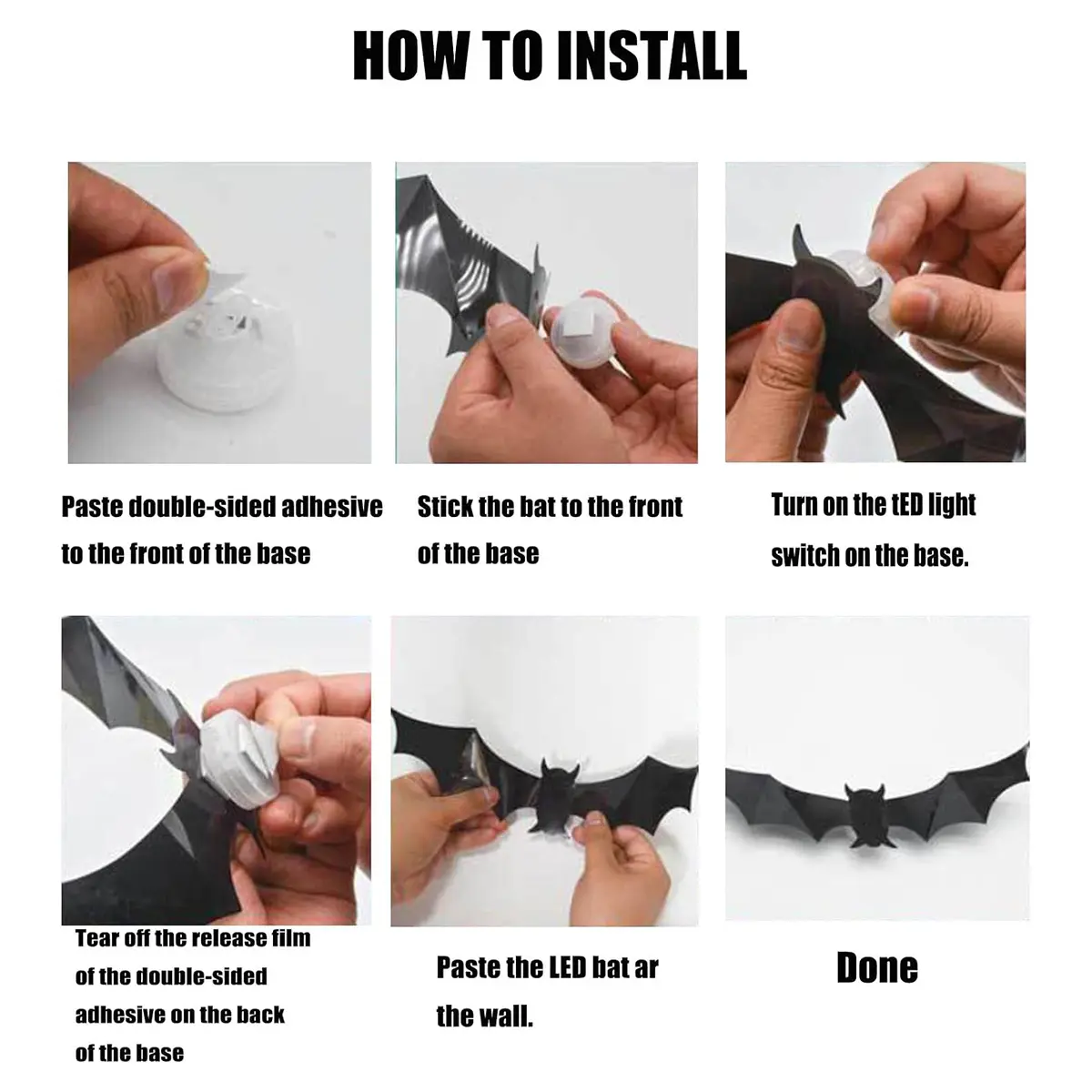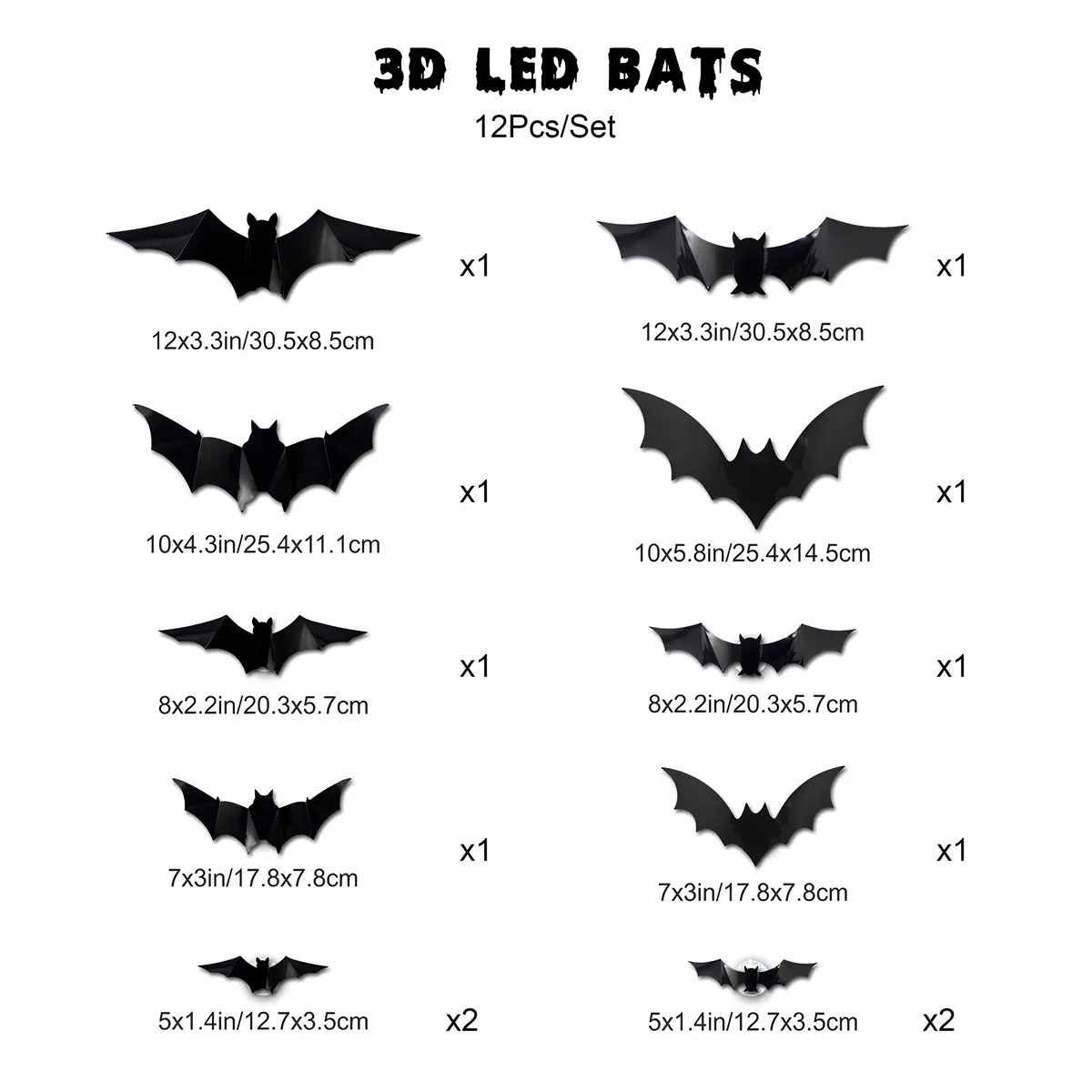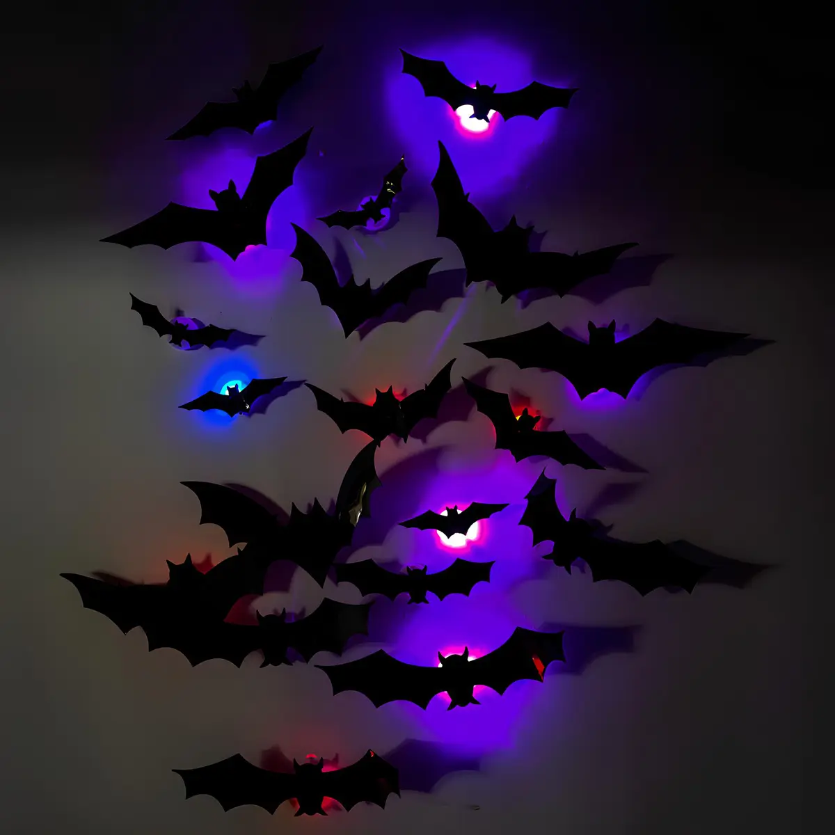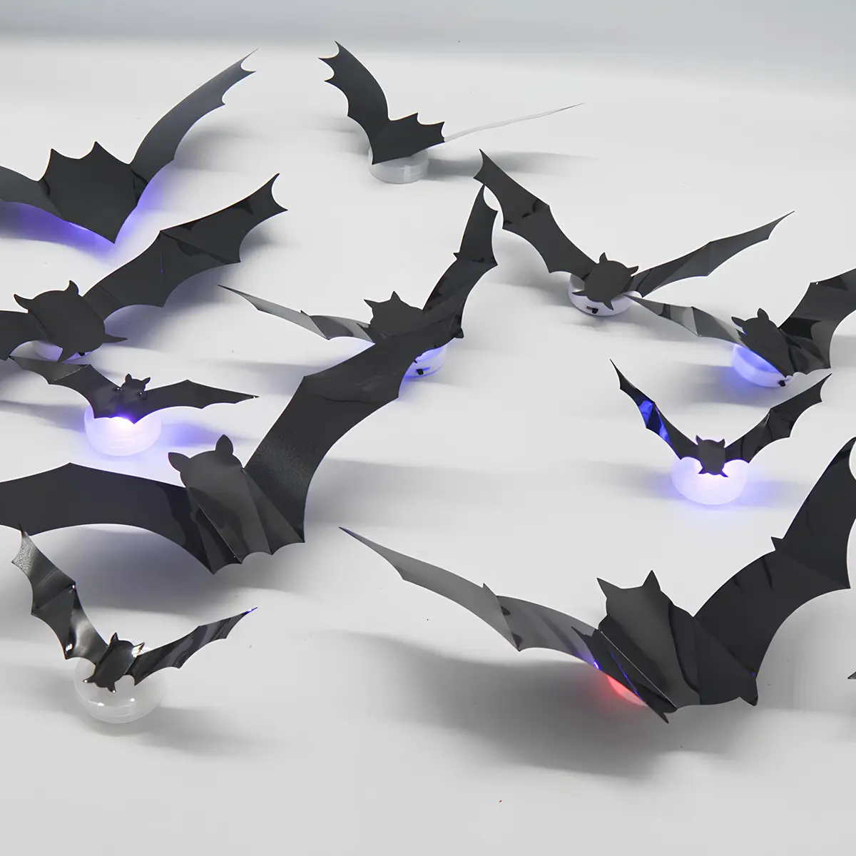 ·Halloween LED Bat Set: This set contains 12 black bats in various sizes and shapes. Unlike regular wall bat stickers, these luminous LED wall bats are more vivid, shiny, realistic, and eye-catching. The LED lights emit alternating red, purple, and blue flashes, making your house stand out in the dark.