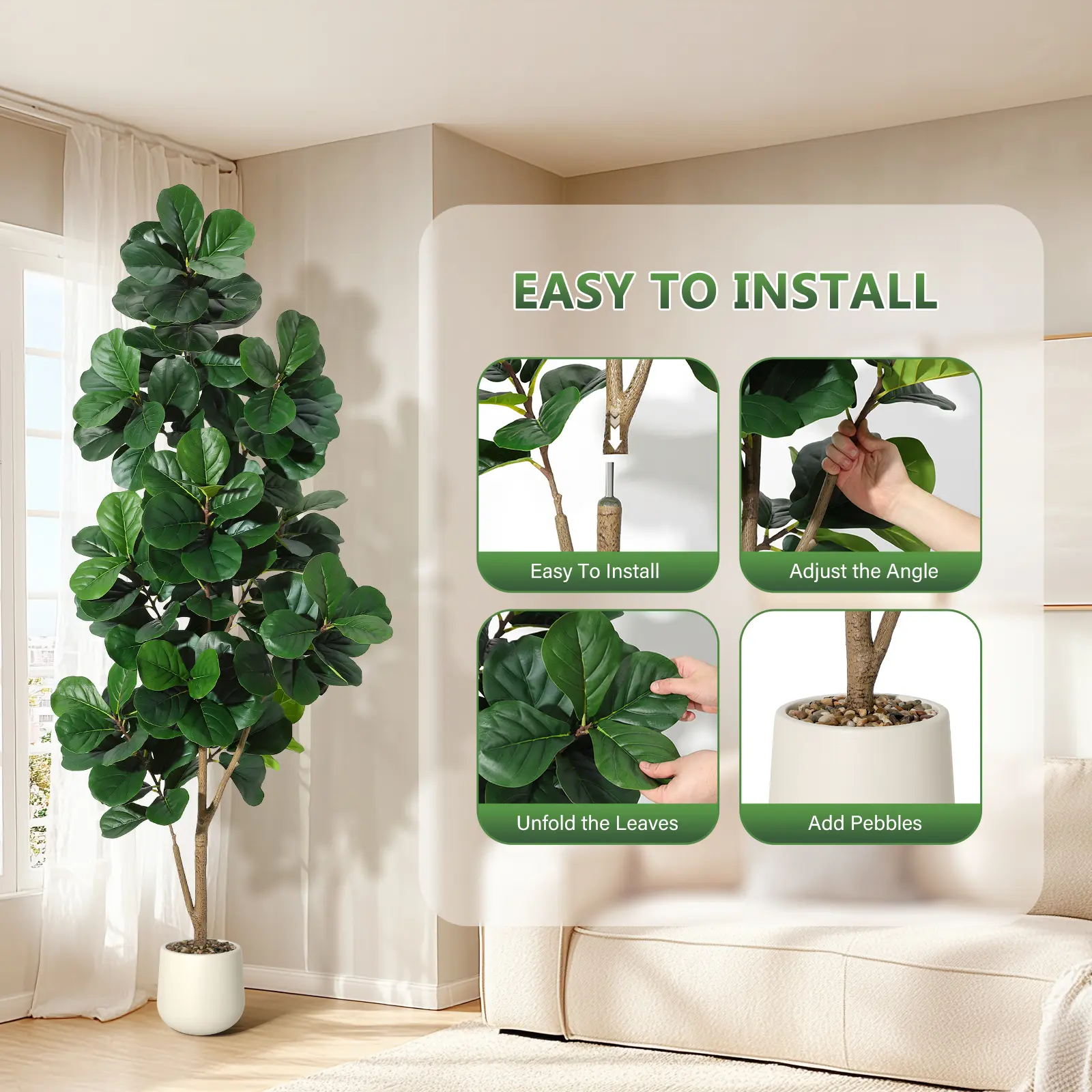 Realistic 7FT Faux Fiddle Leaf Fig Tree - This lifelike artificial ficus tree features a sturdy trunk with natural wood-grain texture and multiple branche . The high-density PVC+PE leaves maintain shape with reinforced stems to prevent drooping. Each
