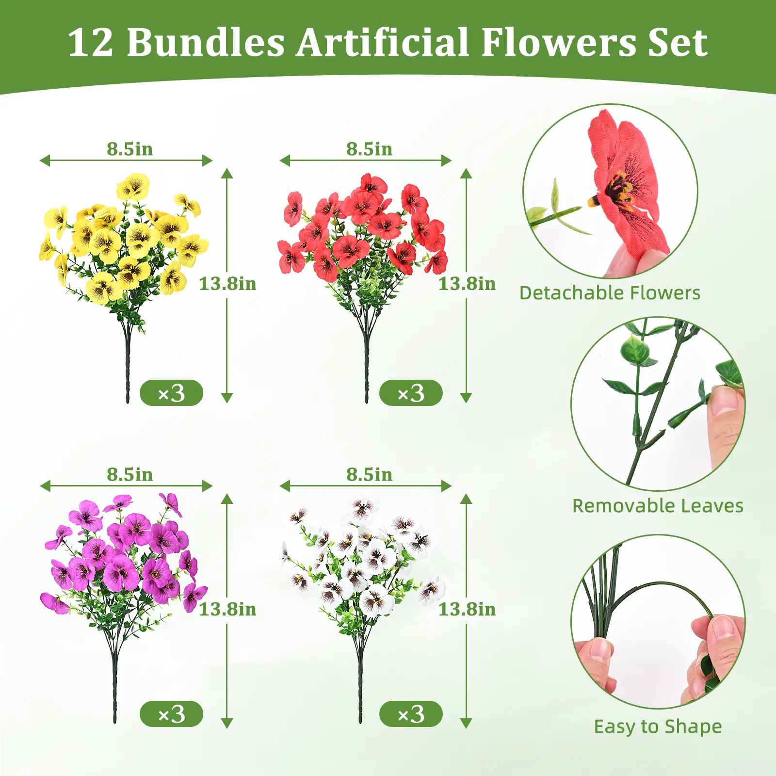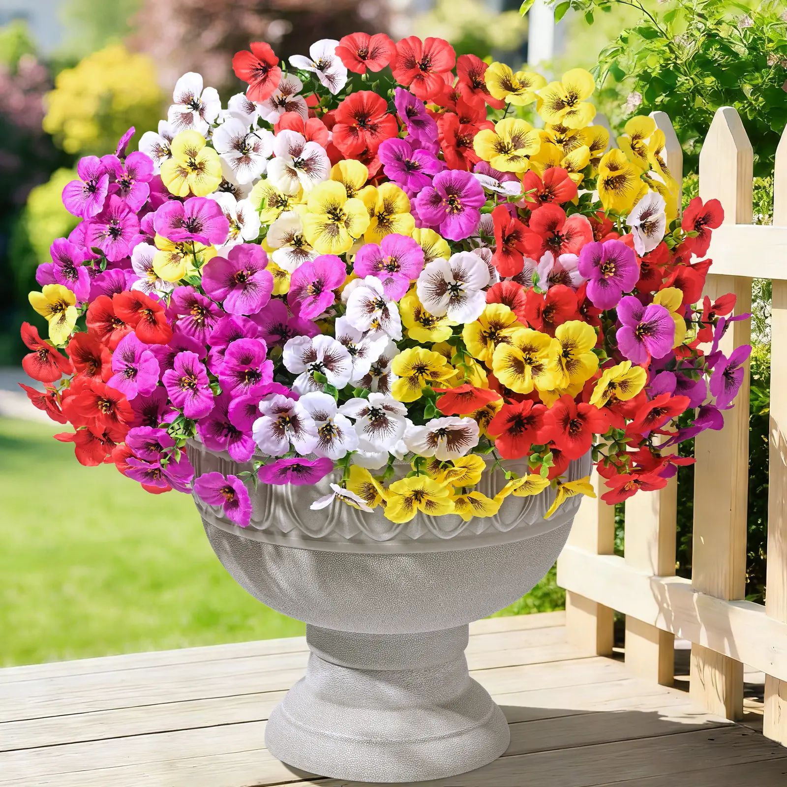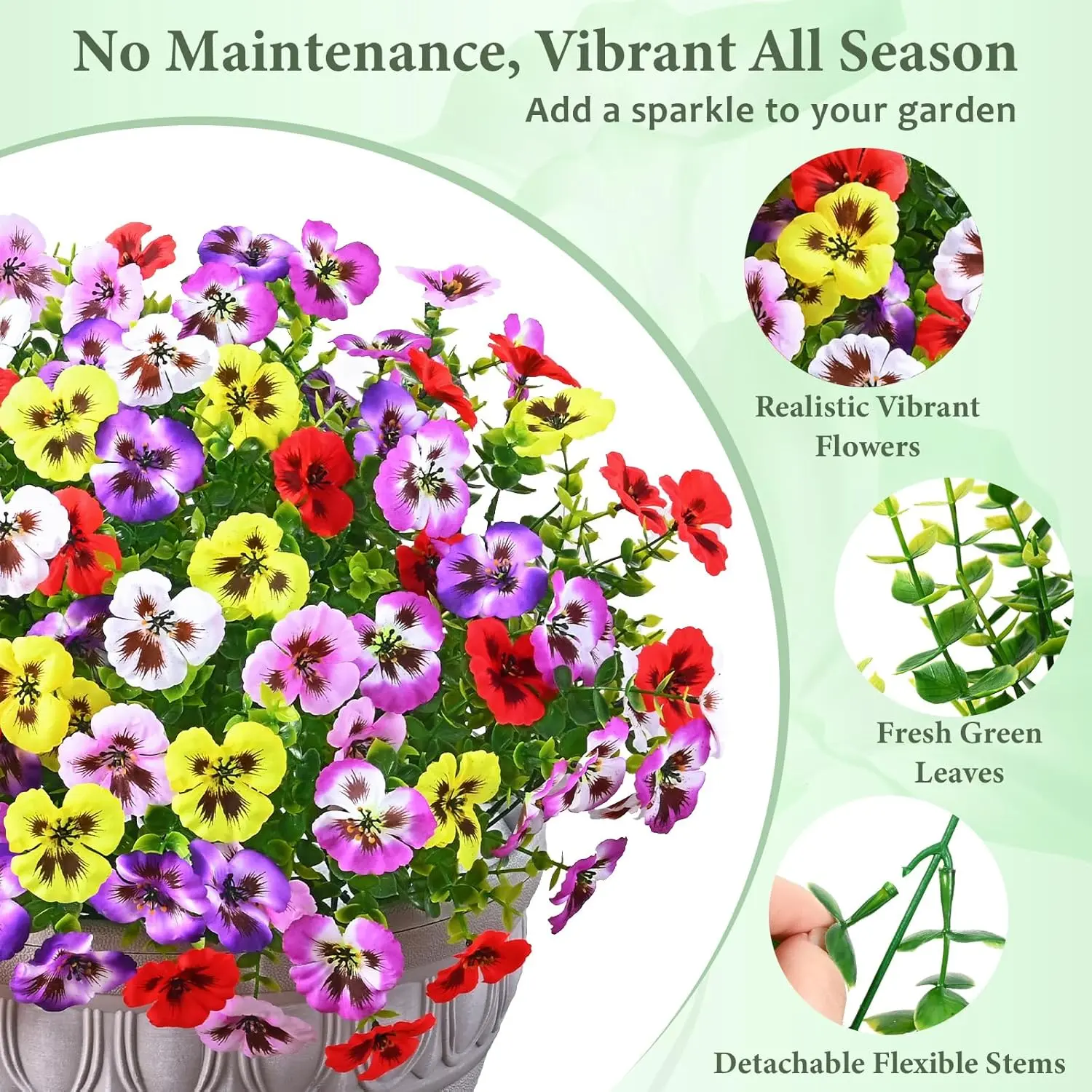 Are you looking for the perfect decor for your garden? Our artificial flowers for outdoors combine high-quality materials with exquisite craftsmanship, achieving an astonishing level of natural realism. The innovative blend of pansy blooms with eucalyptus leaves adds more vivid colors and more natural and authentic texture to outdoor artificial flowers.