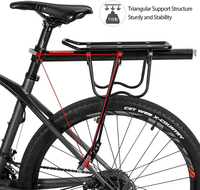 ·SOLID & STURDY: The Bicycle cargo rack made of high quality strength aluminum alloy, lightweight but strong and sturdy enough for bearing up to 115 lbs. Perfect for carry some stuff on your trip,work commute, even carry the people in short time.