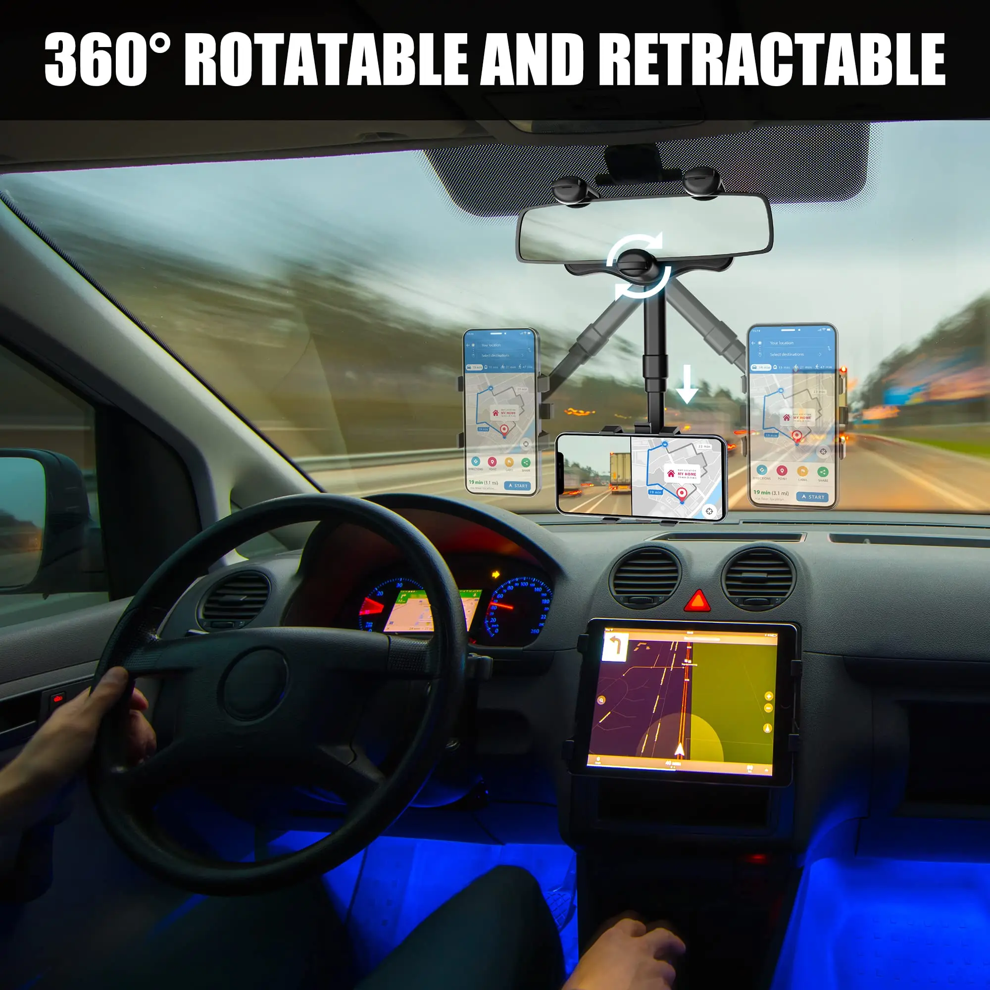 ·360-DEGREE ROTATION ADJUSTMENT: The arm length can be retractable by 0-5cm, and the angle can be rotated 360 degrees so that you can get the best viewing angle. It doesn’t block your view. In addition, it can be used for people at the co-pilot to watch videos, live stream, make video calls, etc. Selected premium ABS material with a mellow design, which is durable and has no deformation.