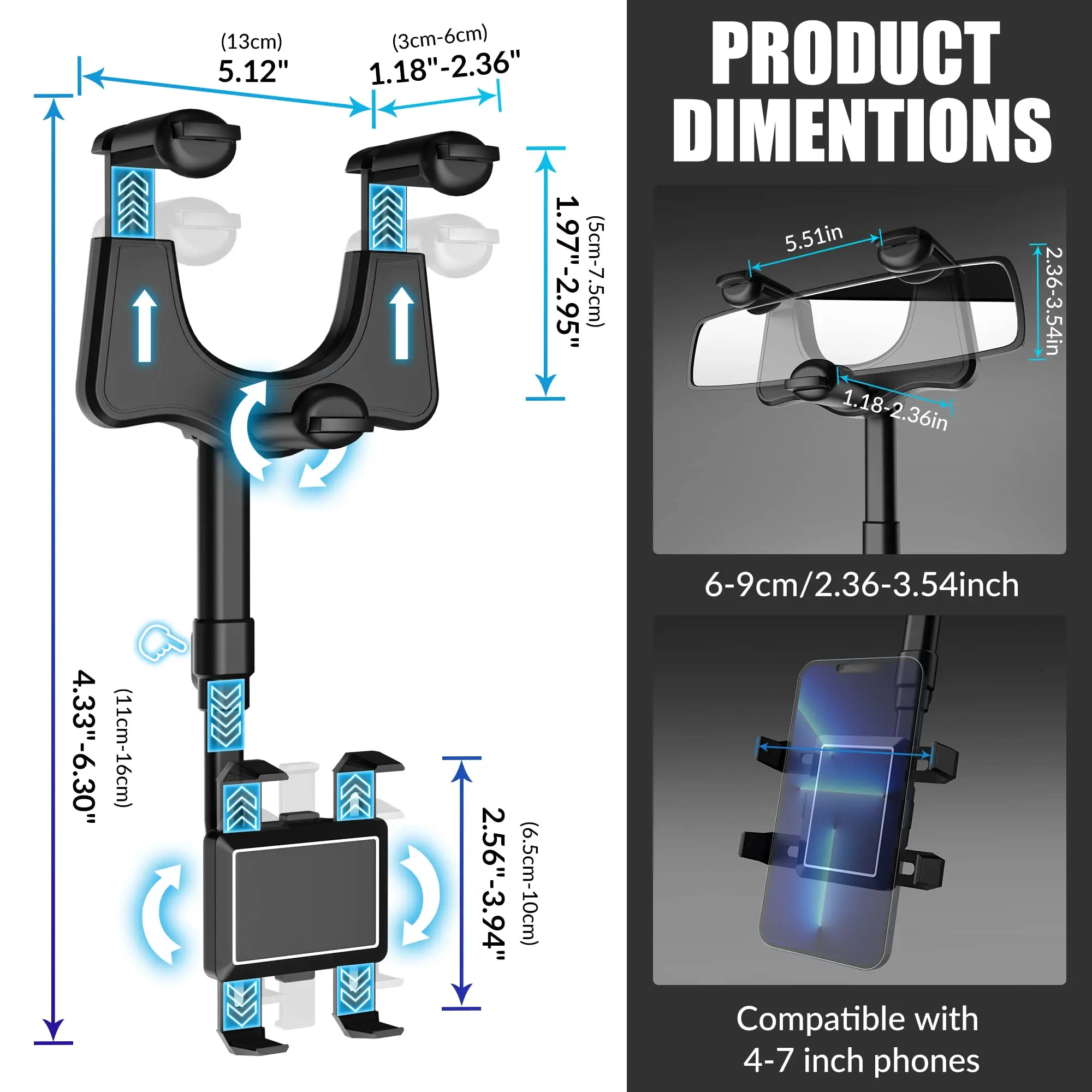 ·COMPATIBILITY TIP: Please check if it fits your rearview mirror size before purchase. Available for mirrors with a height of 6-9CM / 2.36-3.54 inches and a thickness of 3-6CM / 1.18-2.36 inches, the phone clip can be adjusted according to the width of the phone and is fit for any 4-7 inch phone