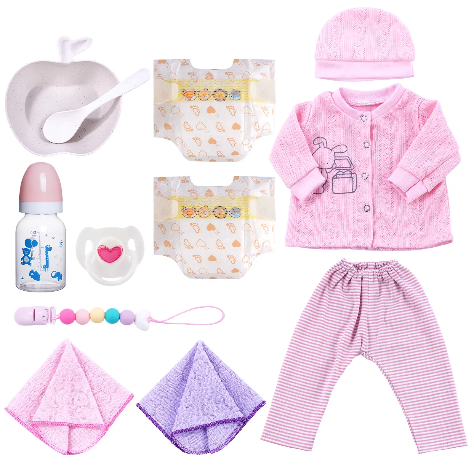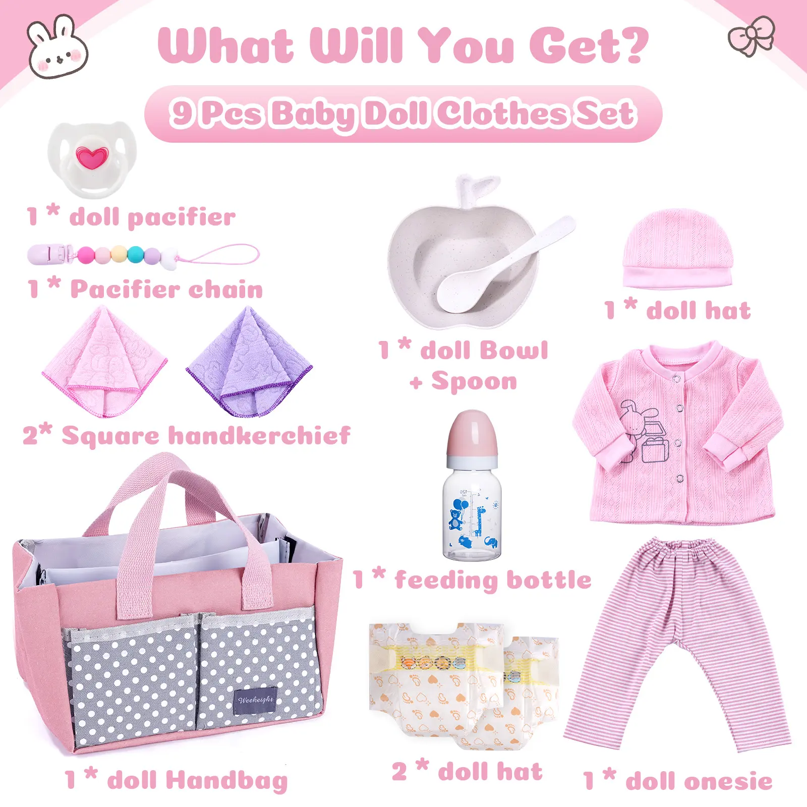 ✨ This 9 Pcs Reborn Baby Doll Clothes set includes a bassinet, designed for 17-22 Inch baby dolls. It's a delightful addition to any baby doll accessories collection. The outfit fits reborn baby dolls, making it ideal for pretend play. Perfect for Mother's Day, Valentine's Day, Children's Day, and Christmas. 🎄