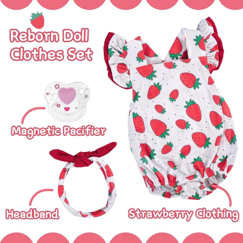 BABESIDE 3-Piece Reborn Baby Doll Clothing Set for 17-22 Inch Dolls Baby Doll Outfits & Accessories Clothes for Dolls with Strawberry Pattern Perfect for Reborn Doll Dress-Up Play Christmas Gift