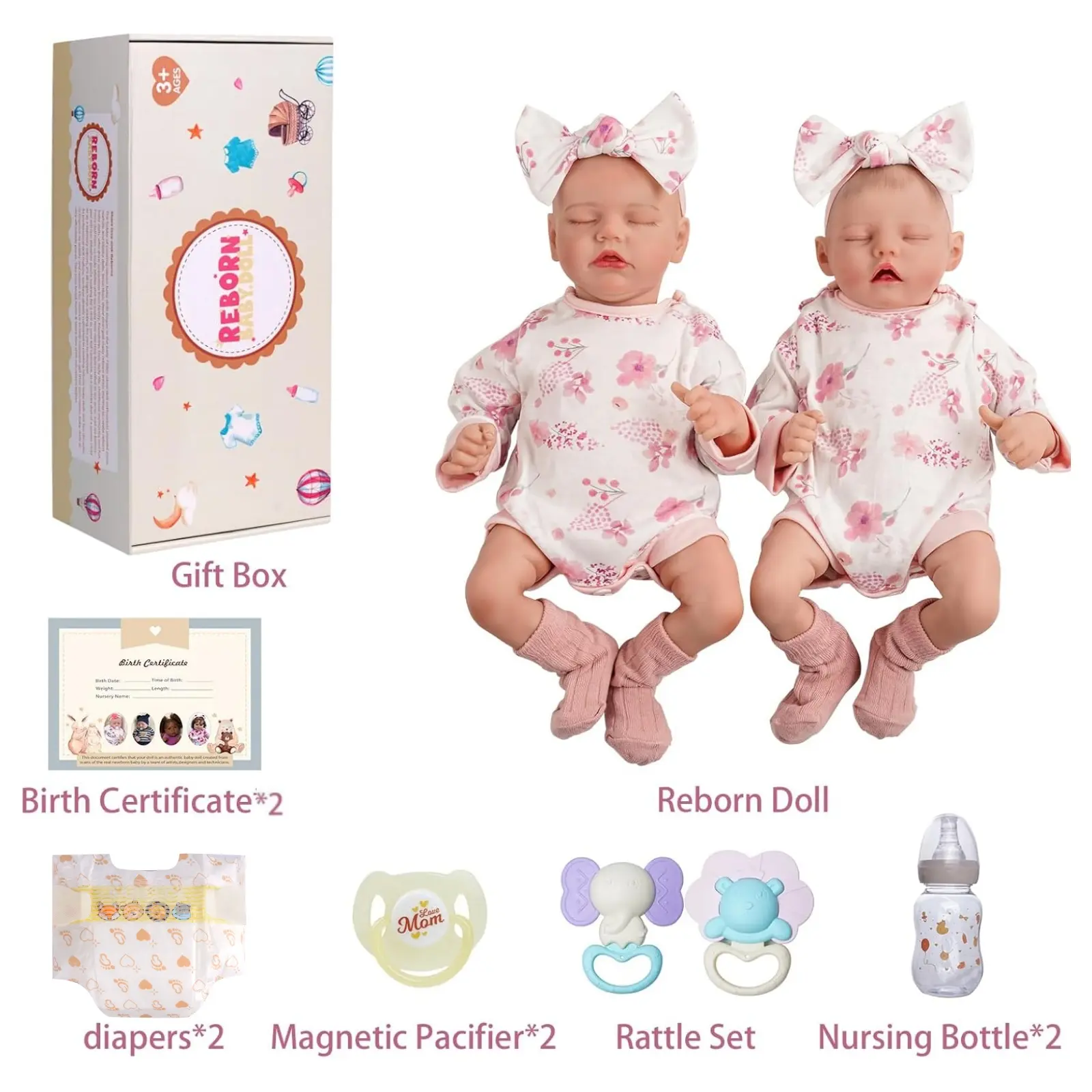 BABESIDE twins Reborn Baby Dolls, 17-inch realistic newborn baby dolls, are ideal for Christmas and New Year's gifts. This collectible set includes a gift box, two reborn dolls, hand-cranked bells, magnetic pacifiers, baby bottles, birth cards, and diapers. Perfect for kids age 3+.