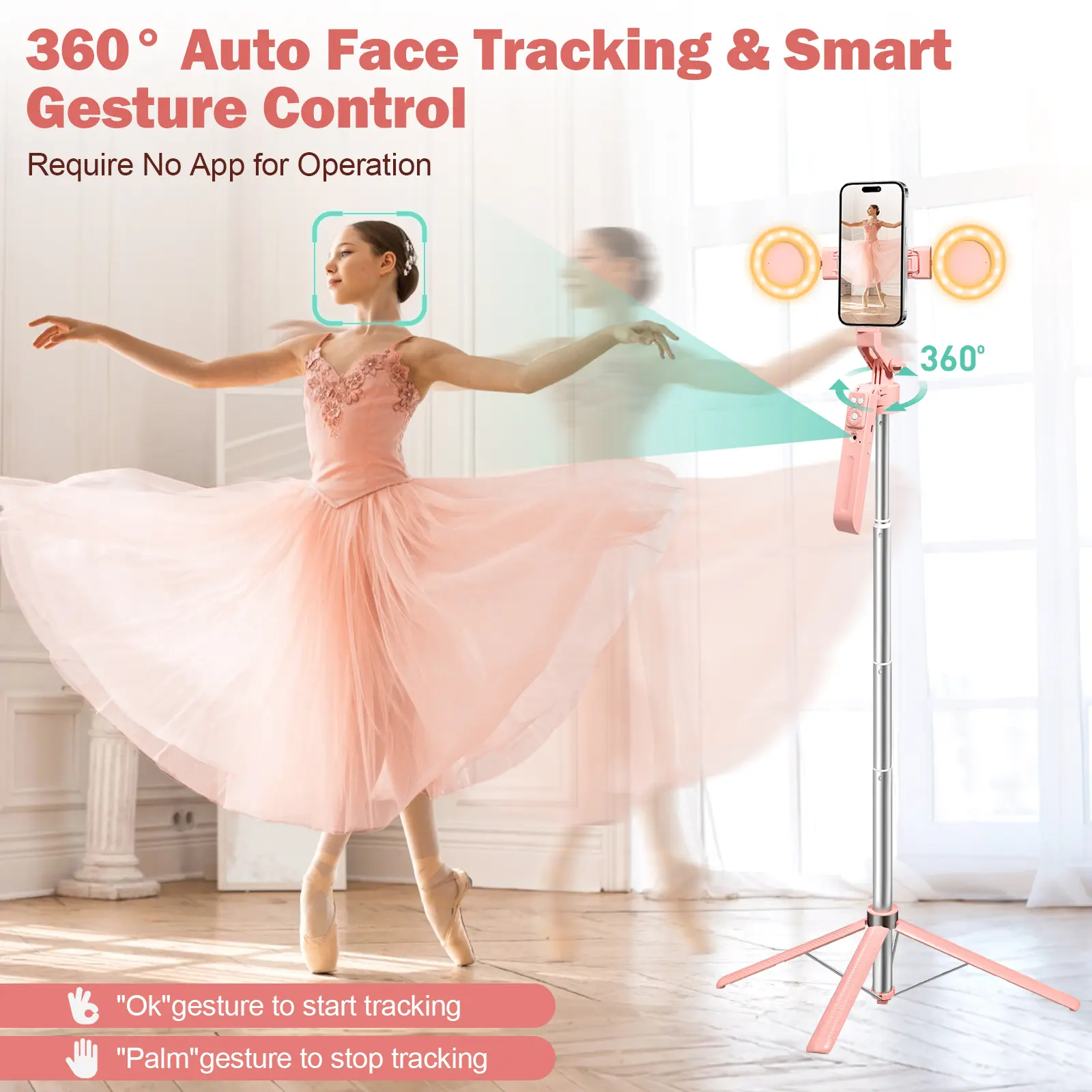 【Gesture Control Tracking Function】With intuitive gesture control, hold the "OK" gesture for 2 seconds to start tracking, and hold the "Palm" gesture for 2 seconds to stop tracking. Perfect for TikTok live streams, YouTube vlogs, and video calls, keeping you centered in the frame at all times.