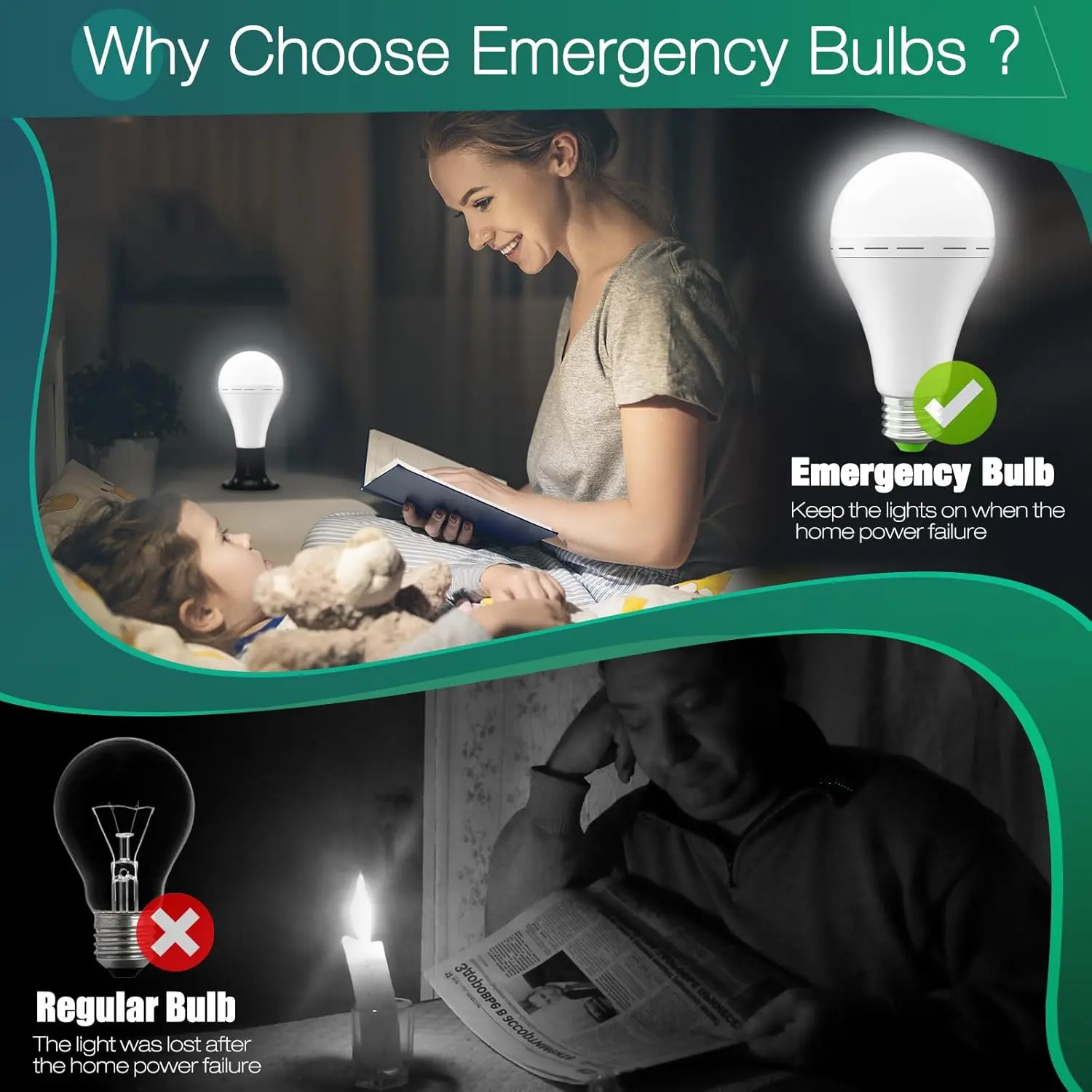 Rechargeable Light Bulb: Our emergency light bulb works as normal LED bulbs, and can be recharged and save energy by itself in daily use. During the home power failure, emergency light bulb automatically turns on. It can light up for to 3-5 hours.