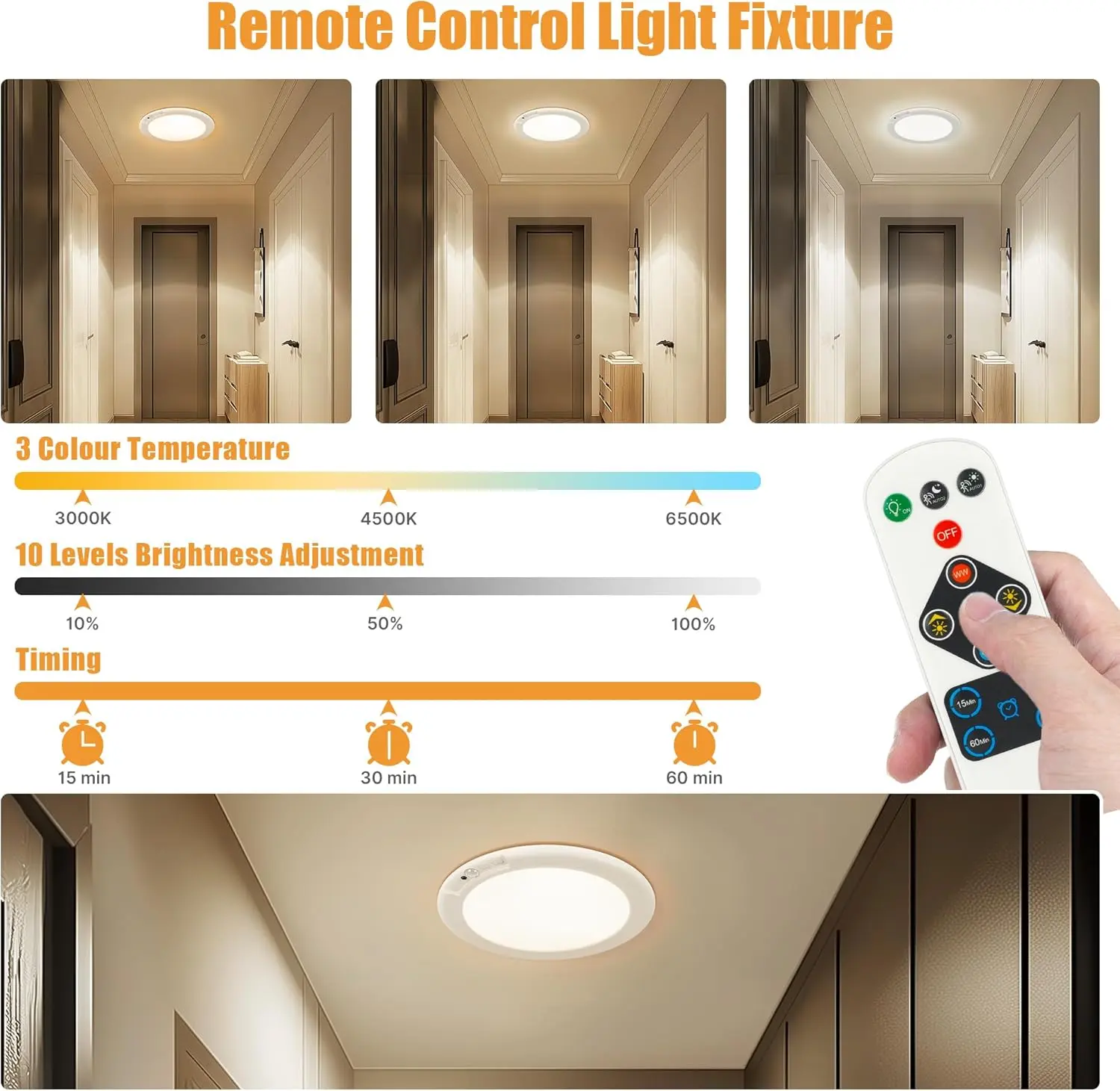 ·3 Color Temperatures & Dimmable Brightness: Choose your lighting color from Warm white 3000K, Natural white 4500K, Daylight white 6000K, and adjust brightness between 10%-100%. Easy lighting selection of the ceiling light with a push button or remote control. The ceiling light with remote has a timing function to save power consumption, illuminate your space with lower energy consumption.