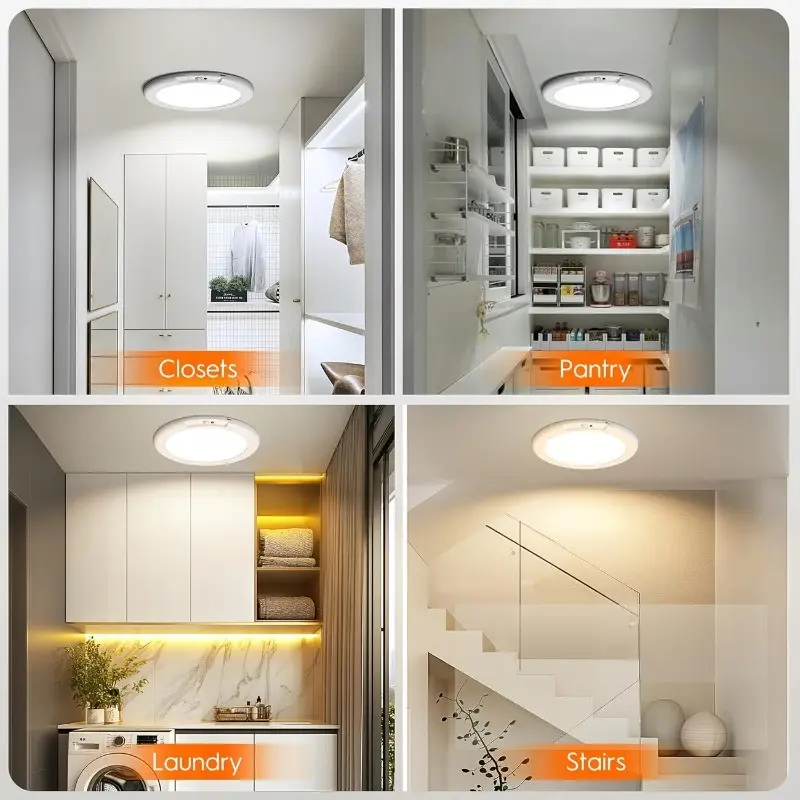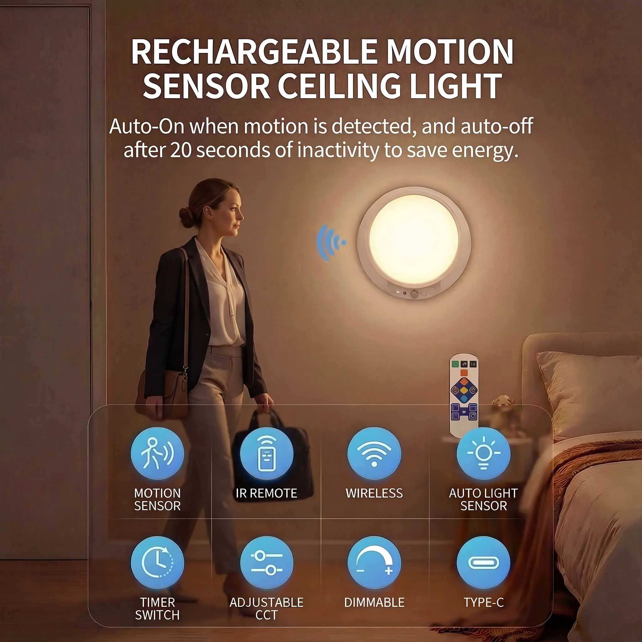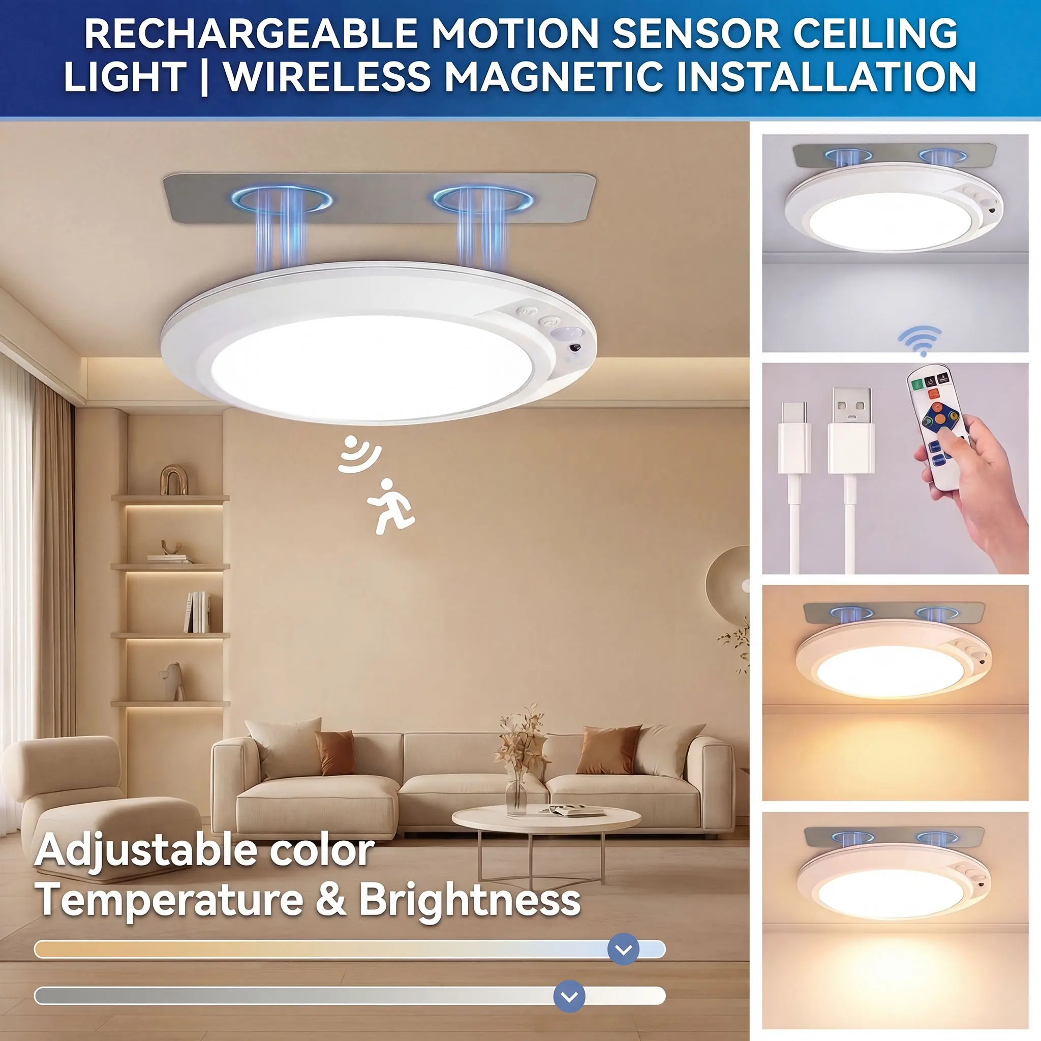 Rechargeable Motion Sensor Ceiling Light with Remote - Magnetic Wireless Ceiling Light Battery Powered for Closet Shower Stairs Shed Hallway Porch Patio ect,Suitable for various scenarios, easy to install.