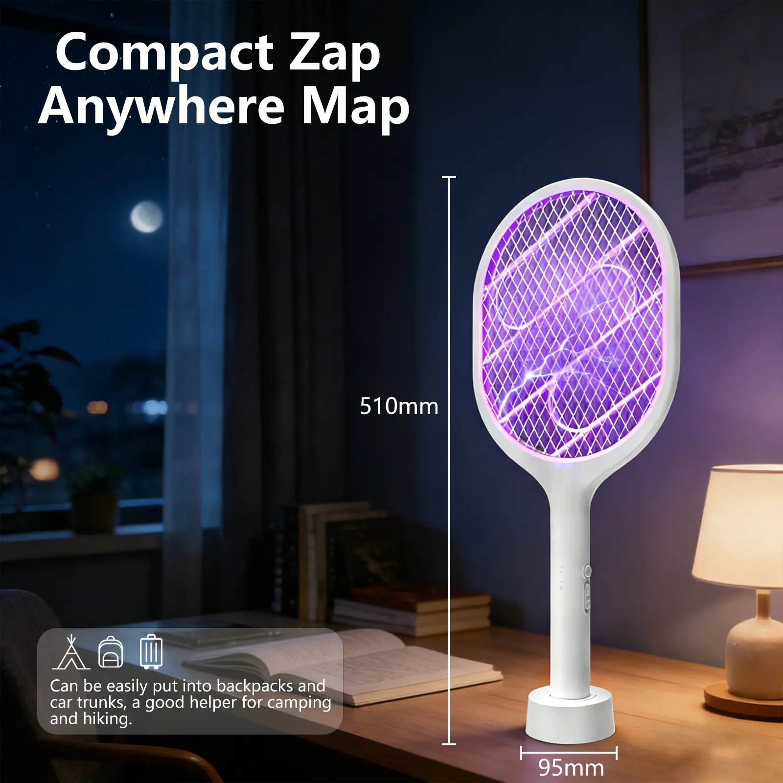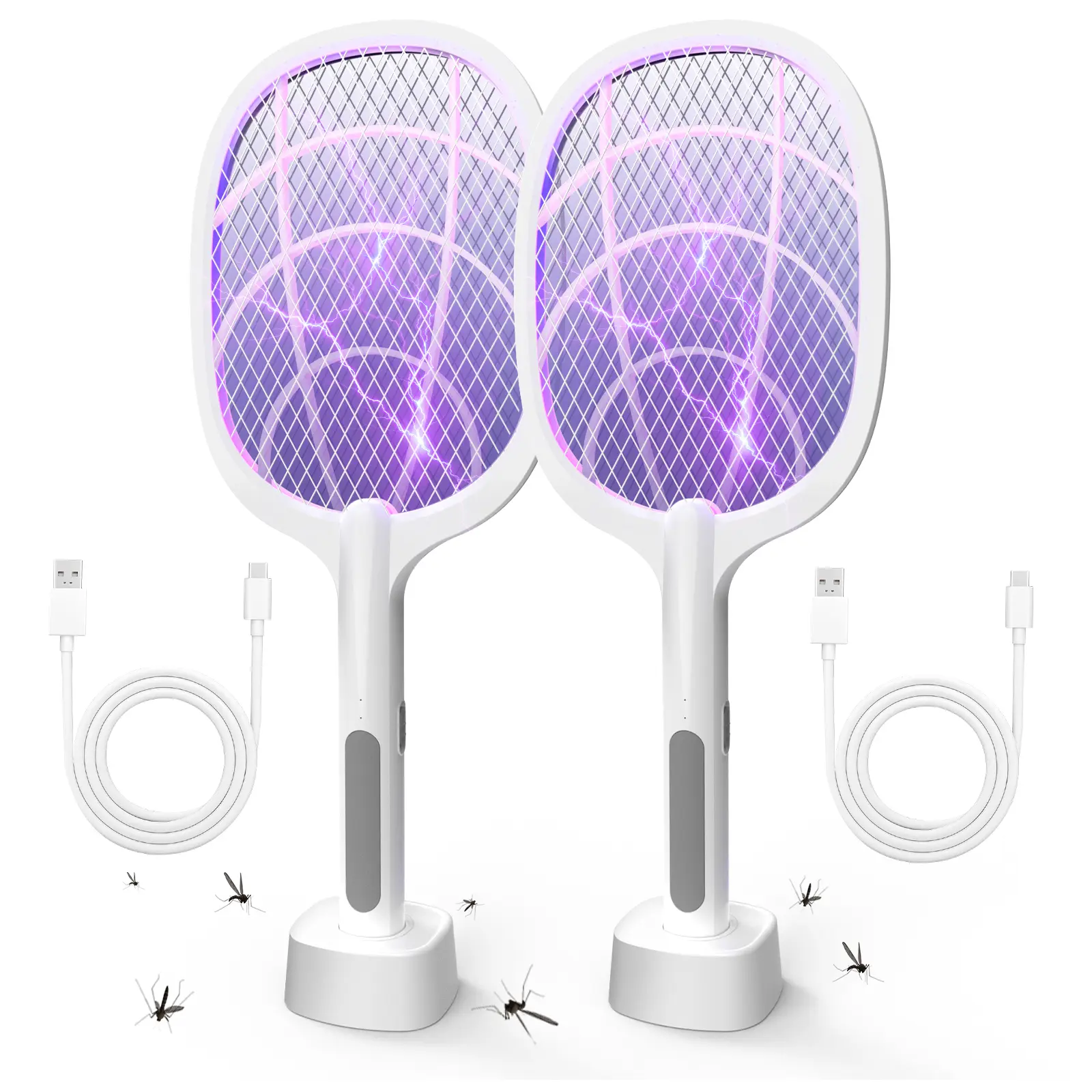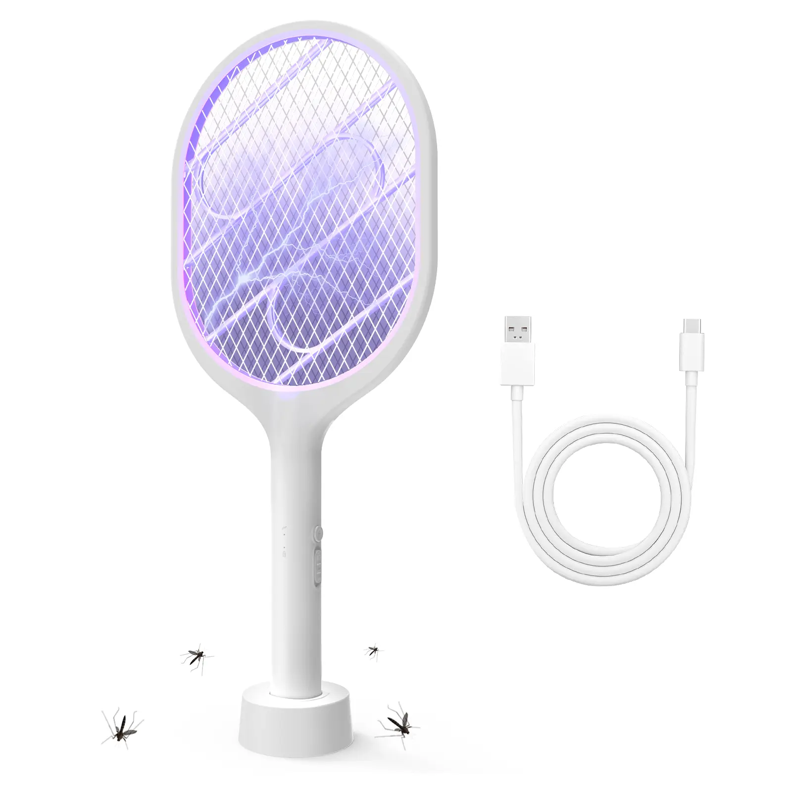 ·2-in-1 Bug Zapper & Racket – Manual Mode ("ON1"): Press the grey button to use as a handheld electric swatter. Avoid touching the grid immediately after use to prevent residual shock. Auto Mode ("ON2"): Place it on the base to activate a purple lure light that attracts and kills mosquitoes. This mode operates quietly, ideal for nighttime use. Also effective against fruit flies, gnats, and other small pests.
