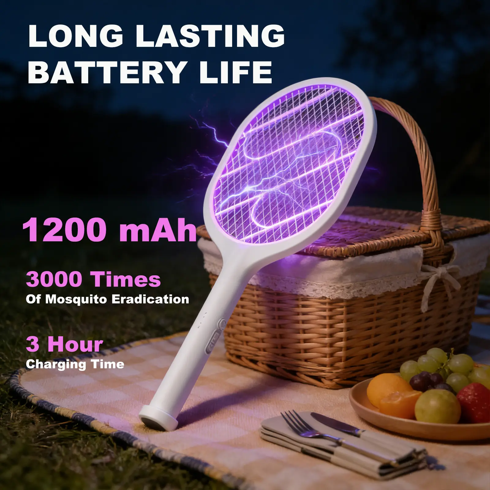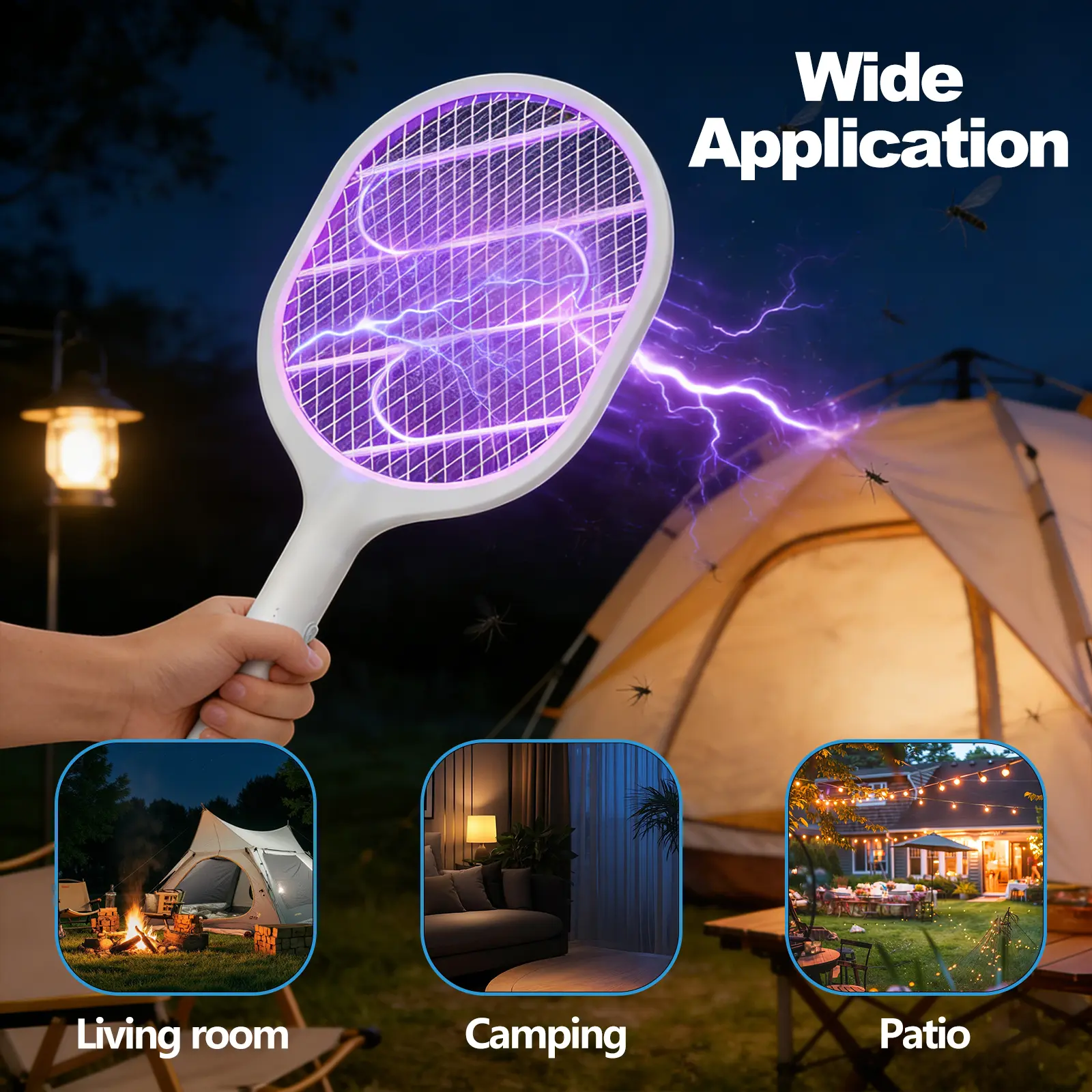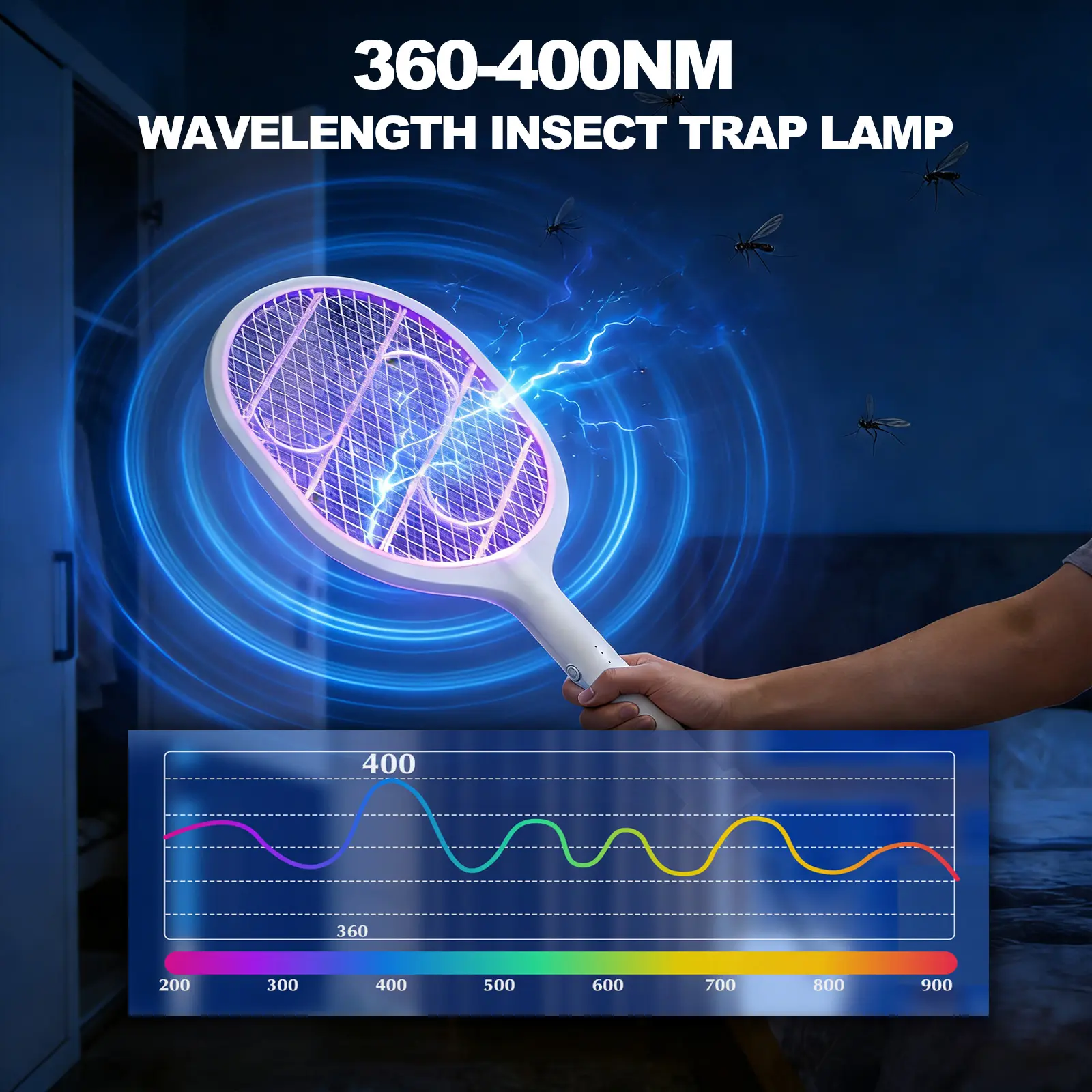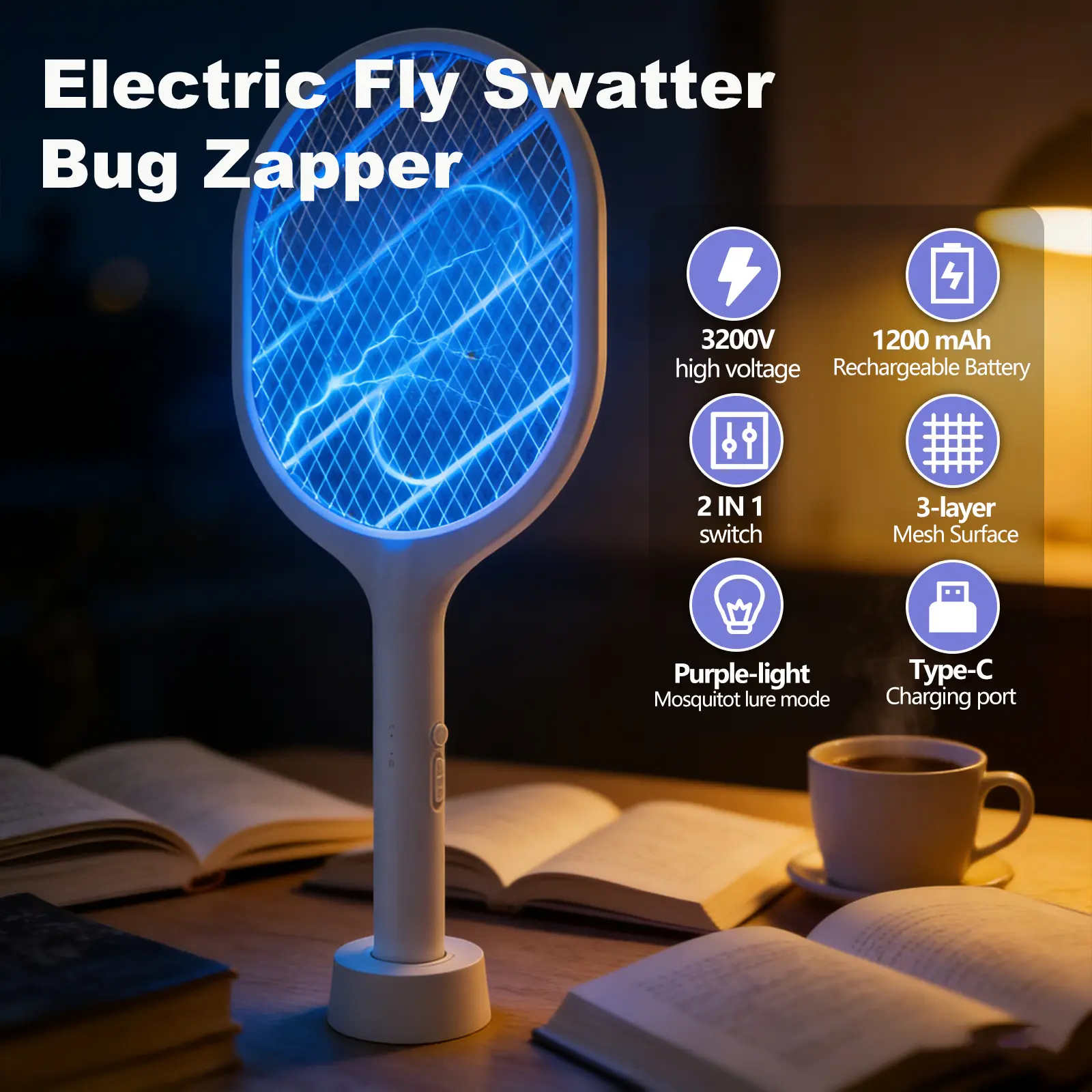 ·2-in-1 Bug Zapper & Racket – Manual Mode ("ON1"): Press the grey button to use as a handheld electric swatter. Avoid touching the grid immediately after use to prevent residual shock. Auto Mode ("ON2"): Place it on the base to activate a purple lure light that attracts and kills mosquitoes. This mode operates quietly, ideal for nighttime use. Also effective against fruit flies, gnats, and other small pests.