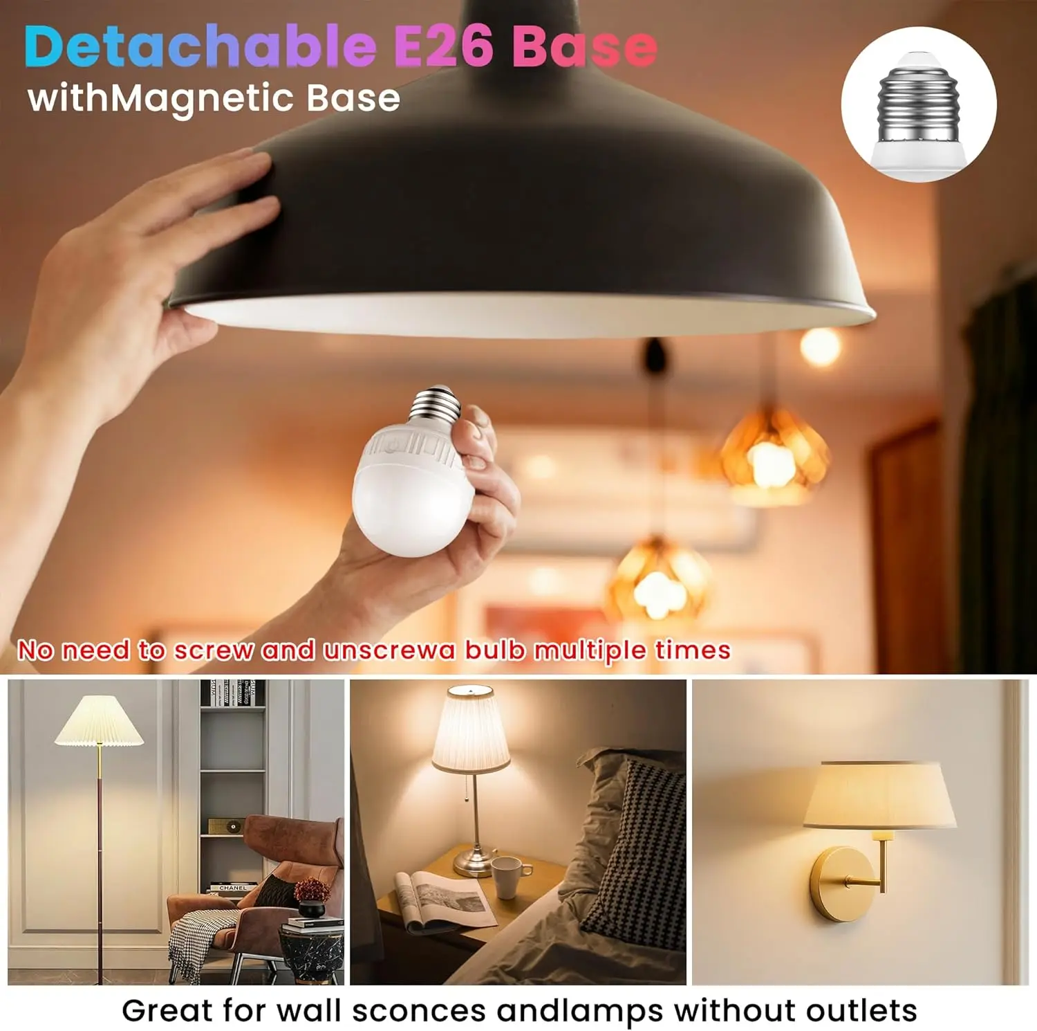 The E26 Rechargeable LED Light Bulb is a versatile, dimmable, and energy-efficient lighting solution. It offers customizable lighting options and is suitable for both indoor and outdoor use. The included remote control and timer make it easy to operate and schedule lighting.