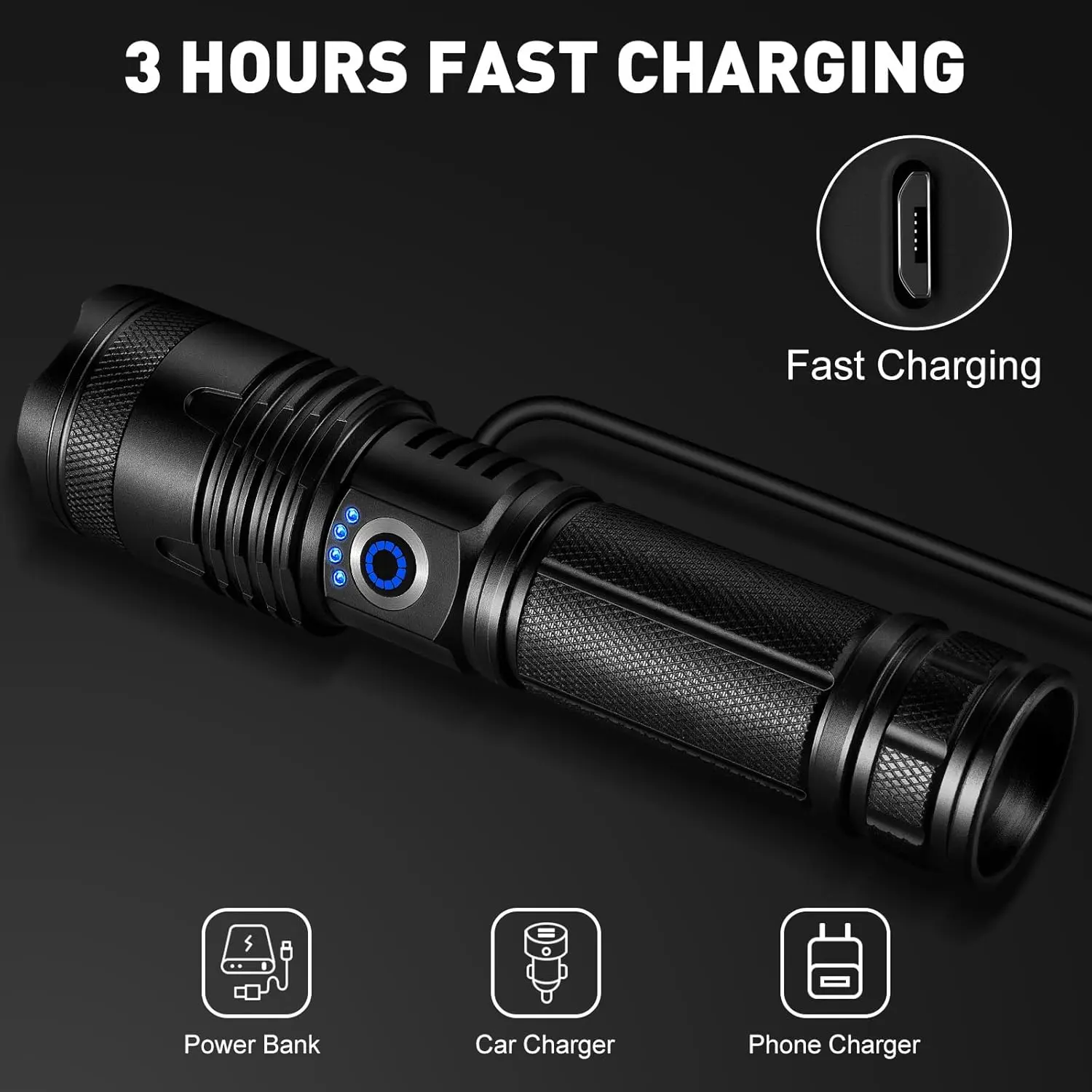 ·Long Running Time: This LED flashlight can provide strong illumination for long hours without dimming. It features a built-in USB charging port, compatible with outlets or any other USB devices, making charging convenient and fast. And four power indicators assist you to know the bÄttery level of the rechargeable flashlight.