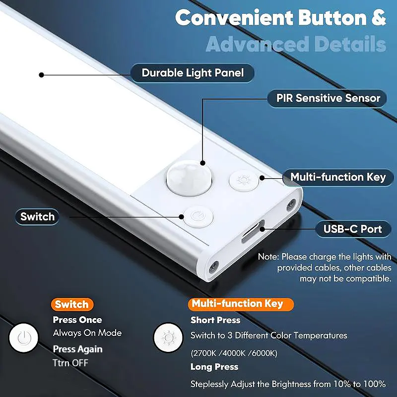 ·Ultra-thin Body: Adopting the ultra-thin design concept, the thickness of the lamp body is only 9 mm. Its extreme thinness and lightness enable it to easily fit various installation surfaces, such as wardrobes, kitchen cabinets, wine cabinets, shoe cabinets, entrances, figurine cabinets, display cabinets, bedrooms, corridors, passageways, drawers, etc. It doesn't take up too much space, adding a touch of simplicity and refinement to your home environment.