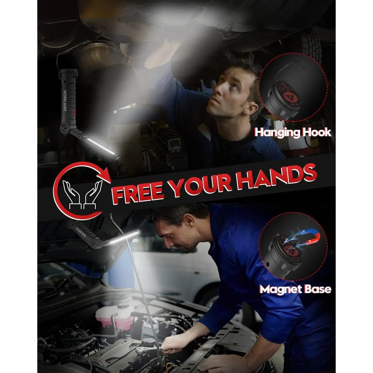 Illuminate your workspace with the Rechargeable Work Lights from Serene shoppe.These LED work lights come equipped with a magnetic base and hanging hook, making it easy to position them wherever you need.