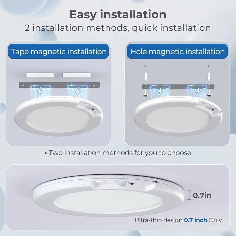 ·【Easy Installation Solutions】Choose between tape (smooth surfaces) or magnetic mounts (textured walls) for ultra-thin LED lights for room upgrades. The waterproof lights for shower withstand humidity, while the tool-free design lets you detach the wireless ceiling light fixture in seconds for charging.