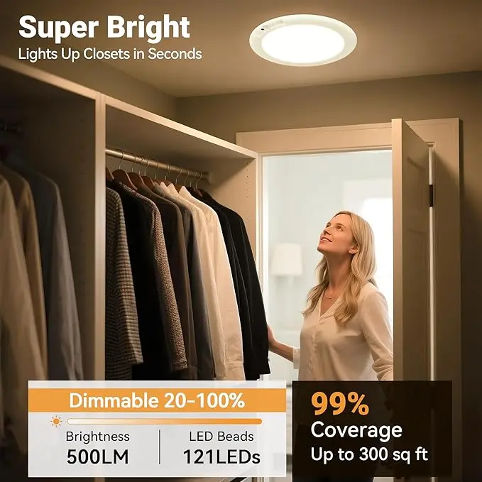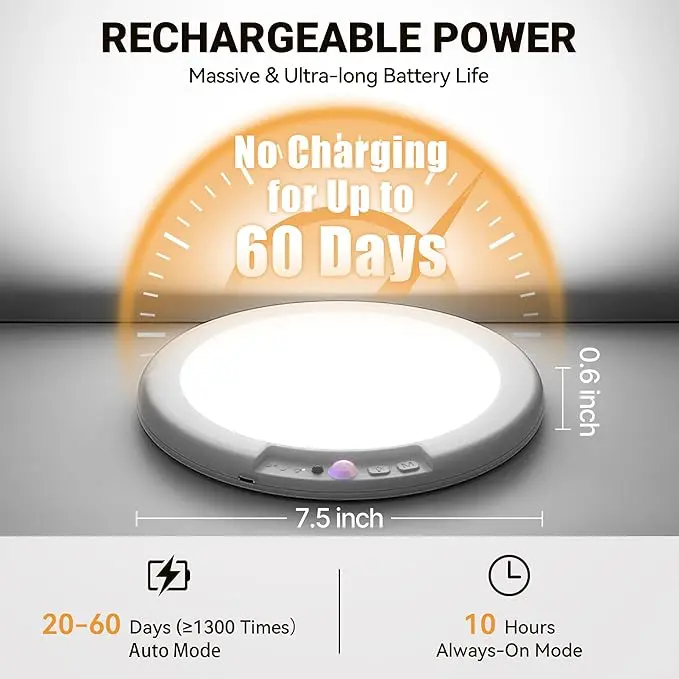 ·【Motion Sensor Auto ON & Remote Control Manually ON】The rechargeable light has two working modes! ① Sensor Mode: the motion sensor light will automatically come on when you are within 9-16 feet and turn off after 20 seconds of movement. ② Stay On Mode: When you need to stay for a long period of time, set the battery ceiling light to ‘ON’ mode and then turn it off with the remote control.