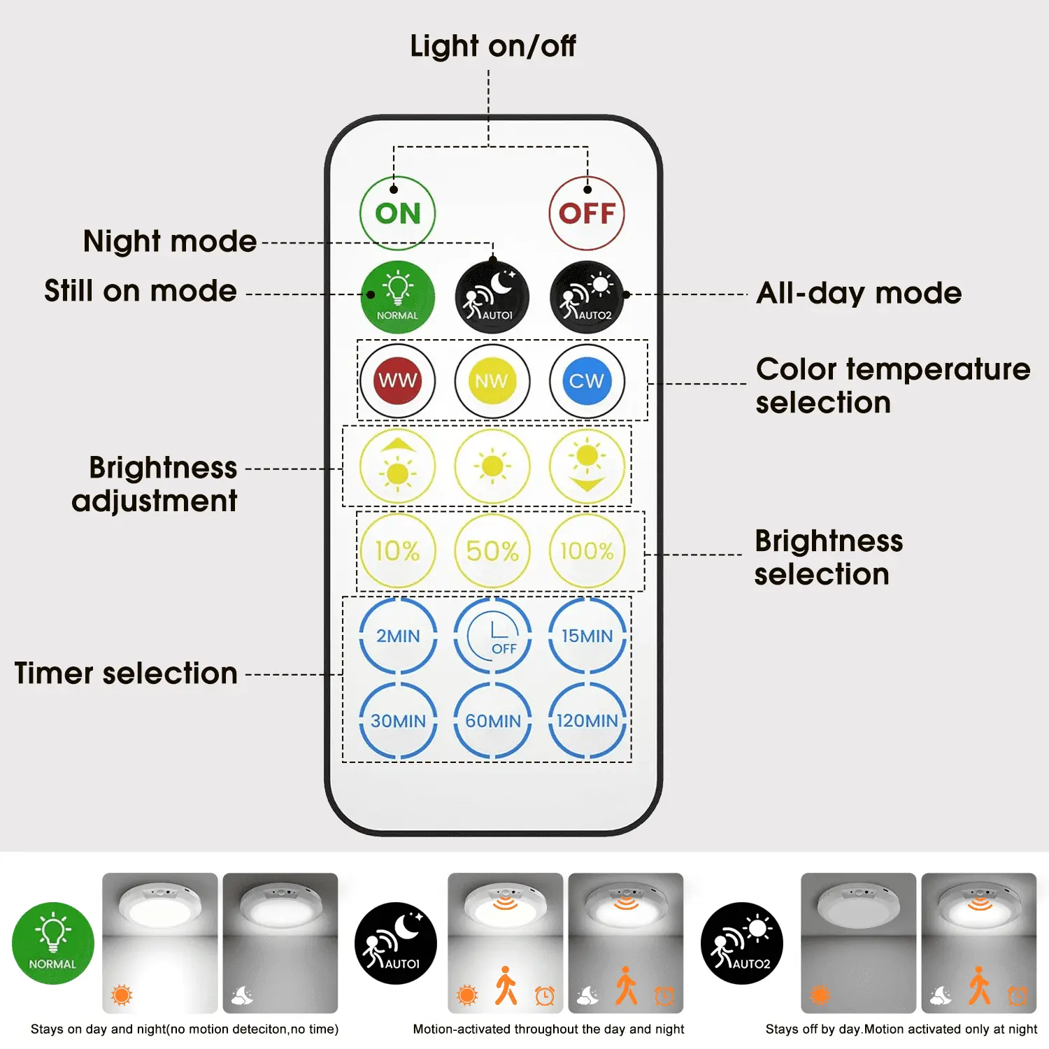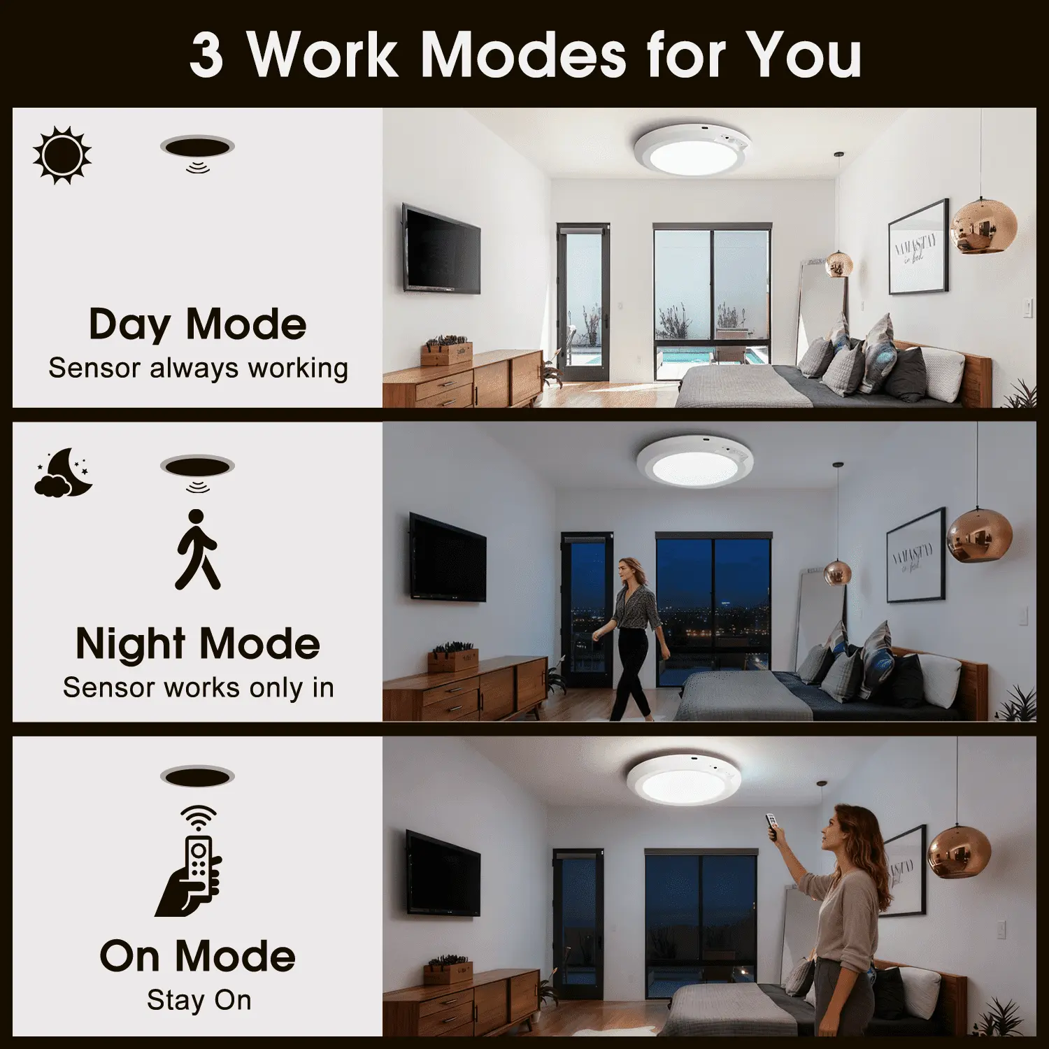 ·🚶Smart Motion SensorAdvanced infrared technology senses motion within 10–16 ft and 120° range.Automatically lights up when you enter and shuts off when you leave.Smart sensor detects movement within 10–16 ft.Choose from:1,Motion Sensor Mode 2,Always-On Mode 3,Night Sensor Mode (only lights up in dark)