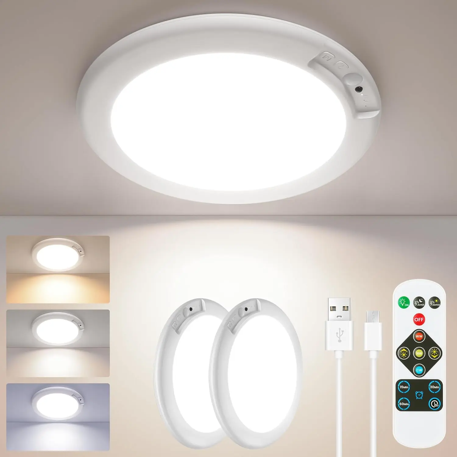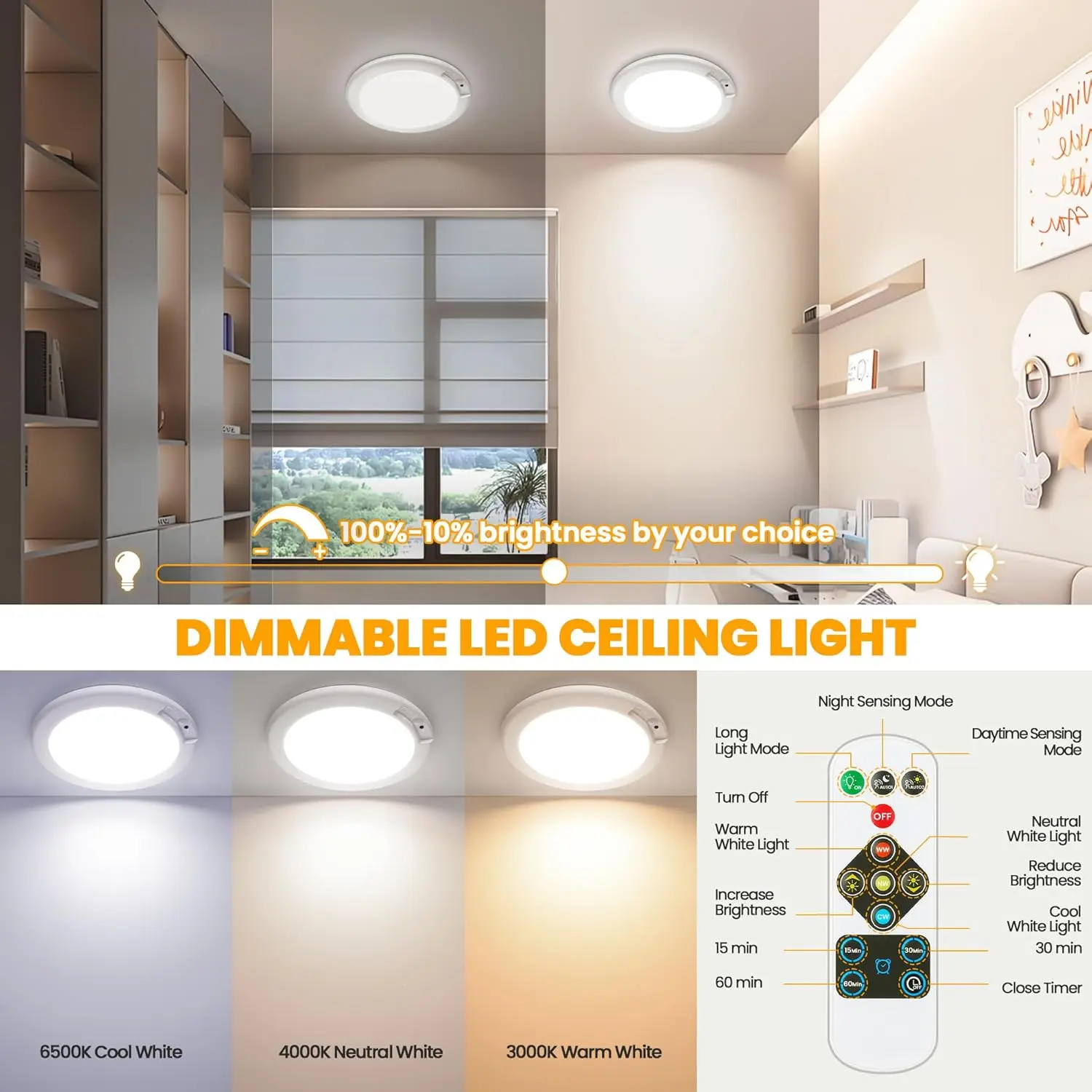 Timer Function & Lightweight and Wide Applications: 2 count remote ceiling light with 3 groups of timing: 15min/30min/60min. for dark corners and no wire positions, ultra thin flush mount close to ceiling light applies for various spaces like storage rooms, showers, garages, staircases and hallways, providing versatile cordless lighting.