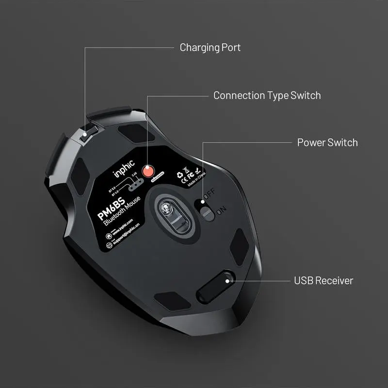 ✔Tri-Mode Connection: Inphic Bluetooth 5.0/4.0 And 2.4g USB Connection. You Can Switch To Any Mode By Clicking The Mode Switch Button Located At The Bottom Of The Mouse. The Indication Lights Of Bluetooth 5.0, Bluetooth 4.0, And 2.4g USB Are Green, Blue And Red, respectively. Once You Complete The Pair Of Bluetooth Or Insert The USB, You Can Freely Switch To Each Mode And The Maximum Operating Distance Of Each Mode Is 10 Meters.