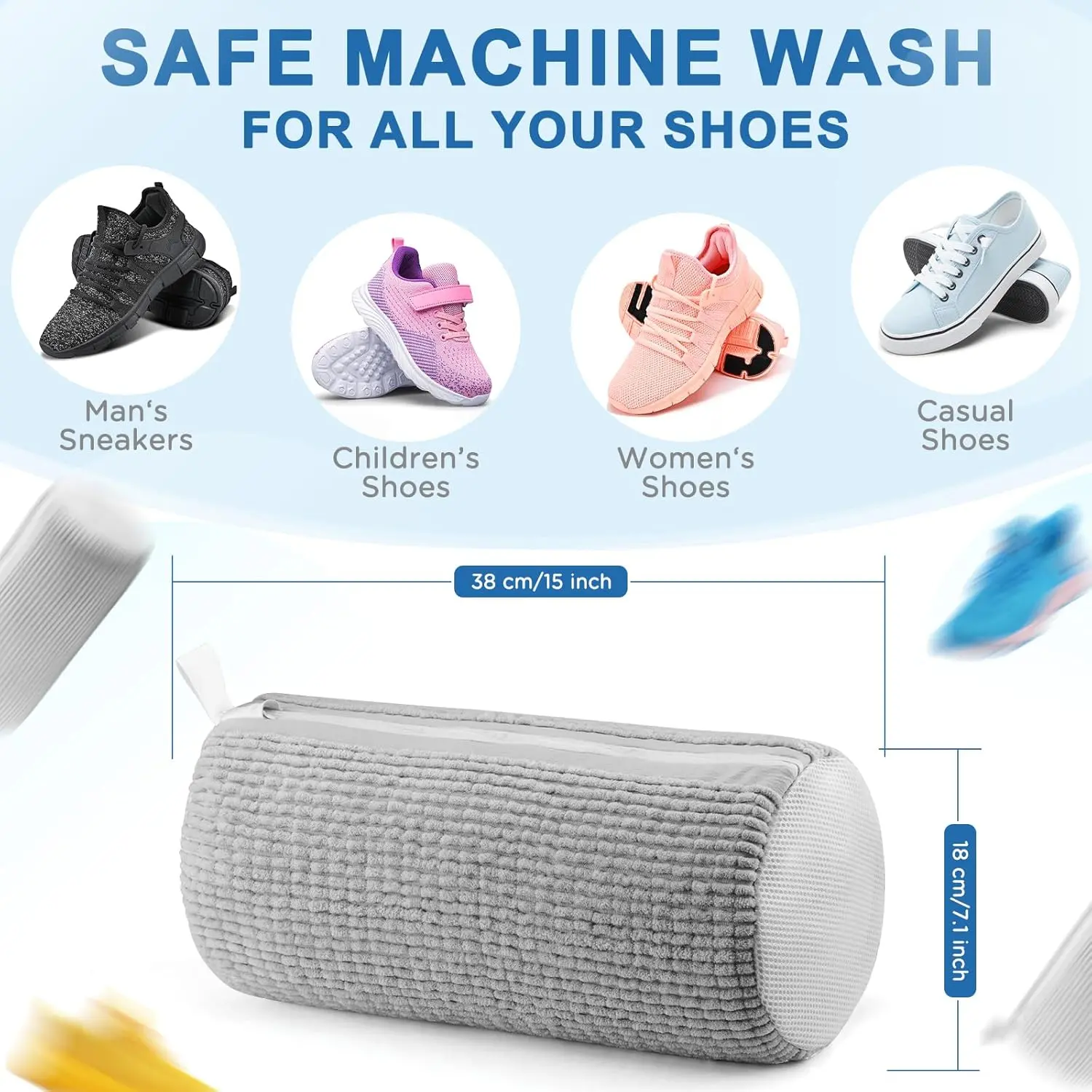 【Increase Size, Fits All Shoes Size】The improved shoe cleaning bag is larger, offering more space than most shoe bags on the market. In most cases, one shoe washing bag can hold 1 pair of shoes, but if you want to give each shoe a thorough cleaning, you can also place each shoe in a separate shoe washing bag; This shoe washing bag is suitable for all types of shoes, including men's sneakers, women's shoes, children's shoes, and casual shoes.