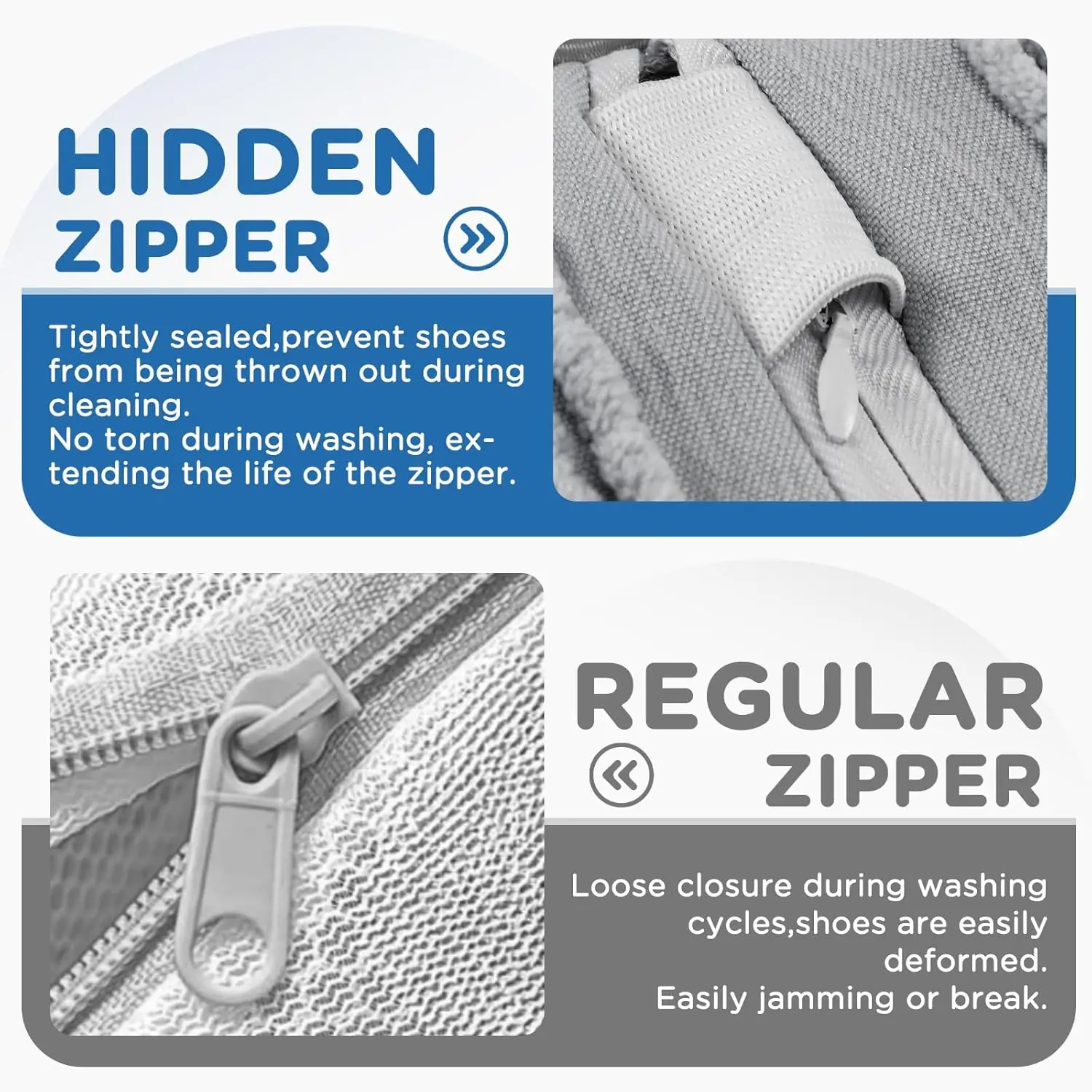 【Invisible Zipper & Side Opening Design】The new shoe washing bag features invisible zipper design that won't loosen or open during washing, and the zipper can be tucked into the elastic band to prevent it from getting caught or scratching other clothes. Compared to the top zipper of the first-generation, the new ones feature a side zipper design, making it easier to put shoes into the shoe covers. And this shoe cleaning bag features a top strap design for easy hanging and storage after washing.