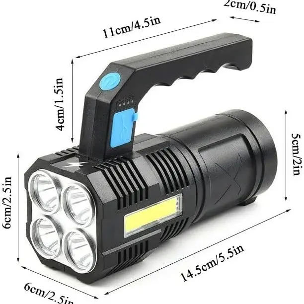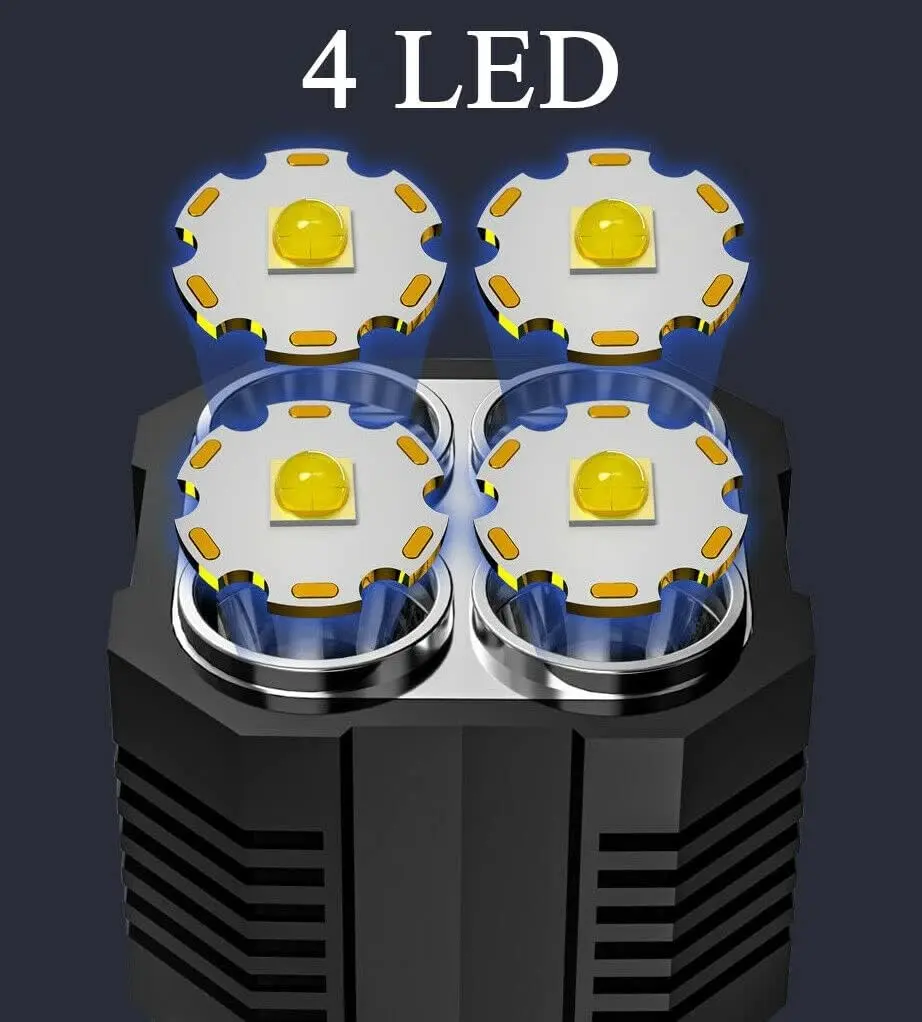 Elevate your emergency preparedness with this powerful tactical flashlight. It features 4X LED technology for super bright illumination. Perfect for camping or emergencies, this rechargeable light offers 4 modes for versatile use. Its waterproof design ensures durability in various conditions. A great gift for outdoor enthusiasts.
