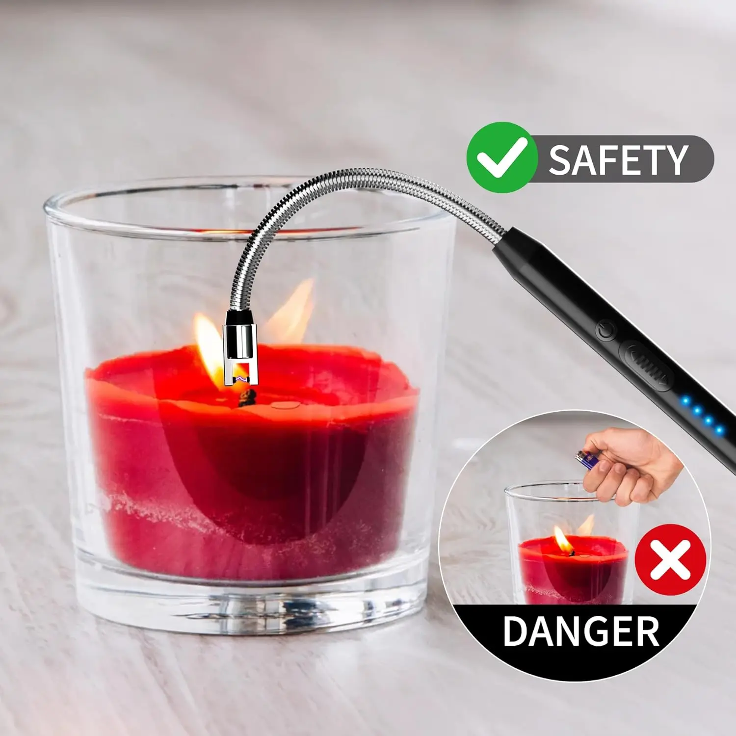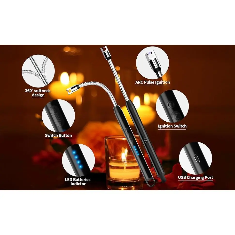 METAL BODY & PORTABLE - Unlike other plastic lighters, the body of electric is made of zinc alloy, which makes it not look cheap.Weight: 0.12lb , Dimensions: 10.2"L x 0.6"W x 0.6"Th, portable and easy to carryWINDPROOF FLAMELESS ARC - The electric can product flameless arc.No flame, more safety.The windproof plasma arc ensures that you can easily use it under bad weather.UPGRADED WIDER IGNITION PORT, which would increase ignition area and speed.The ignition speed is more faster than other lighters4.0" Long Flexible Neck - The electric candle is 10.2 inches in length with a 4.0 inch long neck.The 360° bendable and retractable neck of the adapts to any challenging ignition angle, such as deep candle holdersUSB Type C RECHARGEABLE - The Lighters can be used 600 times on a single charge .The 4 LED POWER INDICATOR guarantees that you are always aware of the available energy level.DOUBLE PROTECTION: safety lock&auto-off - 1)The arc with-proof at the on/off button protects children from igniting accidentally. 2)For security, has multiple protections, if the heating time is too long, the will automatically cut off the power after 8 seconds