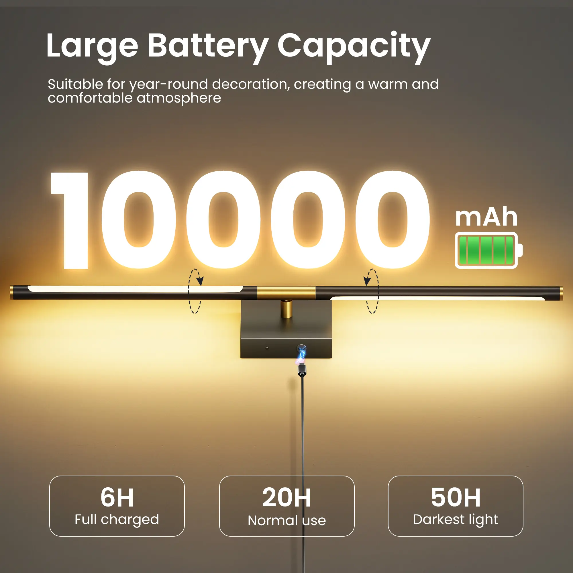 ·[Long Working Hours & Short Charging Hours] Equipped with a 10000mAh Battery, our rechargeable battery operated wall lights can continuously work for 30-50 hours at different brightness levels to meet your daily needs. It only takes 5 hours for the light to be fully charged, and the color of the indicator lights in the light arm will indicate whether it's fully charged or not.