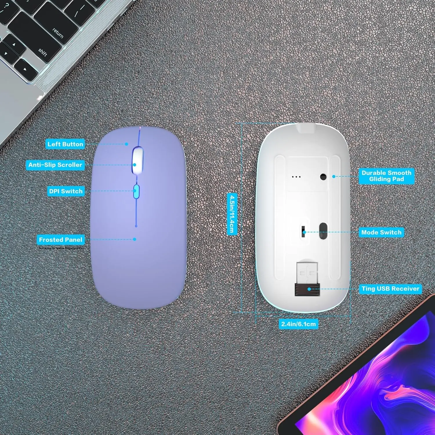 【Silent/Fingerprint-proof】:Silent Laptop Mice Button Silent Click Design Reduces 90% Noises,Help You Concentrate on Your Work、Study Without Disturbing Others Besides You. Fingerprint-proof Surface Coating Technology Design Gives Your a -Like Touch,The sturdy anti-slip rubber scroll wheel ensures that your hand will not slip when scrolling.Slim Offers Your Hand Maximum Support and Comfort.