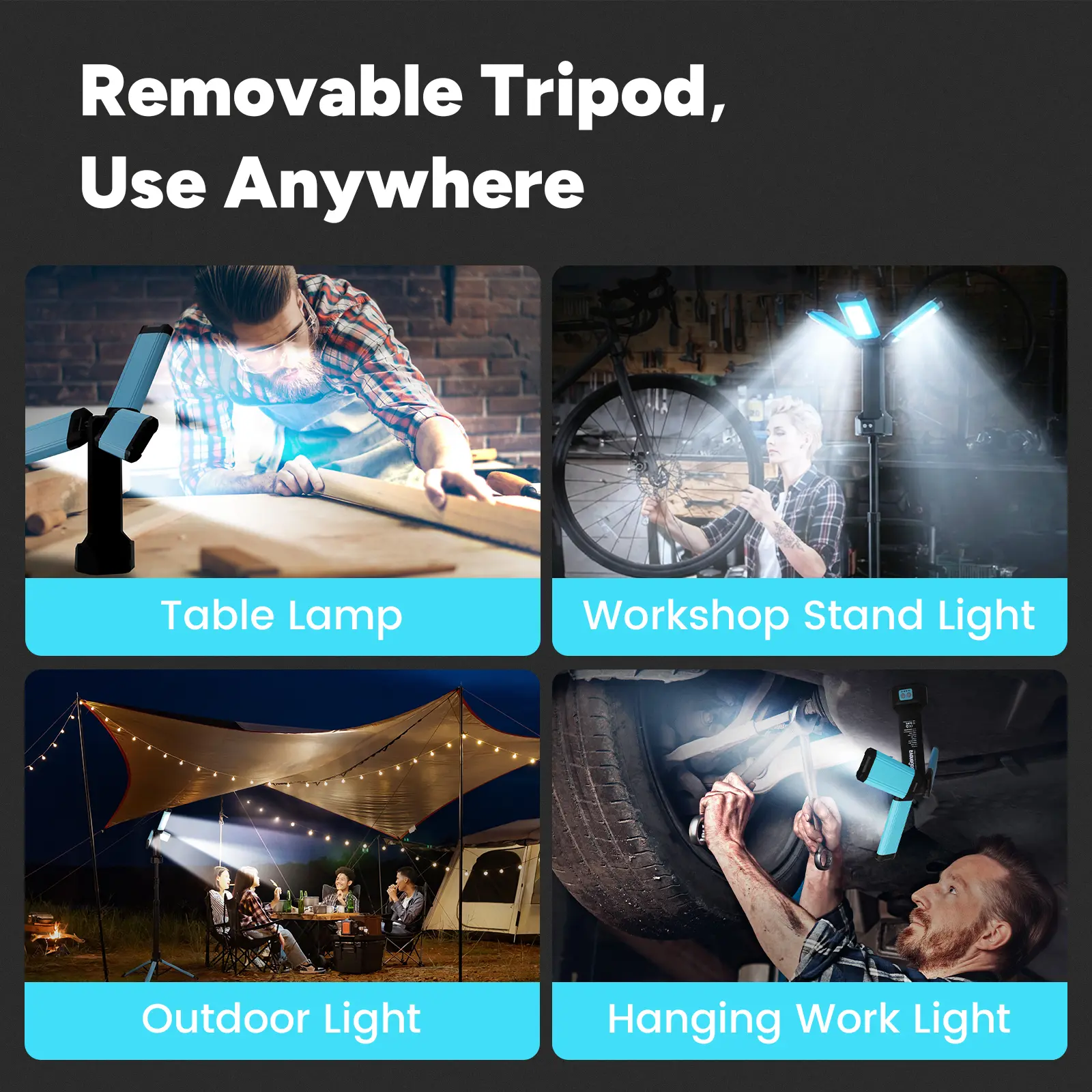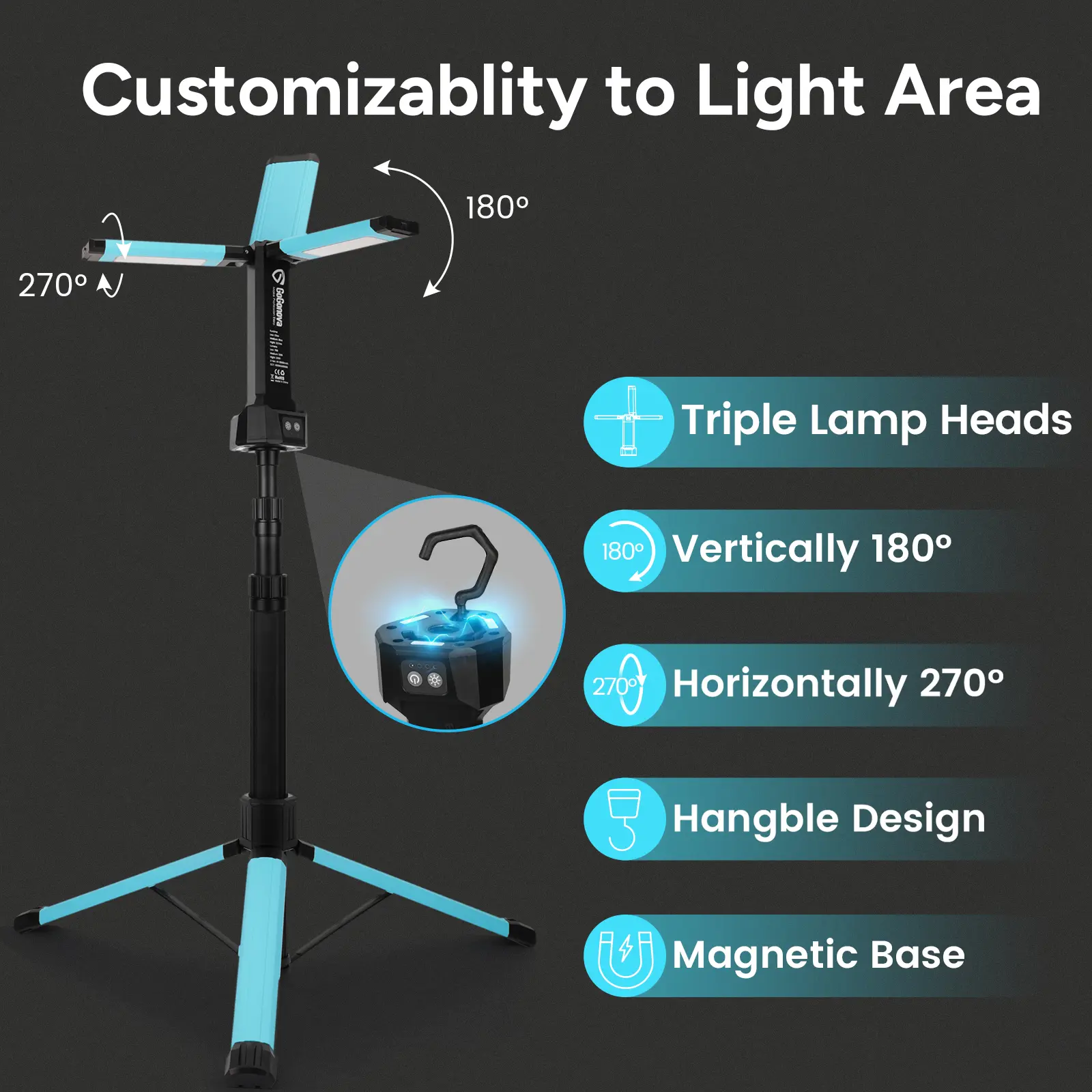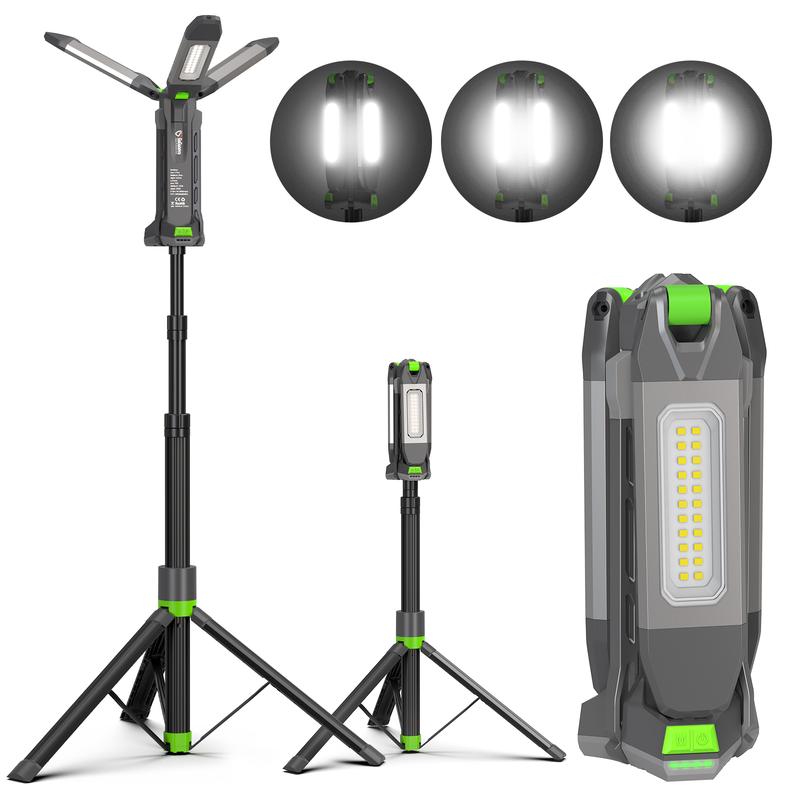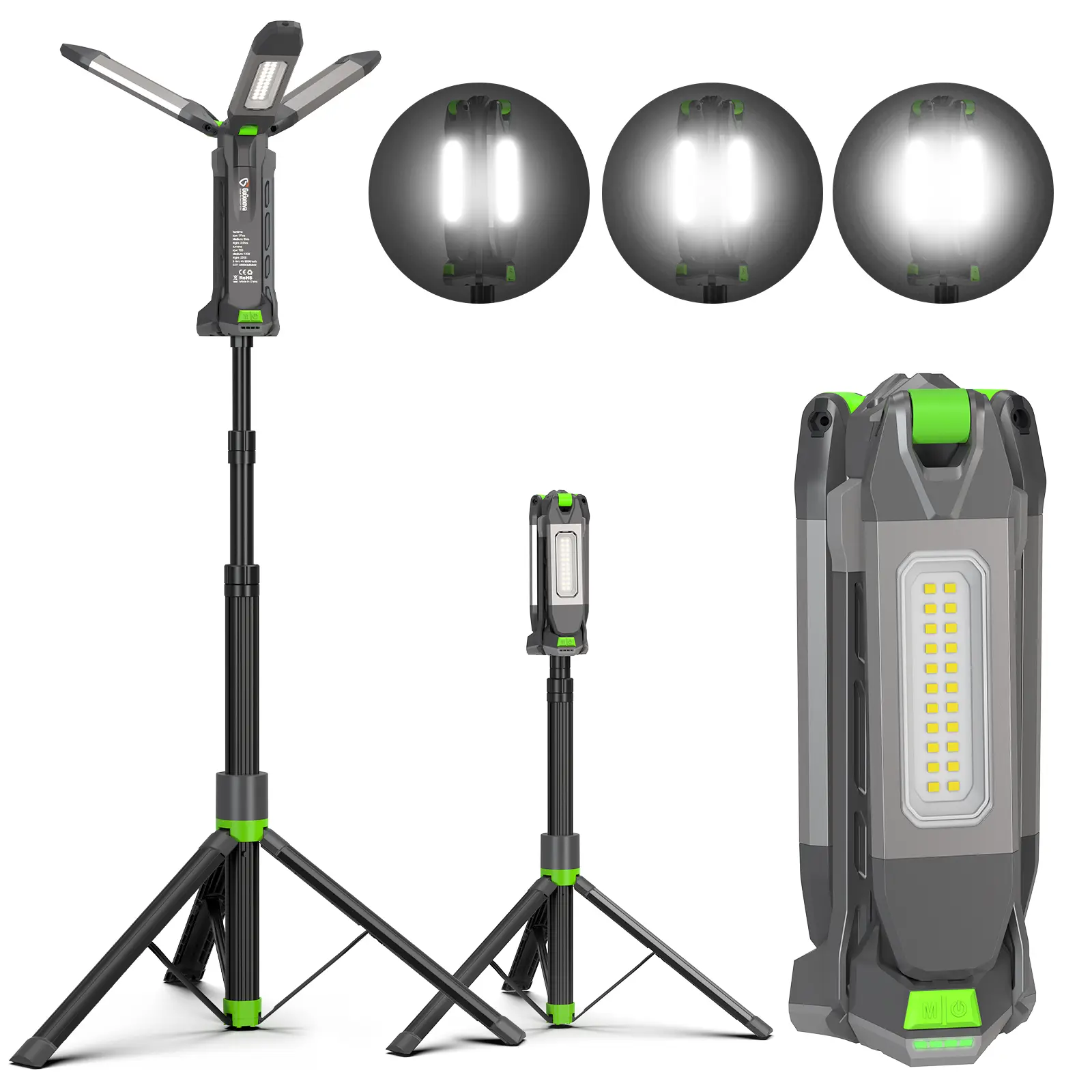 The 57-inch tripod extends to 9.5 feet, offering versatile support. Its aluminum shell and special design ensure durability. The detachable tripod includes a hangable hook and magnetic base. Perfect for workshops, job sites, or camping, meeting all your illumination needs.