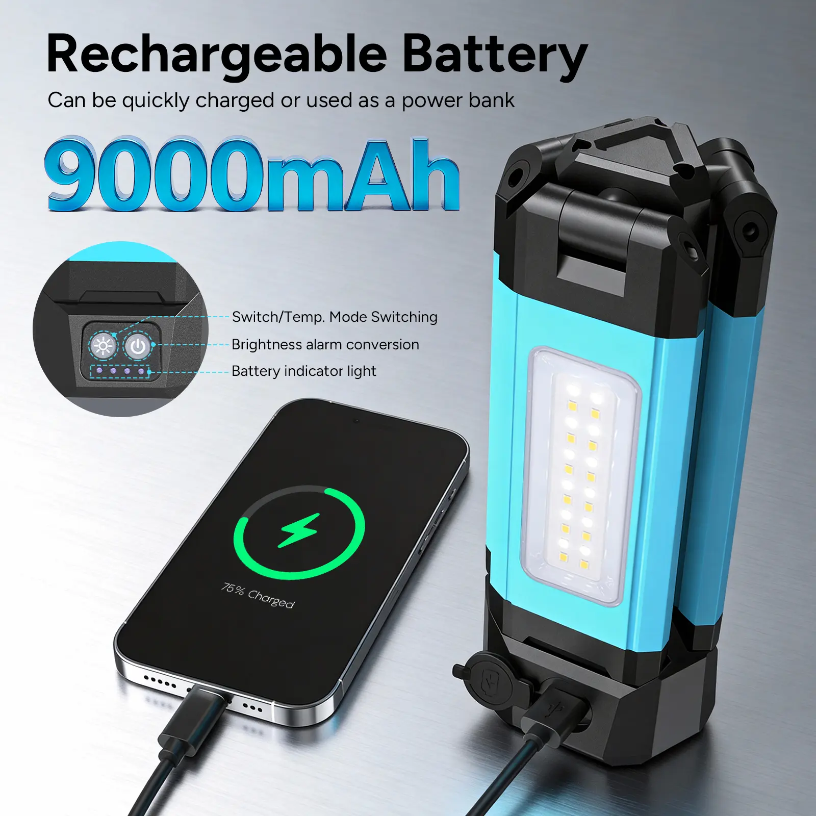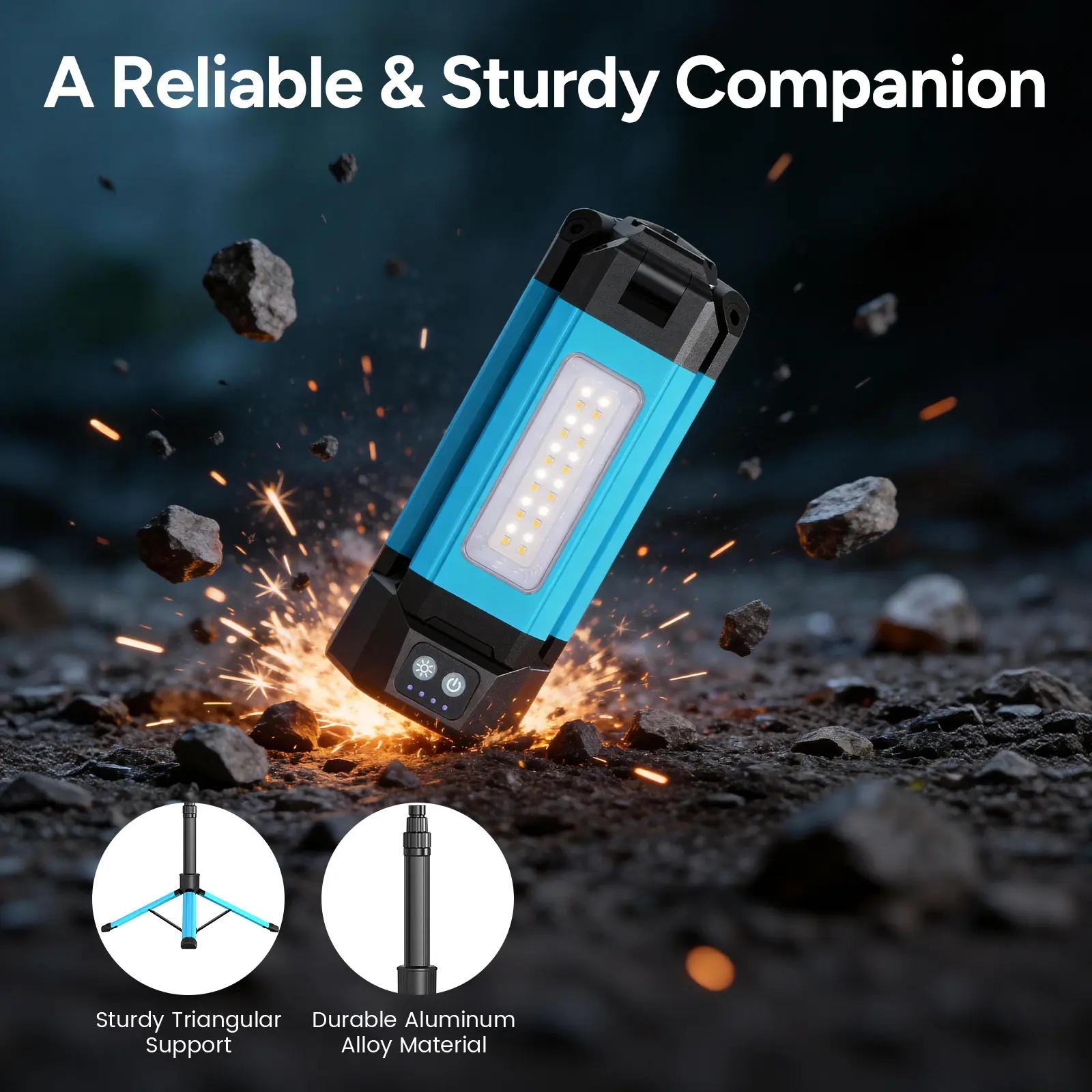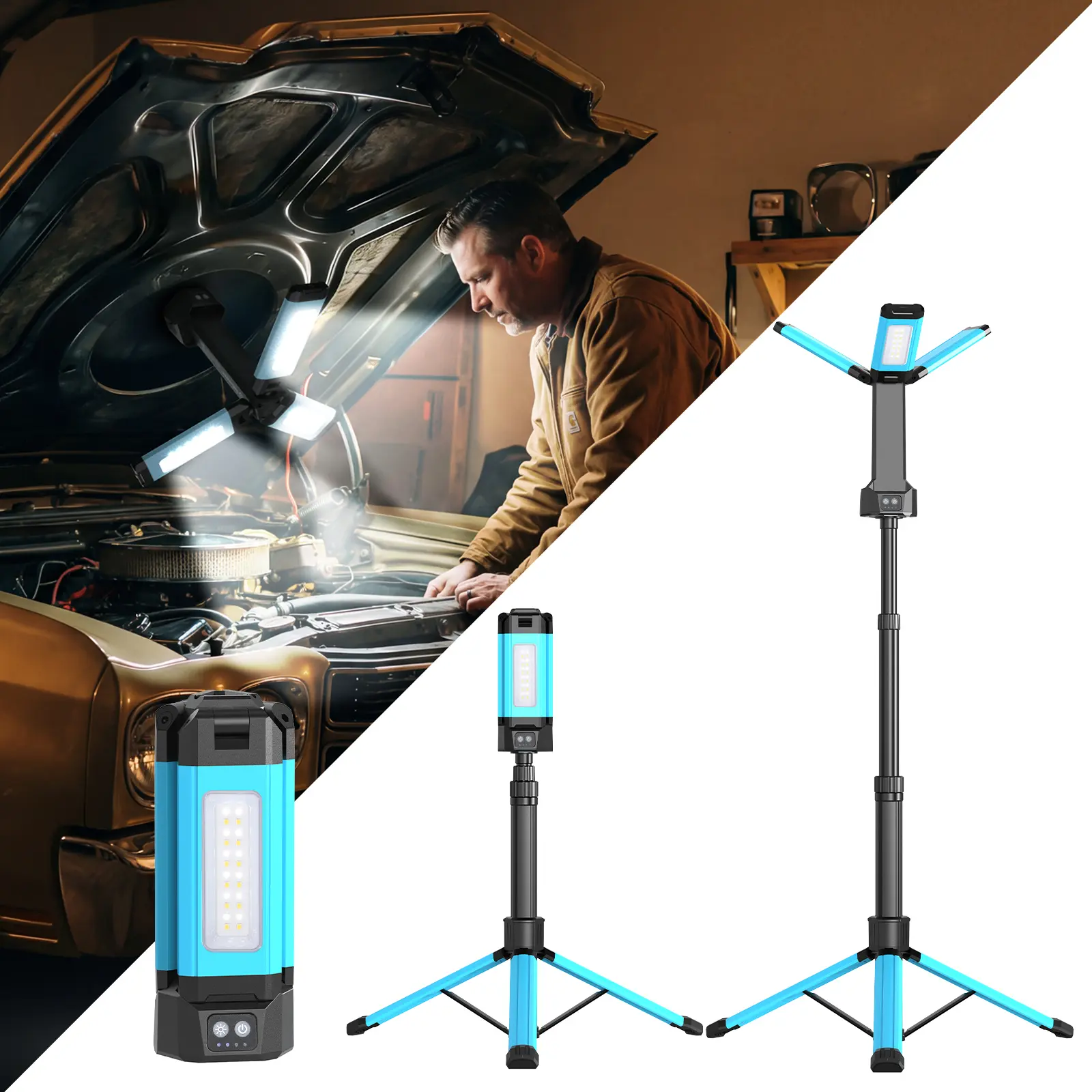 The 57-inch tripod extends to 9.5 feet, offering versatile support. Its aluminum shell and special design ensure durability. The detachable tripod includes a hangable hook and magnetic base. Perfect for workshops, job sites, or camping, meeting all your illumination needs.