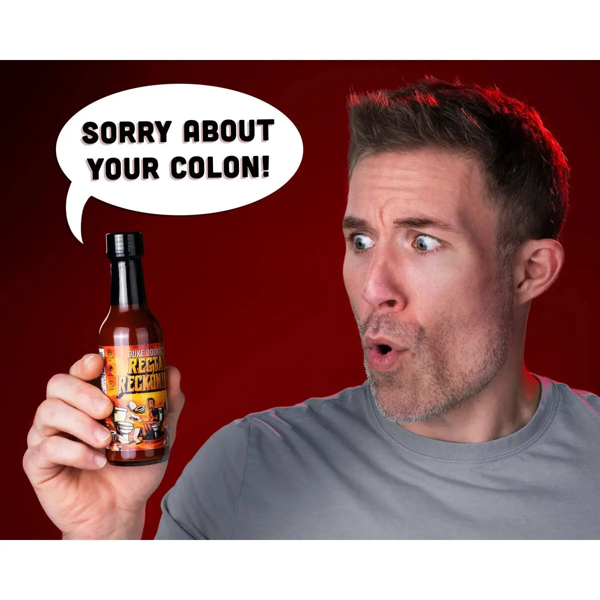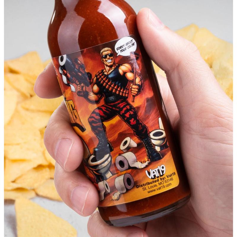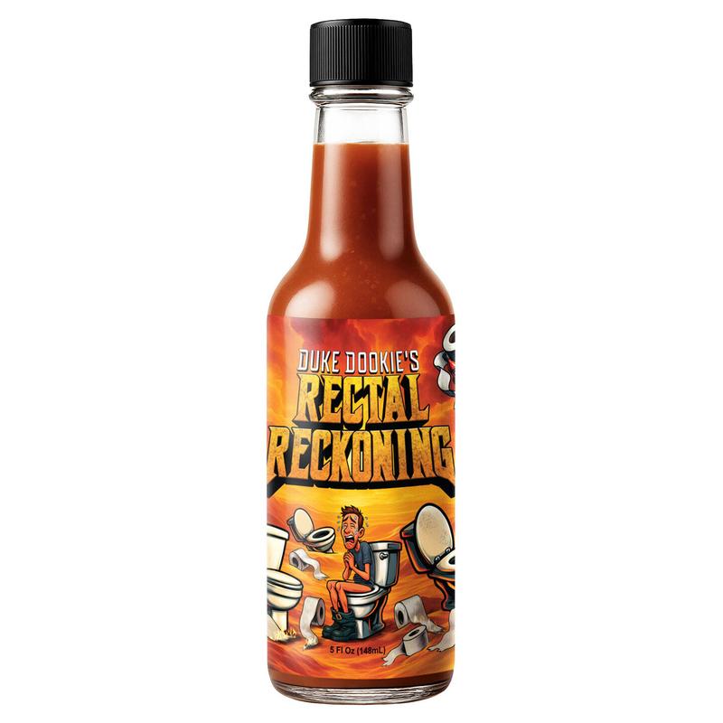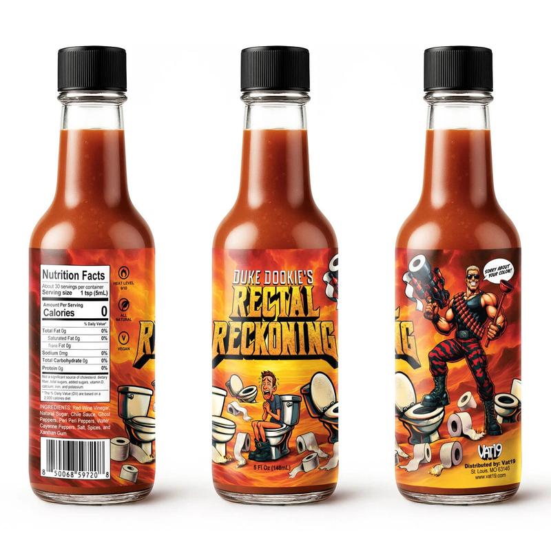 Rectal Reckoning is a Vat19 original hot sauce with a scorching ghost pepper kick. Presented by the definitely-not-derivative and totally original character, Duke Dookie, its carefully blended spices are a mouthful of flavorful pain.