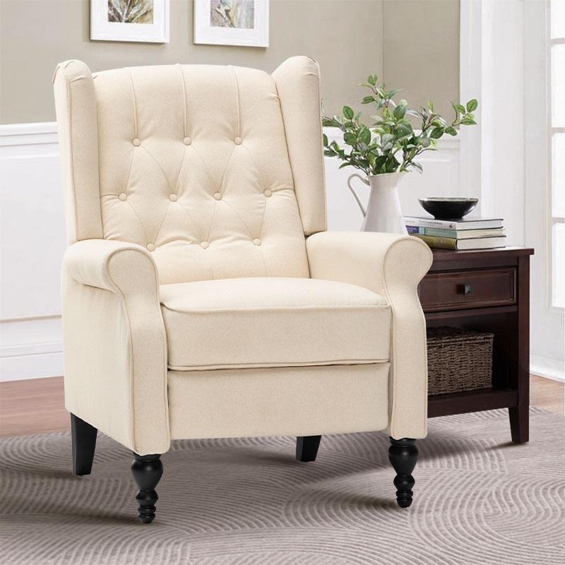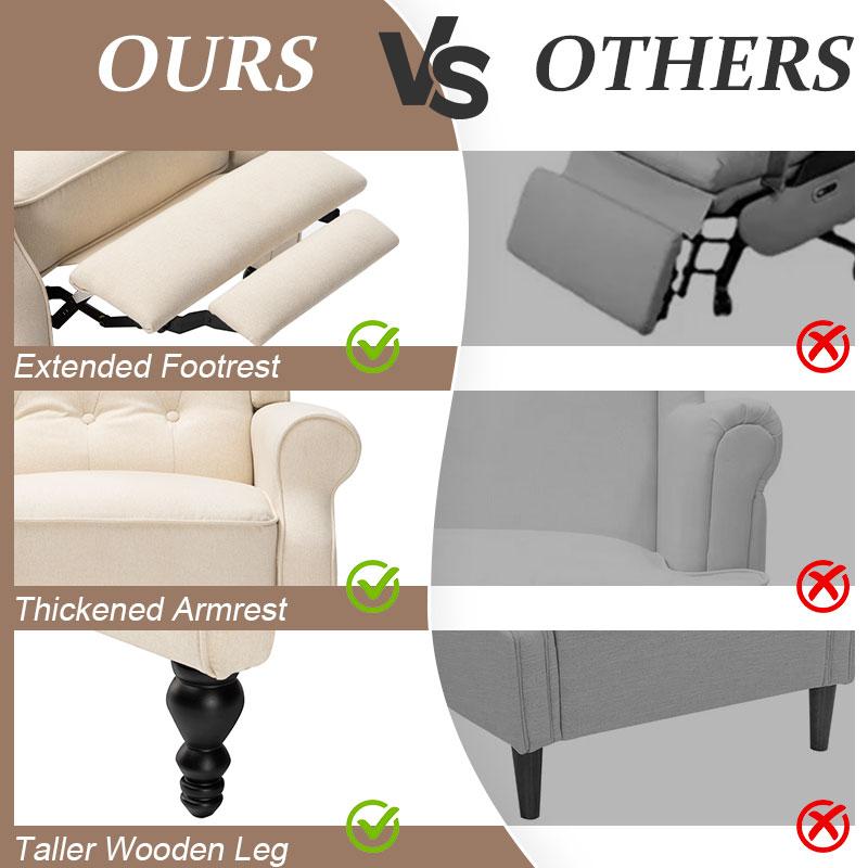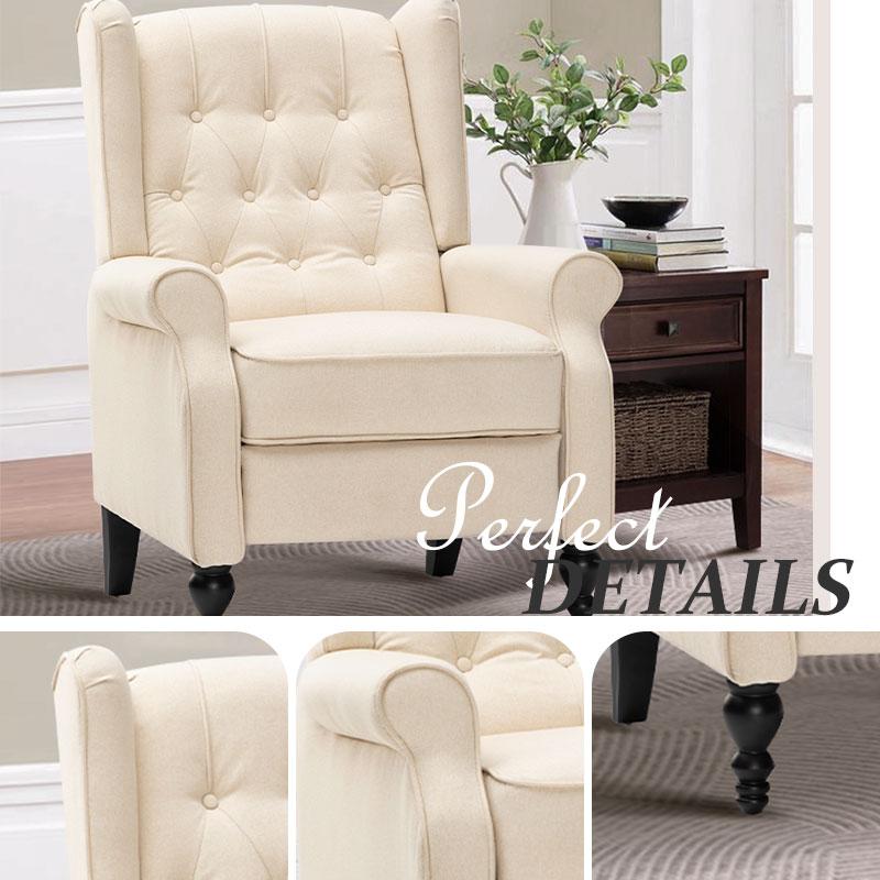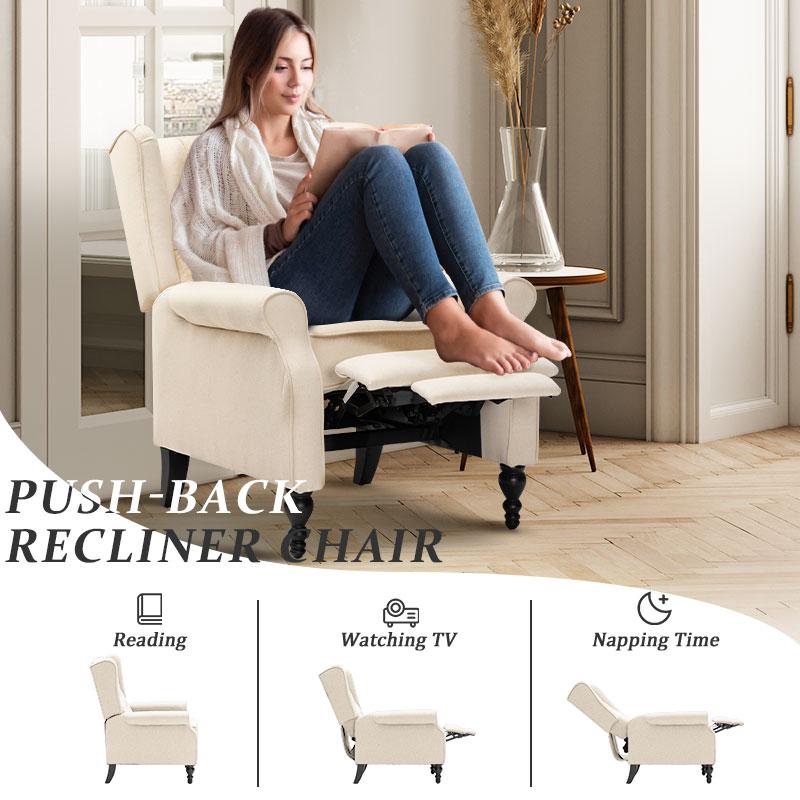 ·【PUSH-BACK RECLINER】This recliner is a push-back recliner that allows you to lie down and relax after a long day. Simply lean back to tilt the chair and the footstool will pop out to provide a comfortable position for your feet. Just press the footstool down with your feet and the chair will restore its original shape.