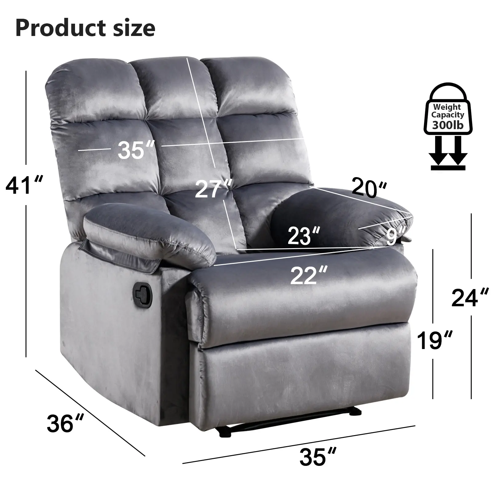 ➤ Simple Installation & Ideal Size: All you have to do is take all parts of the recliner from the shipping box and then attach the back of chair to its seat by aligning the metal grooves. Overall Dimension:34""(L)x36""(W)x40""(H). Seat Size:18.5""(L)x20.9""(W)x18.9""(H) Weight Capacity: 300lbs
