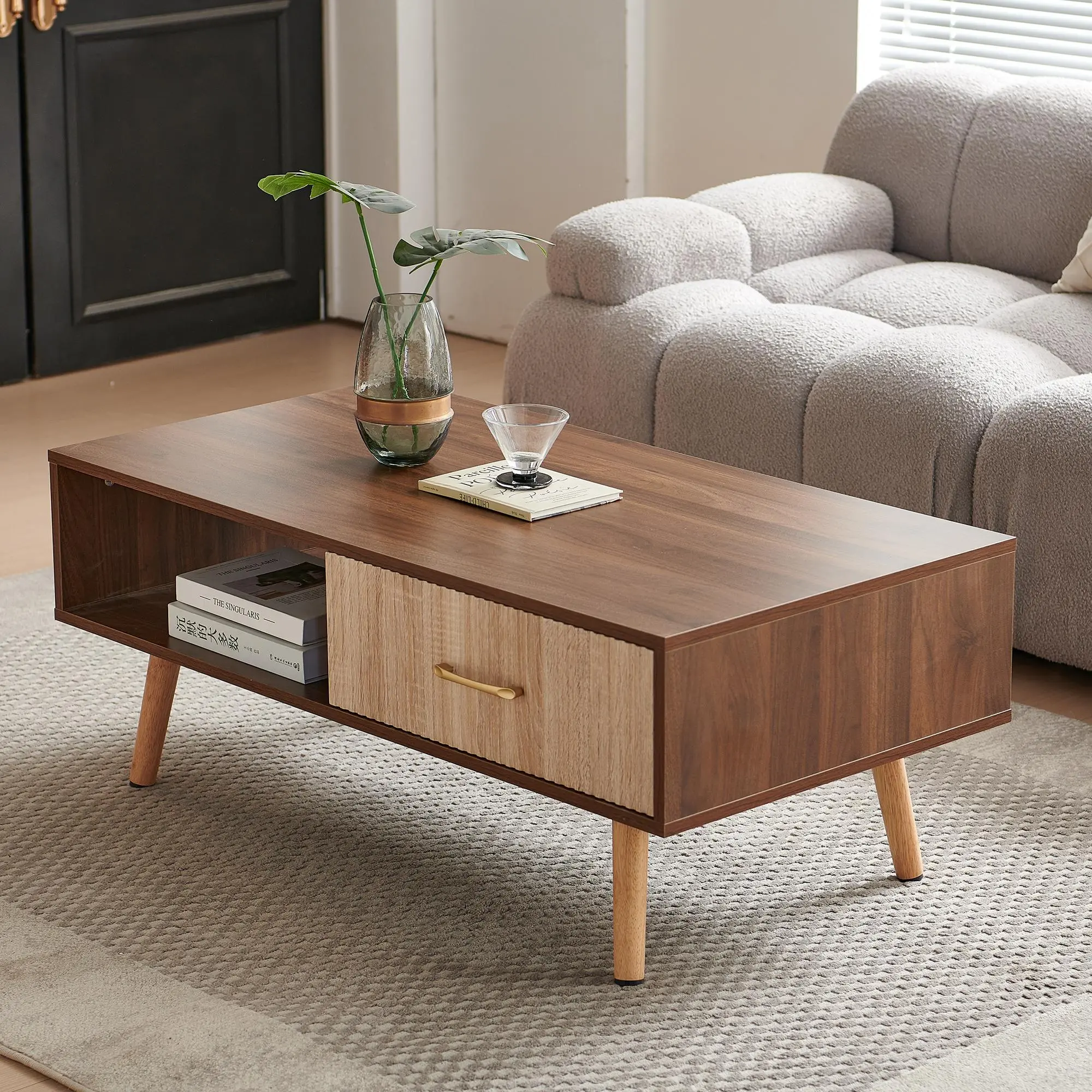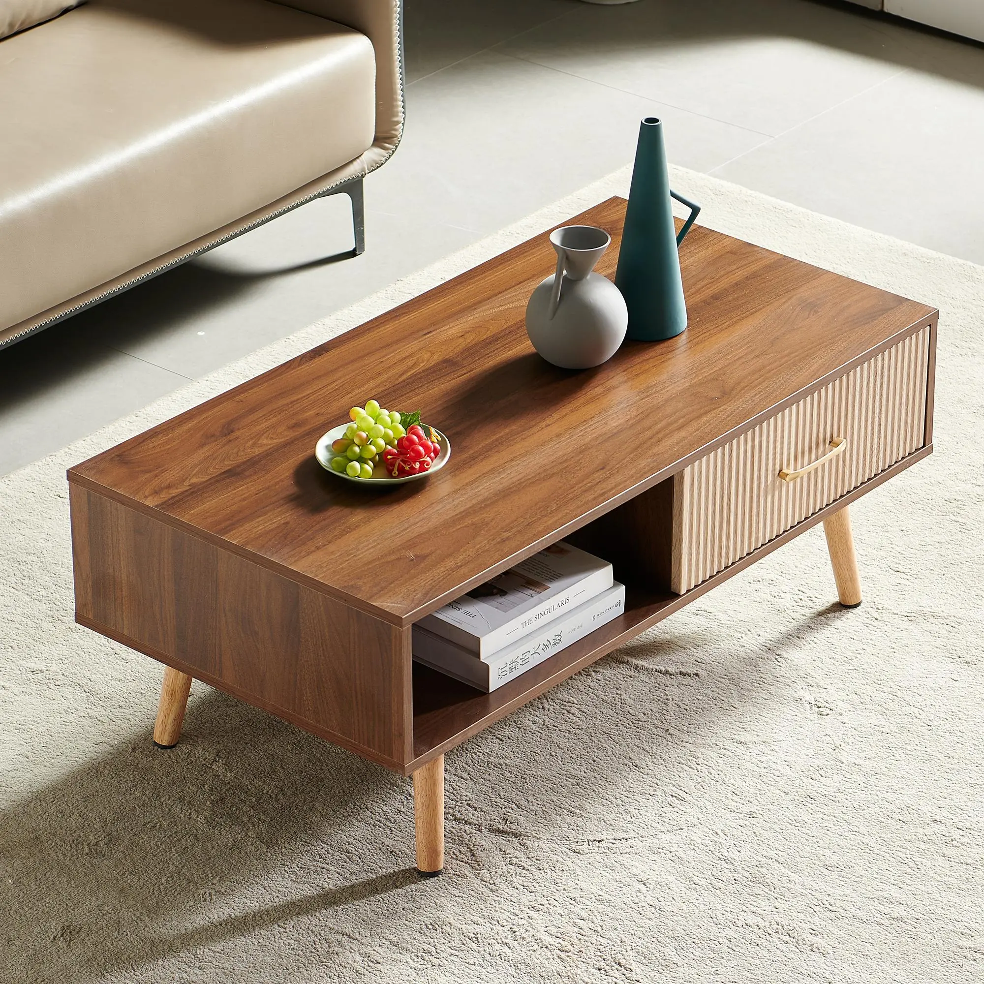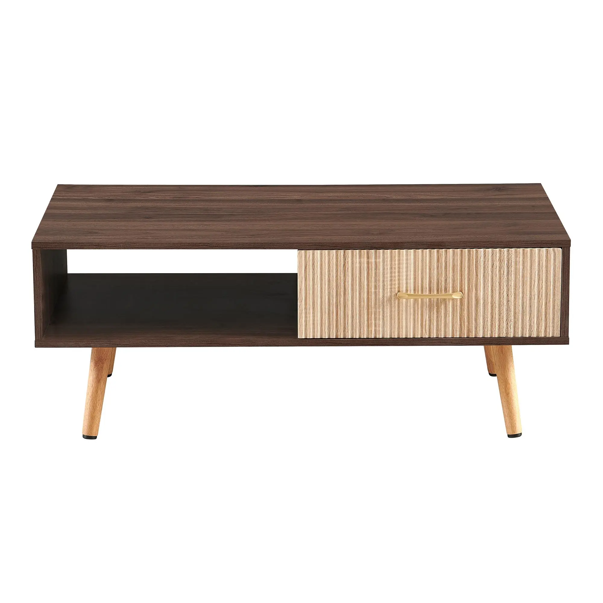 1.Item Dimensions: 40.94"L x 21.26"W x 16.34"H, Load-bearing capacity: 220lbs.2.Material Quality: Crafted from high-quality materials, the table ensure durability and stability. Smooth gliding drawer mechanisms make opening and closing effortless.3.The surface of the drawer features a textured pattern of concave and convex lines, providing a tactile and visually pleasing experience.4.Sturdy Solid Wood Leg Supports: The adjustable PVC feet can keep it steady, and also protects your floor from scratches.5.Large storage space: This coffee table features a convenient pull-out drawer. It provides extra storage space for small items like remote controls, magazines, and coasters.6.The drawer slides smoothly, making it easy to access your belongings. It's a practical and stylish addition to any living room.7.Easy to assemble: All hardwares and accessories are provided. It comes with easy-to-follow instructions.