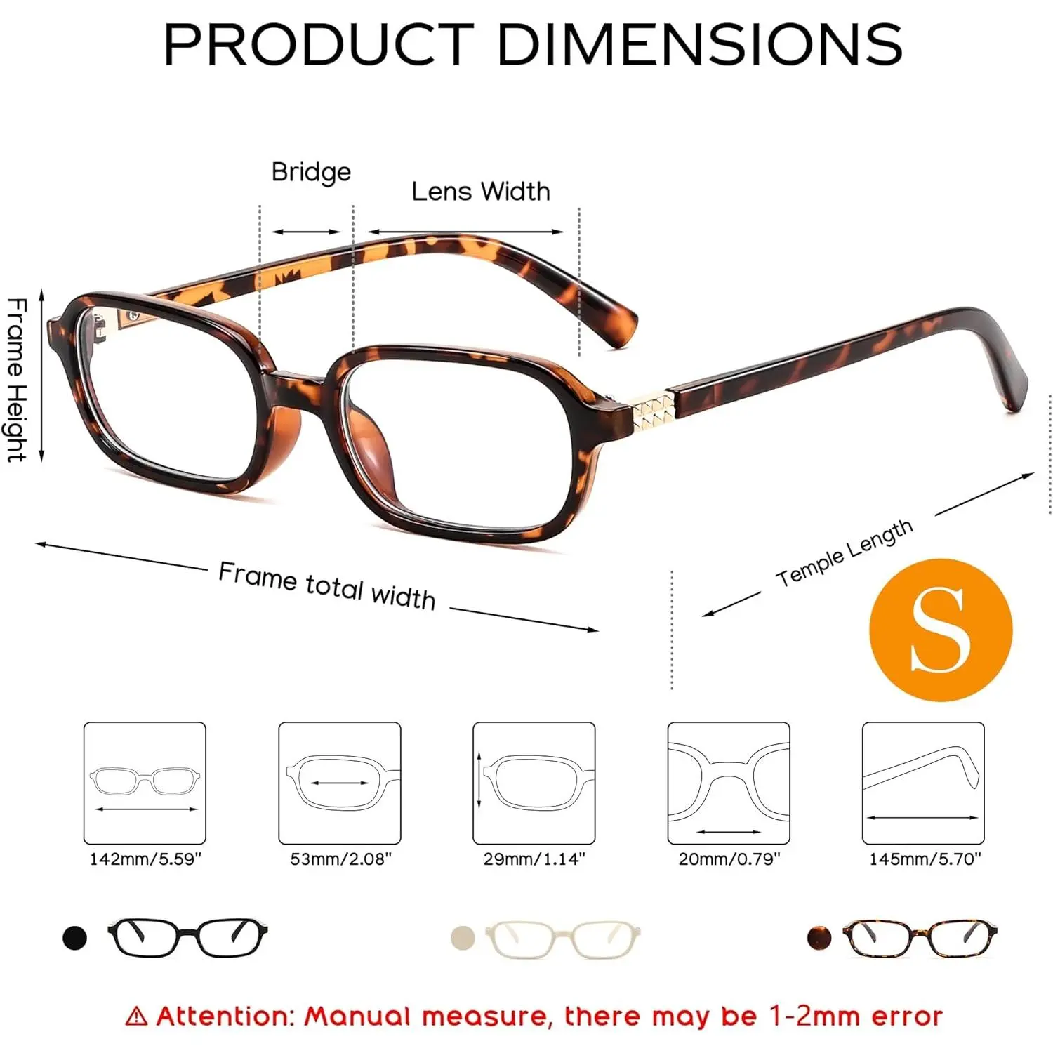 ·Product Dimension - Lens Width: 53mm(2.08'') | Lens Height: 29mm(1.14'') | Frame Width: 142mm(5.59'') | Nose Bridge: 20mm(0.78'')| Leg Length: 145mm(5.70'')