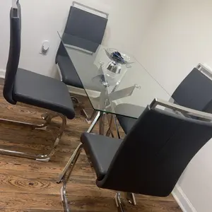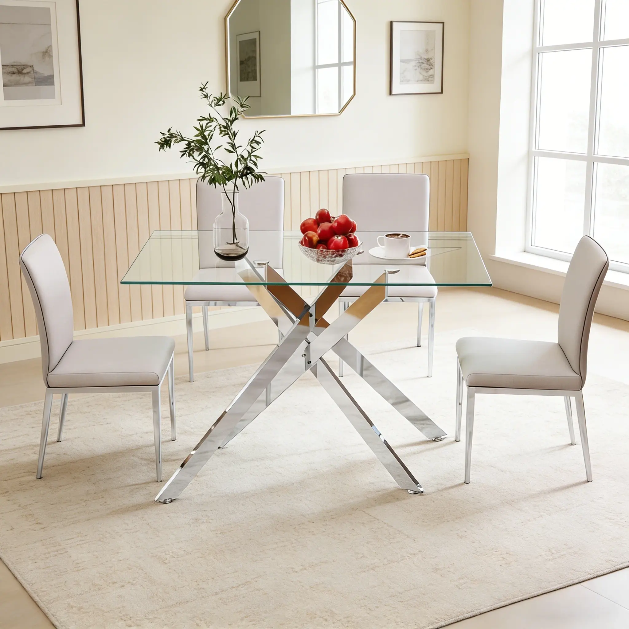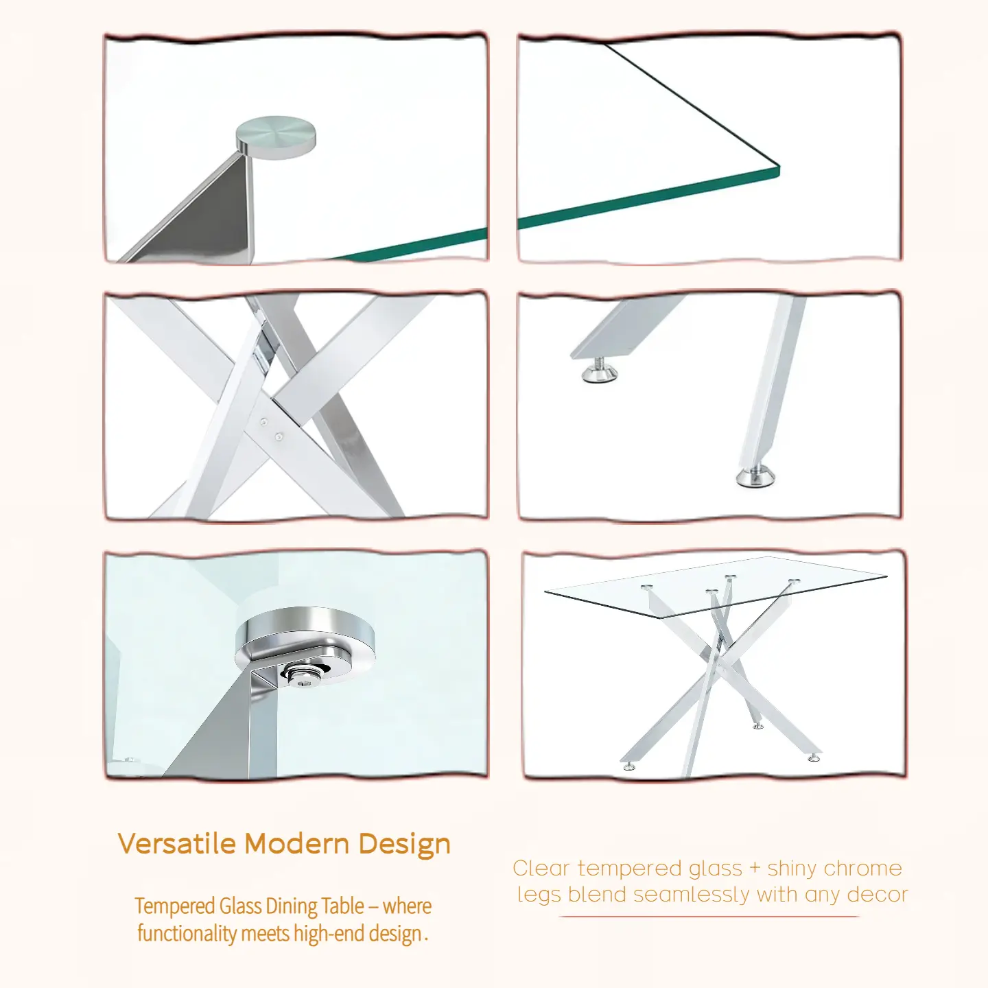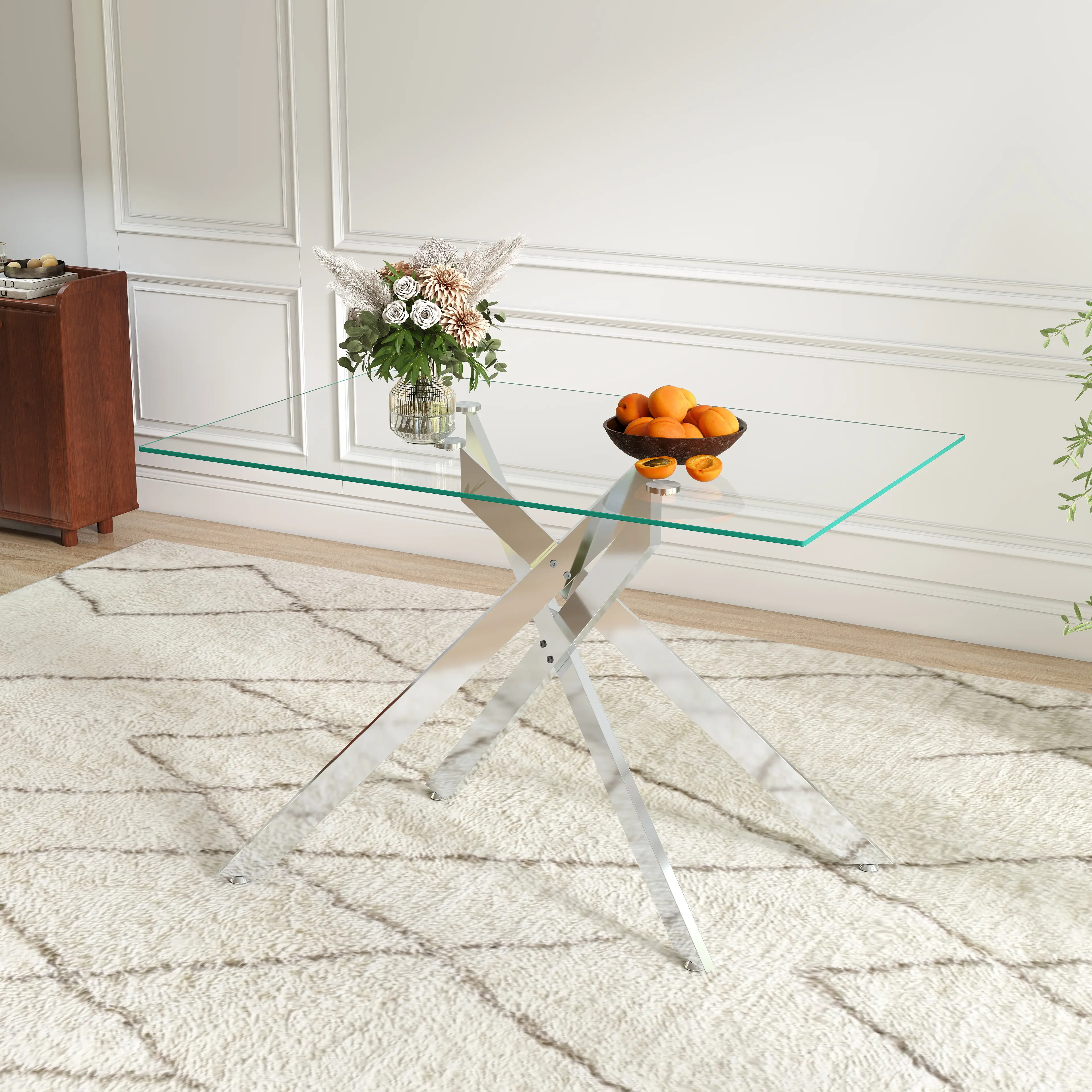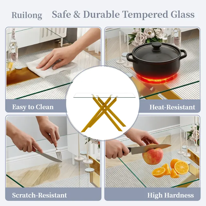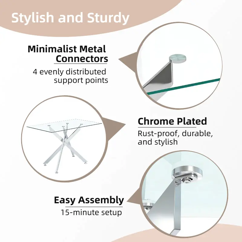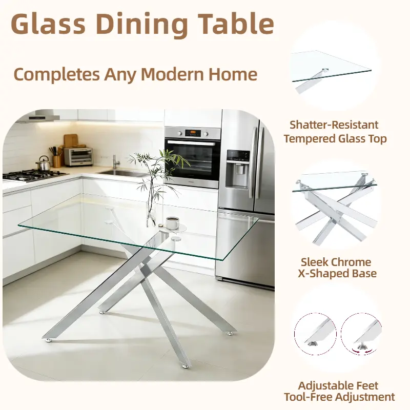 The dining table uses high-quality materials, ensuring superior strength. The tempered glass top adds elegance and durability. The unique legs create a striking visual contrast, making it a focal point in your dining room. Anti-slip mats ensure it stays in place.