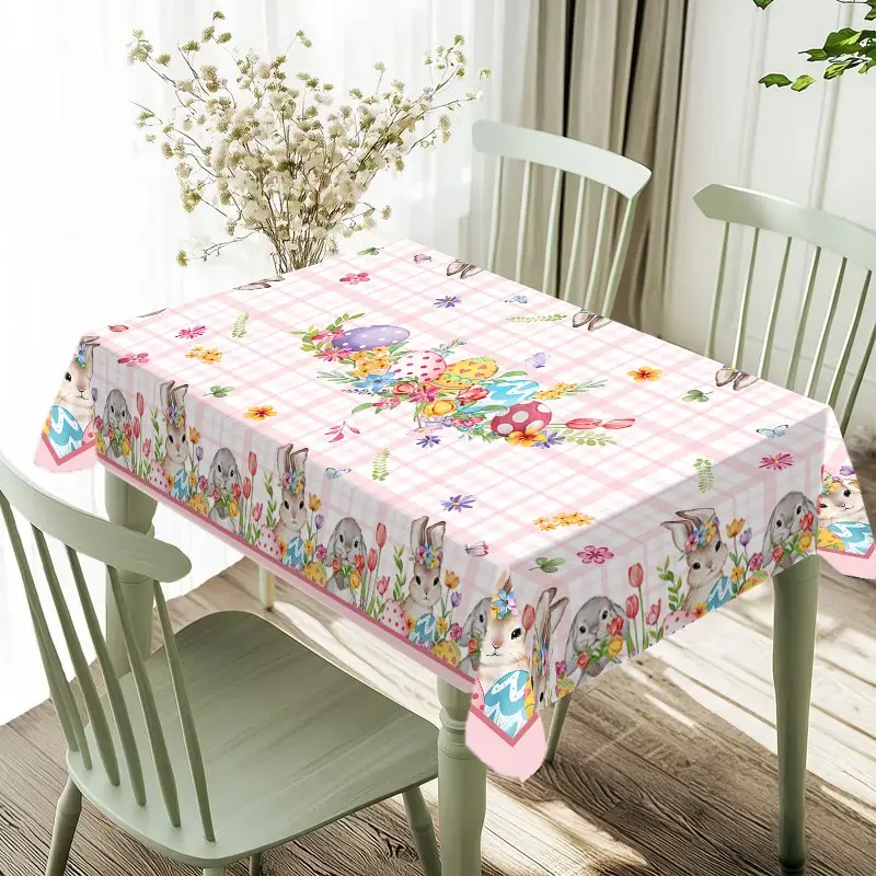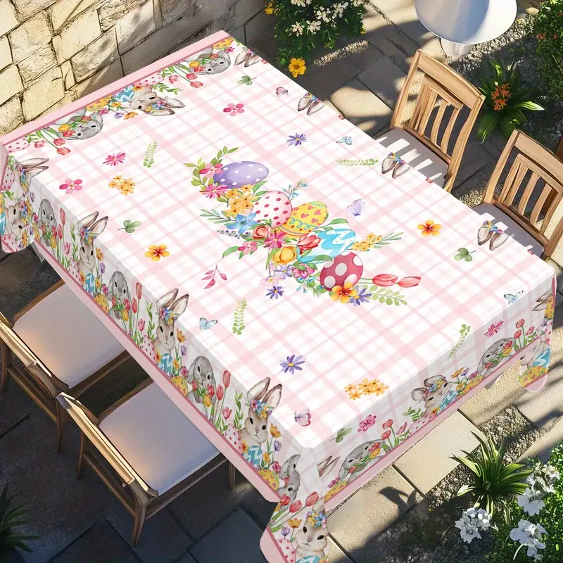 Rectangular Easter Tablecloth, Cartoon Rabbit & Egg Design, Spring/summer Floral Pattern, Perfect for Holiday/easter Decorations, Picnic Table Cover