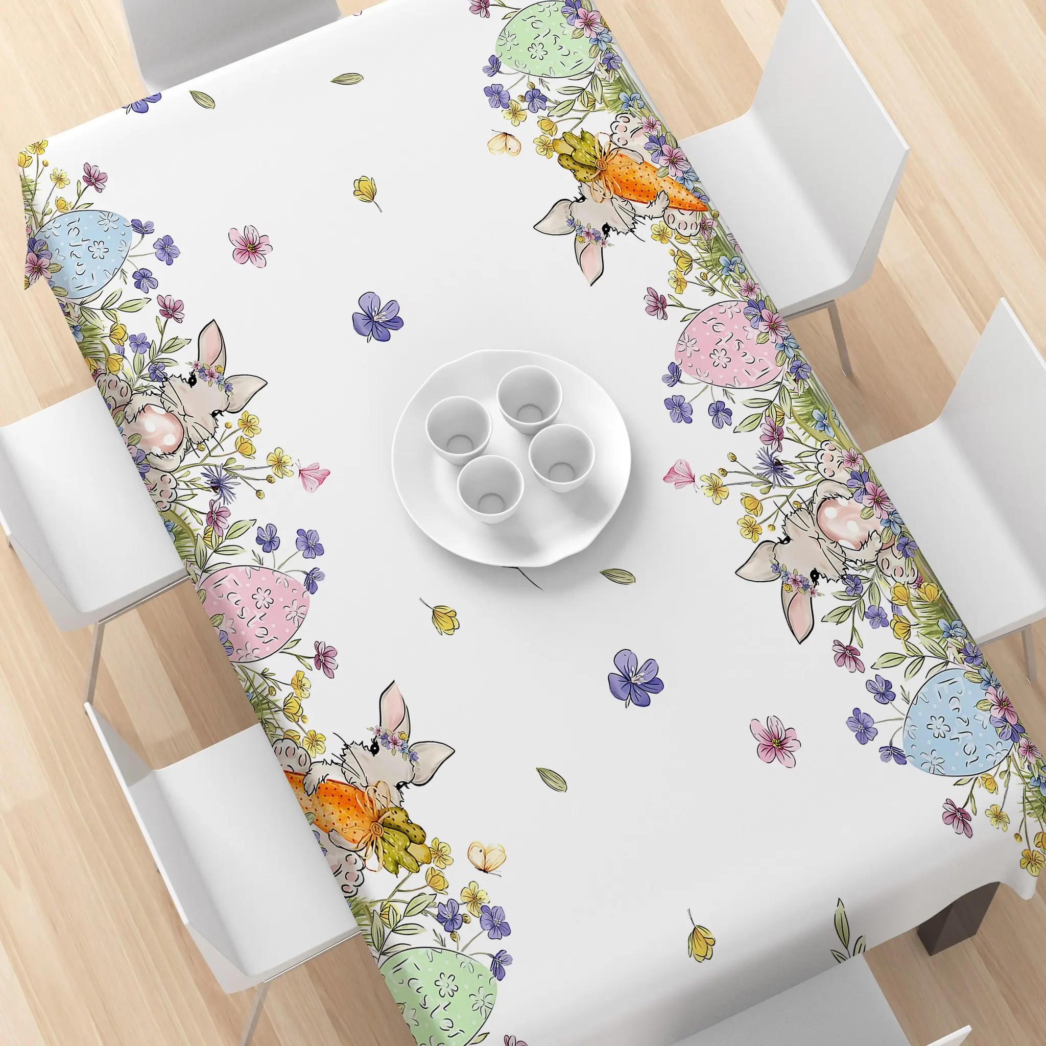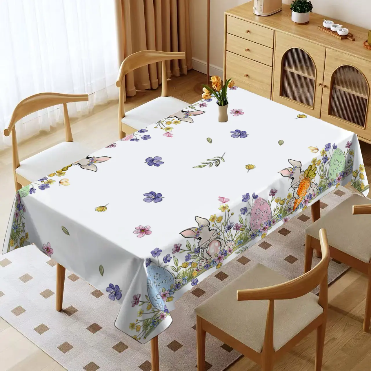 Rectangular Easter Tablecloth, Cartoon Rabbit & Egg Design, Spring/summer Floral Pattern, Perfect for Holiday/easter Decorations
