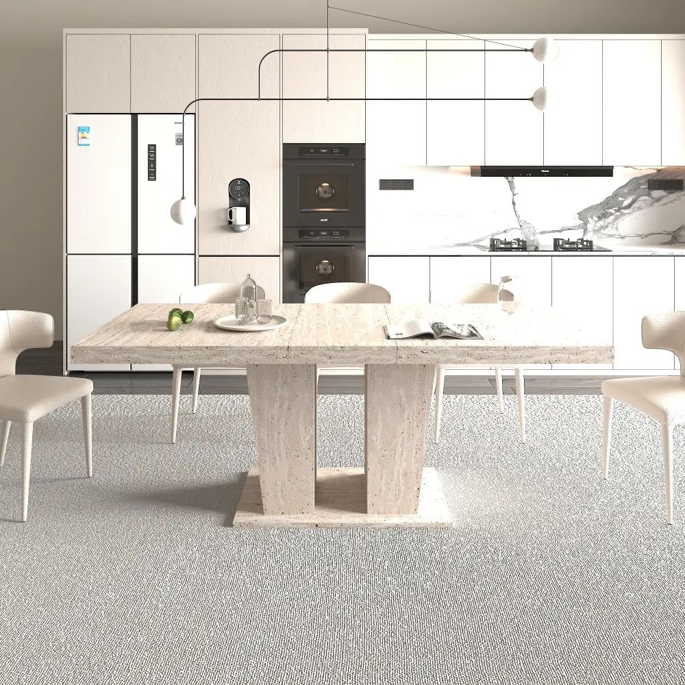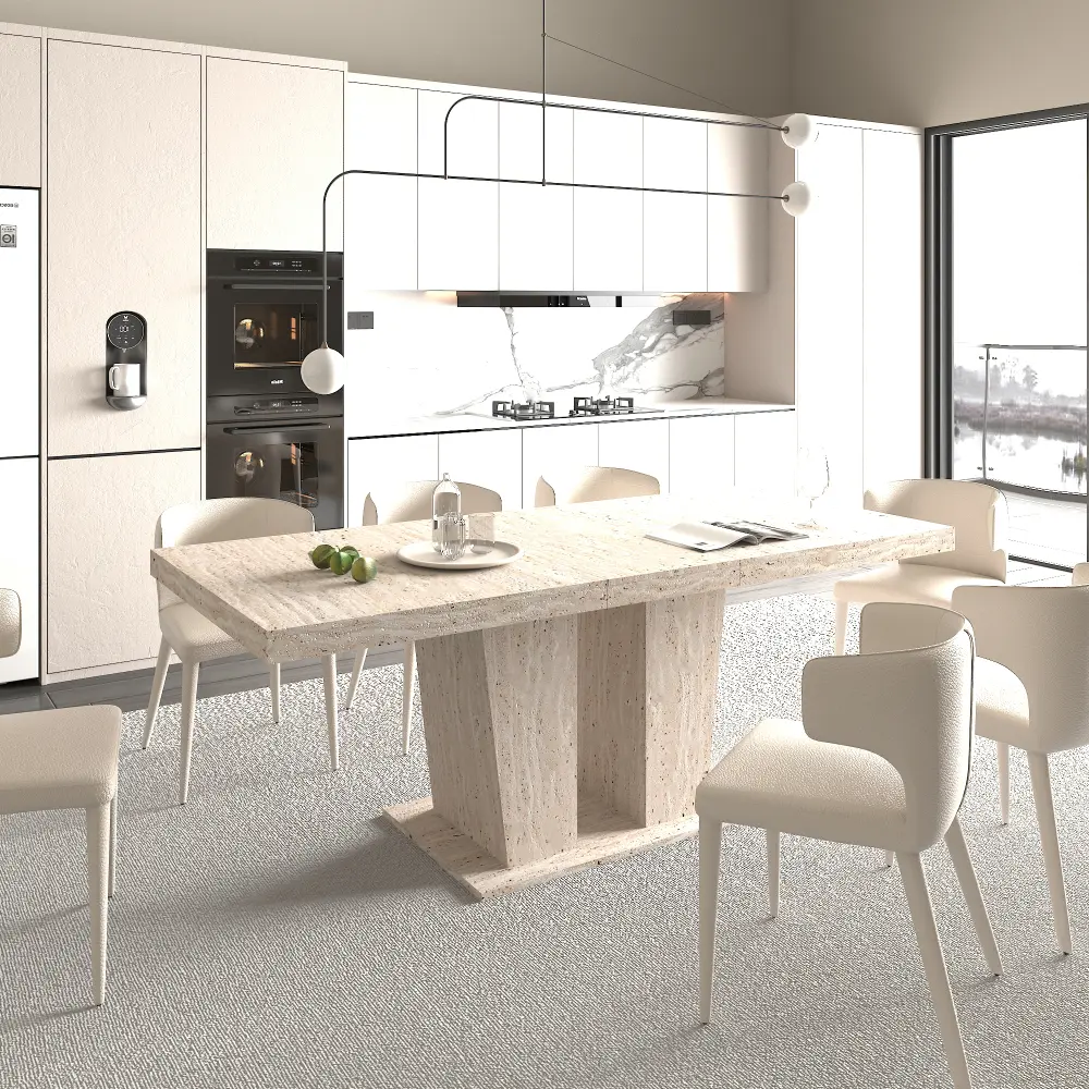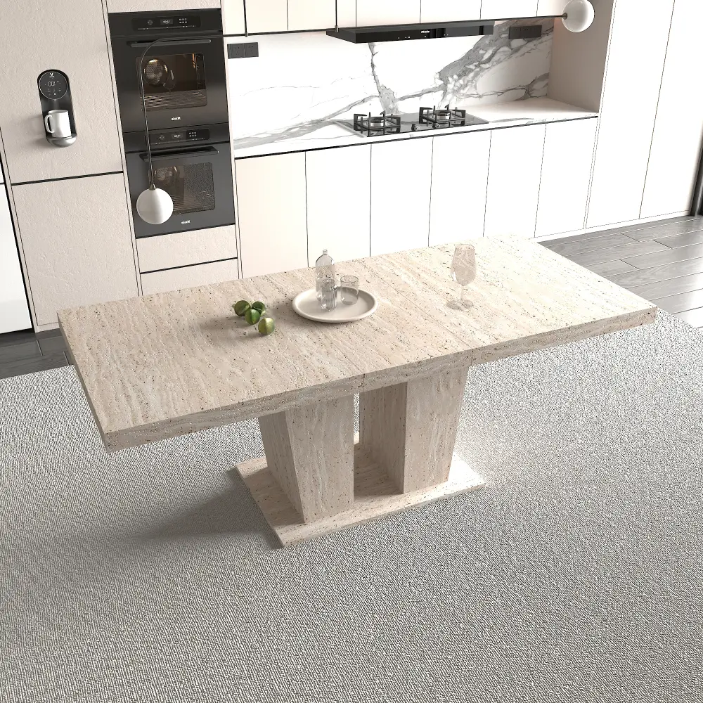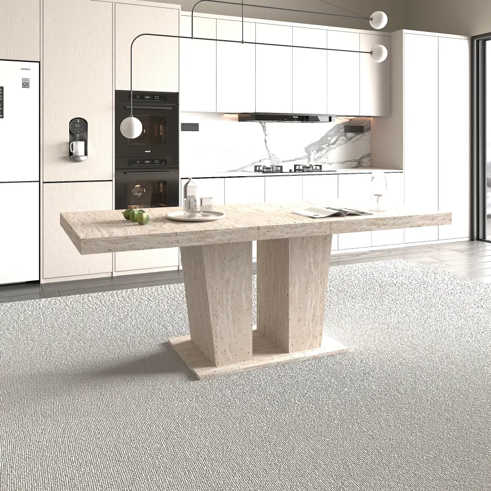 Rectangular extendable dining table with a thick tabletop suitable for 6-10 people. It has a solid and durable wooden appearance and is decorated with travertine texture. It comes in sizes of 160-200 cm and is simple and elegant.