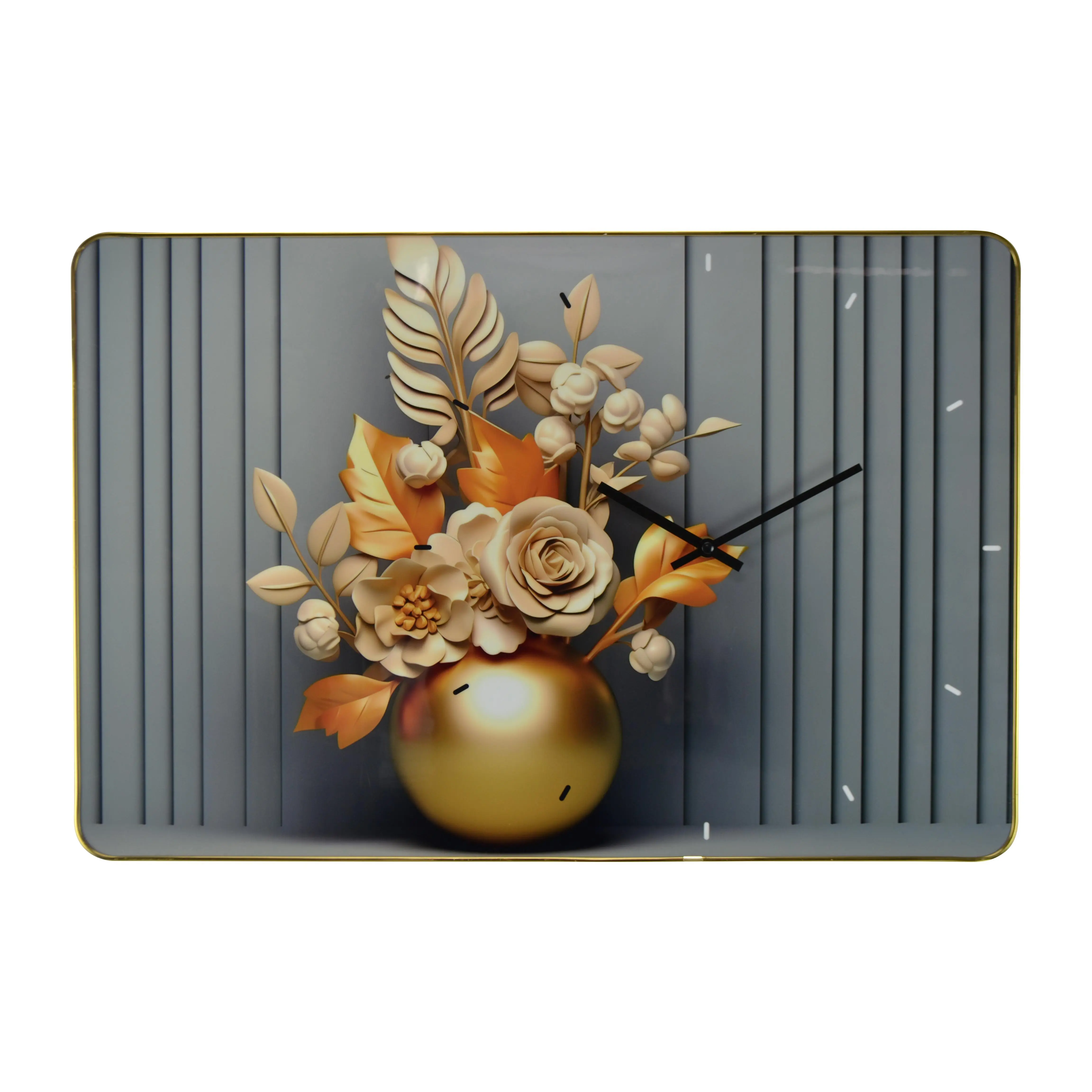 This rectangular Gold and Cream Flowers with a Gold Bowl and Dark Grey Background Wall Clock with glossy finish, is expertly made with meticulous detail and fine craftsmanship. The silent quartz movement wall clock ensures a quiet atmosphere in any room. The large analog clock is a great statement wall art piece or a beautiful gift and fits any modern, industrial, traditional, or rustic style décor. Measures 24"W x 16"H x 1"D and battery operated.