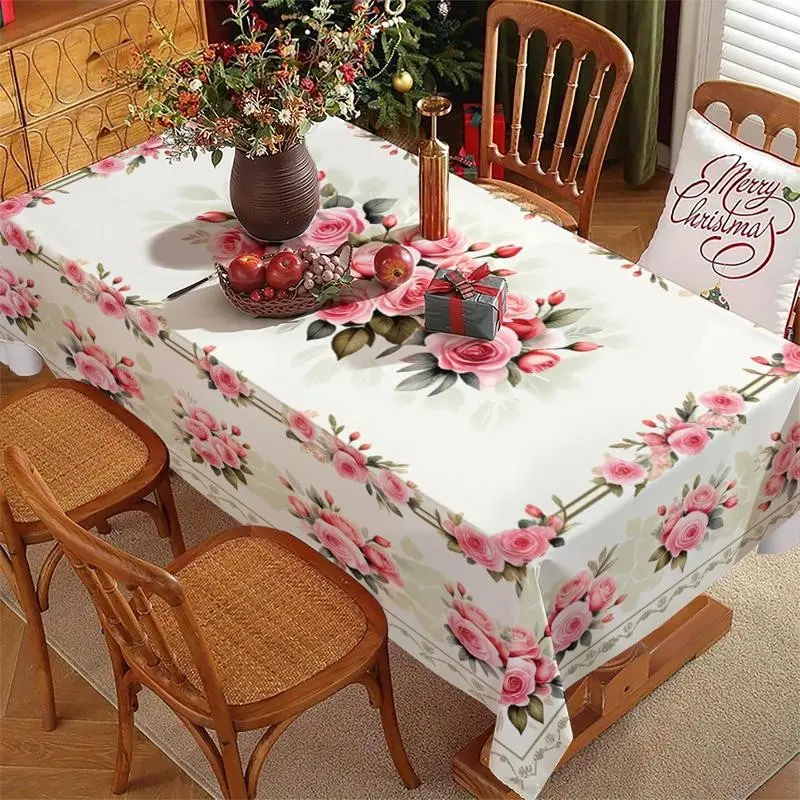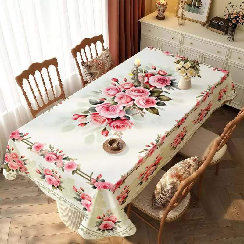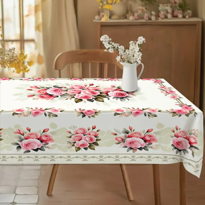 Rectangular Tablecloth with Pink Rose Floral Pattern, Polyester Material, Multiple Specifications Available, Multi - Color, Easy to Clean, Suitable for Daily Use, Festivals, Anniversaries, Warm Dining Area Style, Ideal for Home Decor