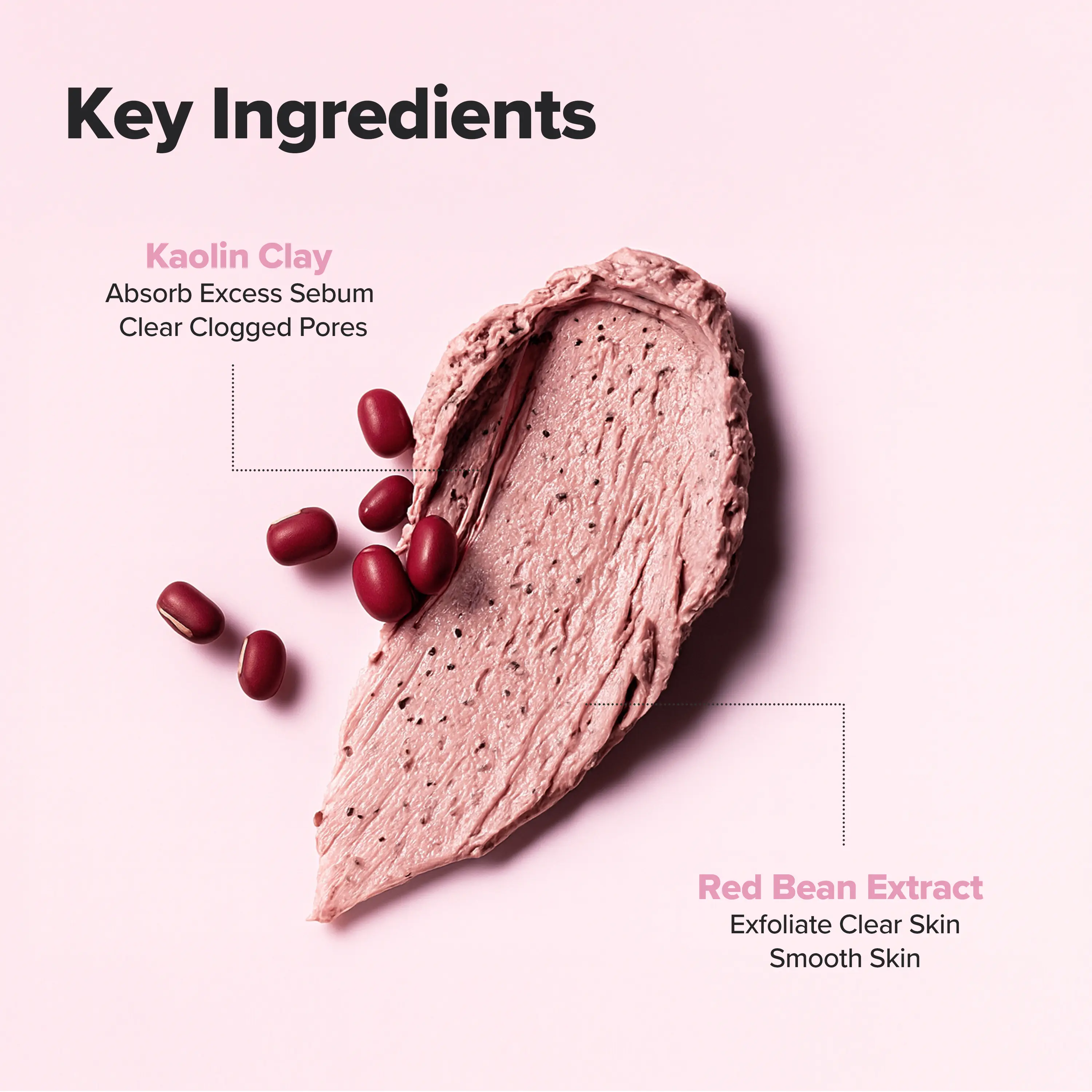 Kaolin is a gentle yet powerful clay that draws out sebum and toxins from the pores. Paired with red bean extract and powder, it helps refine skin texture and keep the complexion smooth and clear.
