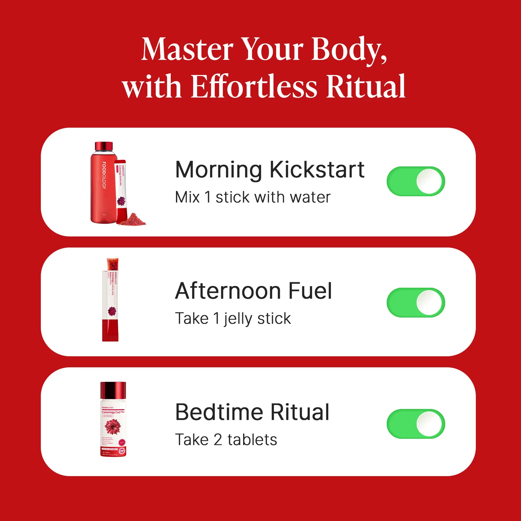 | Ingredients | Water, Fructo-oligosaccharides, Coconut Water, Green Apple Concentrate, Xylitol, Fish Collagen, Locust (carob) bean gum, β-Cyclodextrin, Green Apple Flavor (Artificial), Gotu Kola Leaf Extract Powder, Citric Acid, DL-Malic Acid, Enzymatically Modified Stevia, Sodium Citrate, Carrageenan, Biotin, Vitamin C, Elastin Peptide Extract Powder, Hyaluronic Acid, Milk Concentrate, Dried yeasts, Salmon Roe Extract Powder, Calcium Phosphate, Vitamin E, Ferrous Fumarate, Niacinamide, Zinc Oxide, Vitamin A, Vitamin B5, Vitamin B6, Thiamine Hydrochloride, Vitamin B2, Folic Acid, Biotin, L-Phenylalanine, L-Leucine, L-Lysine Monohydrochloride, Palatinose, L-Isoleucine, L-Histidine, L-Valine, L-Threonine, L-Tryptophan, Glucose Syrup, Acacia (gum arabic), Corn Starch, Vitamin A Acetate, [alpha]-Tocopherols. |