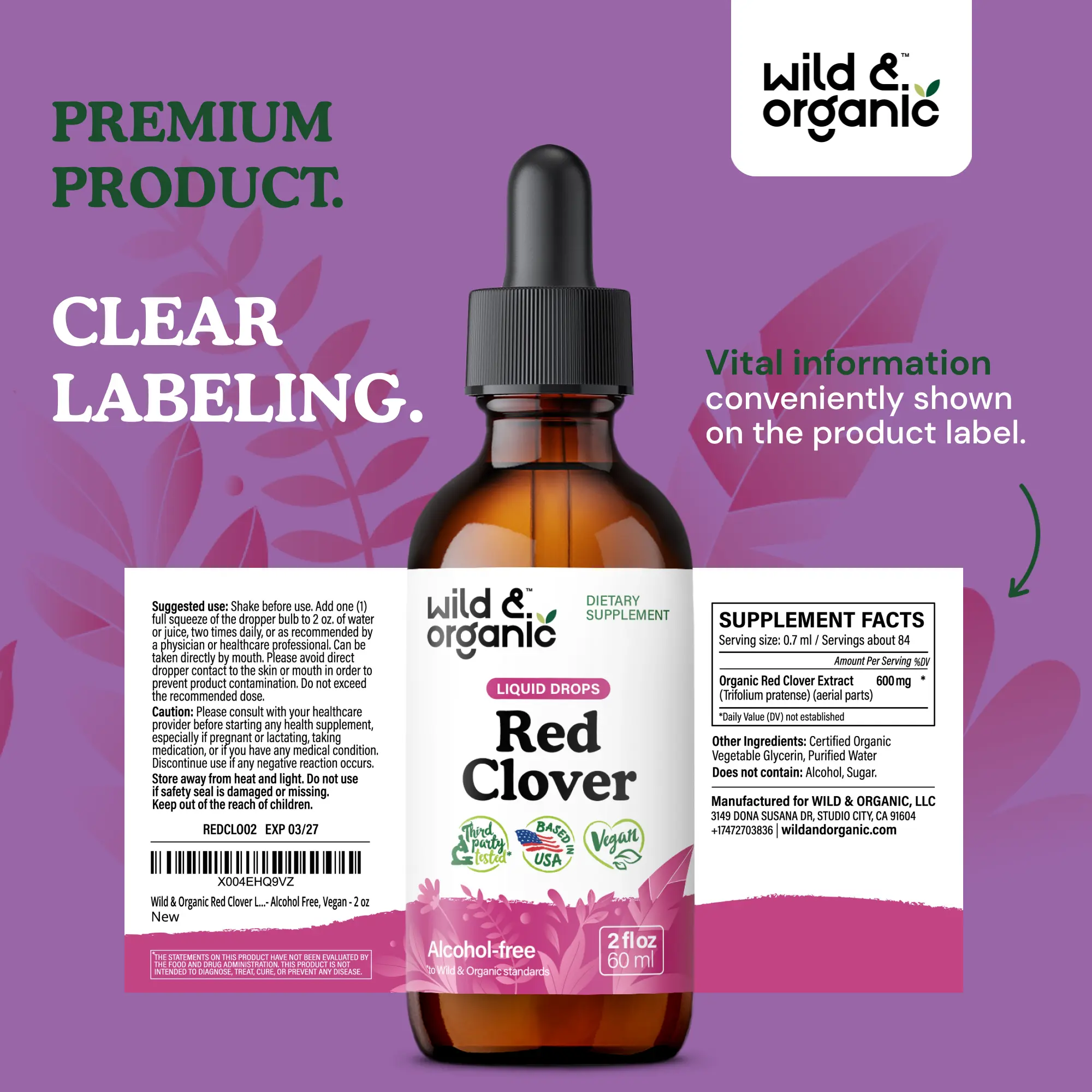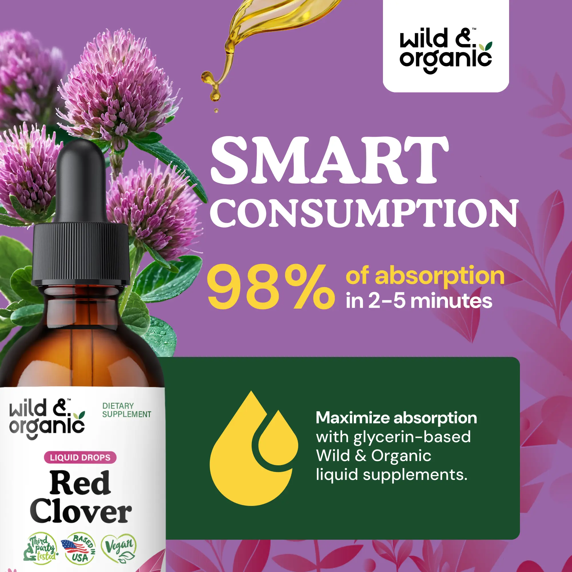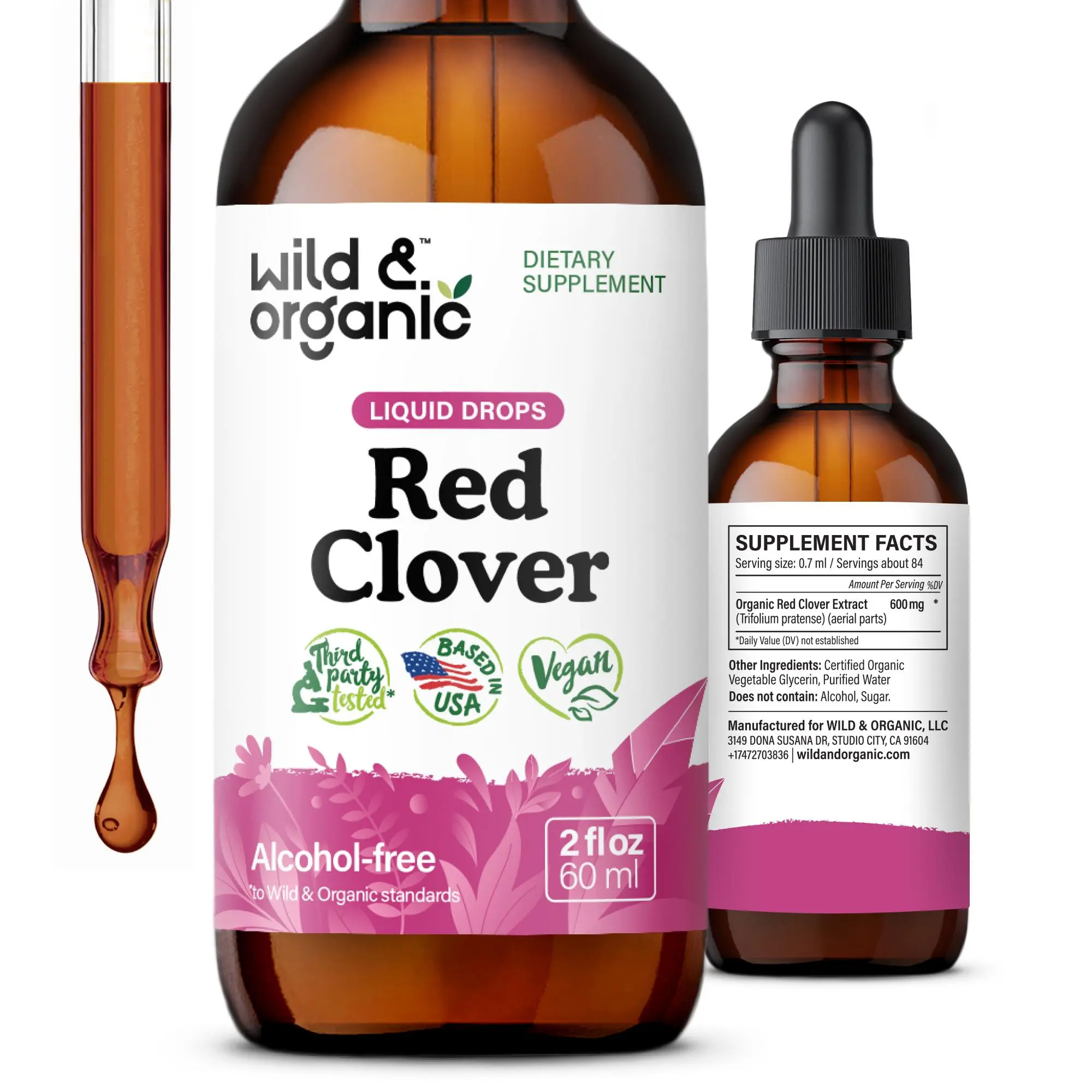 Each serving of Wild & Organic's red clover drops contains 600 mg of red clover extract, supporting women's health. This herbal supplement is perfect for those seeking natural support. The drops are made with vegan ingredients, free from GMOs and artificial additives. Experience the benefits of red clover in a convenient, natural formula.
