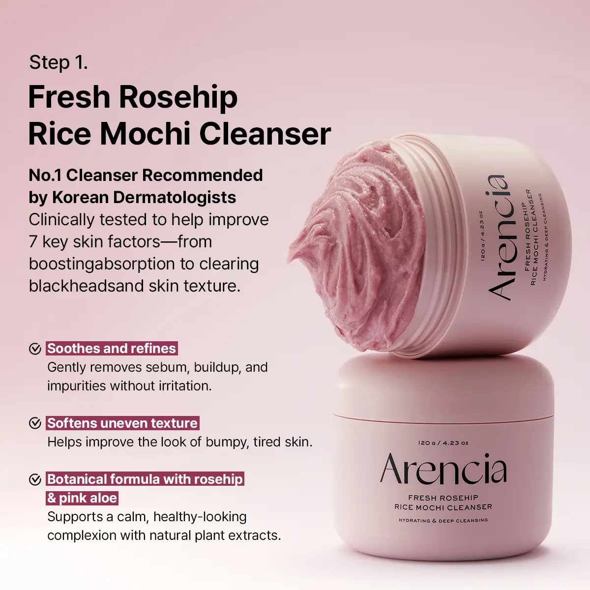 Step 1. Fresh Rosehip Rice Mochi Cleanser (4.23 oz / 120g) 🌹