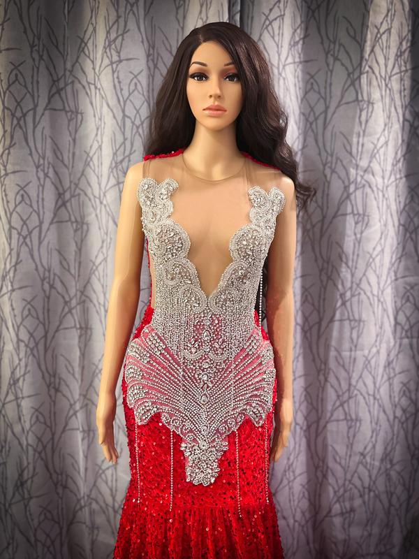Looking for a dress that will make you stand out? This custom-made sleeveless velvet sequin dress is perfect for prom, weddings, homecoming, birthdays, and formal events.Its a US Size 6 dress. It features elegant silver crystal appliqué, designed to sparkle beautifully under evening lighting. The dress is fully lined and available in multiple colors for a flawless, custom fit.