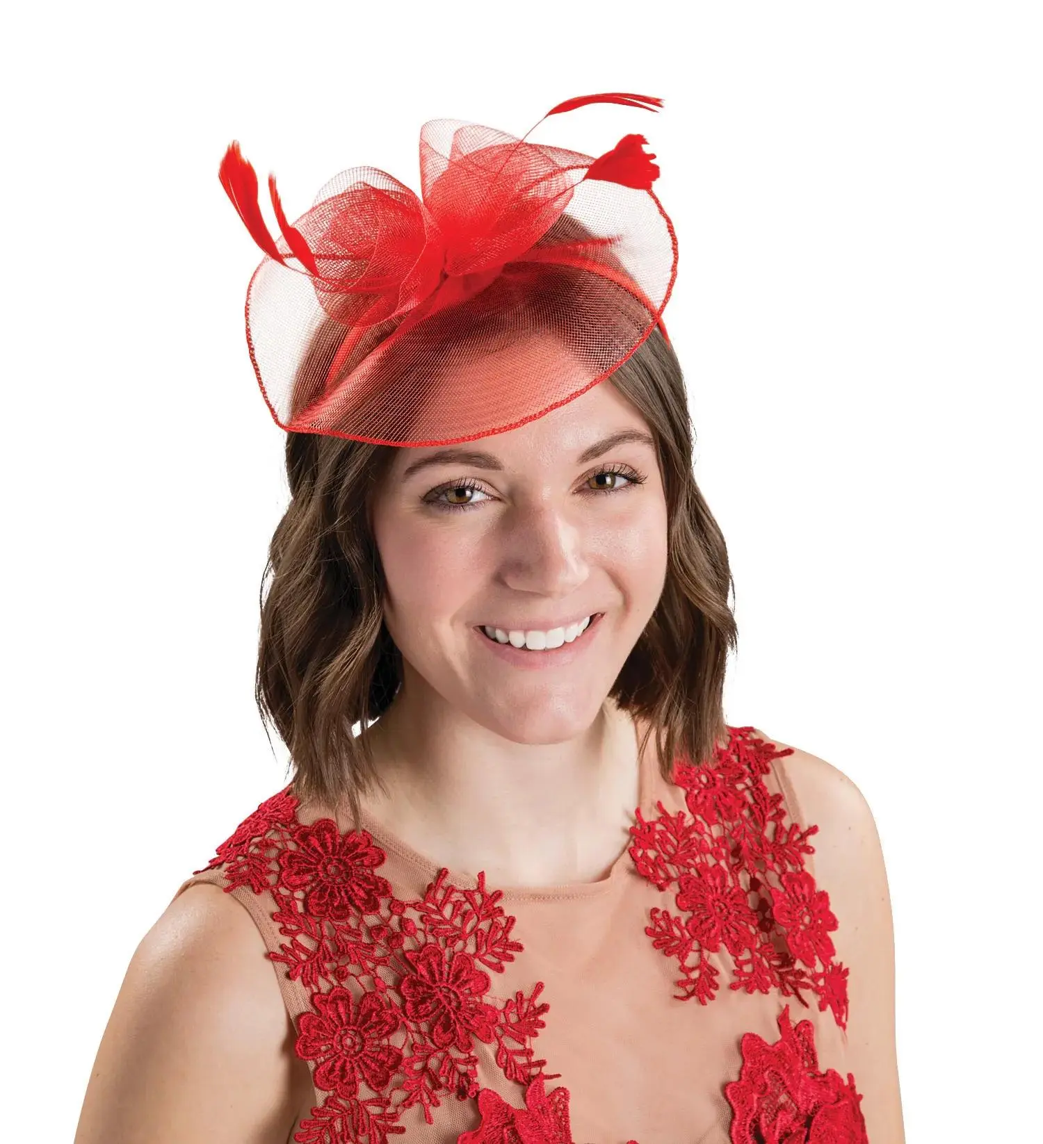 Add some sassy class to your Kentucky Derby look with this red fascinator. Lightweight and cute, it’s a great option for having that “Derby look” atop your head without sporting a cumbersome hat that pokes a passersby in the eye. The rich red color gives this fascinator a flirty feel and makes it perfect for Valentine’s Day parties. Polyester and plastic. 5" x 5 1/2" headband, 8" x 5" topper.